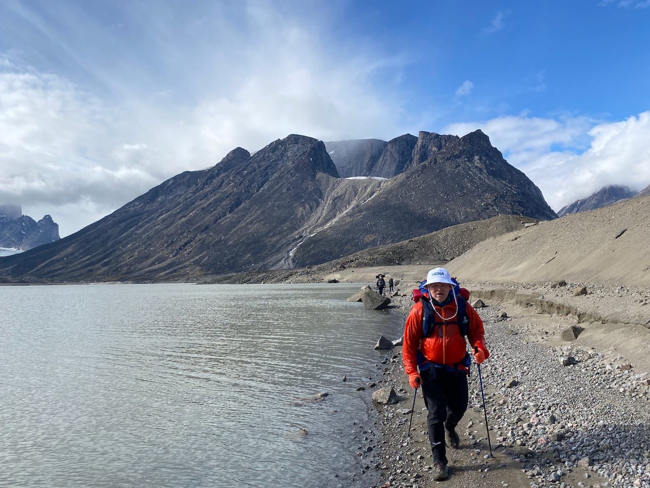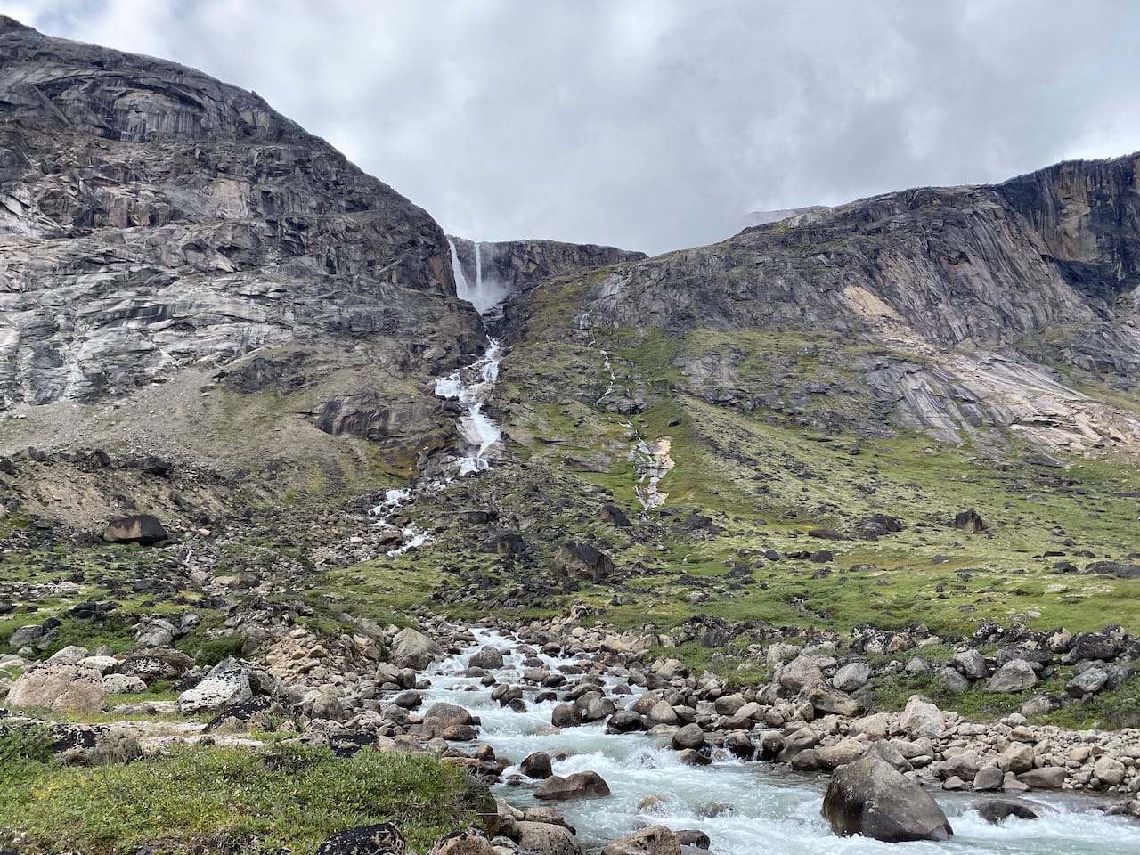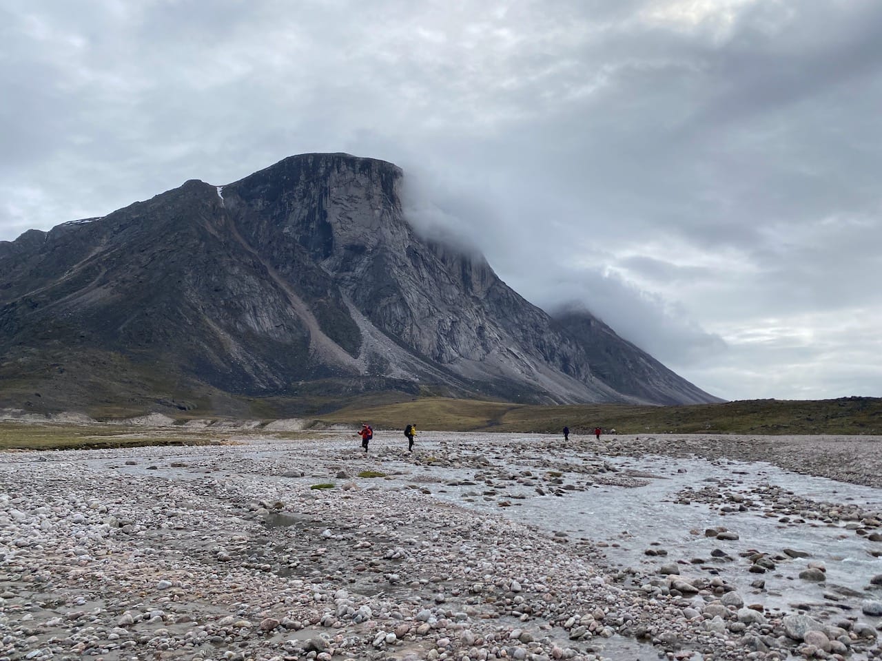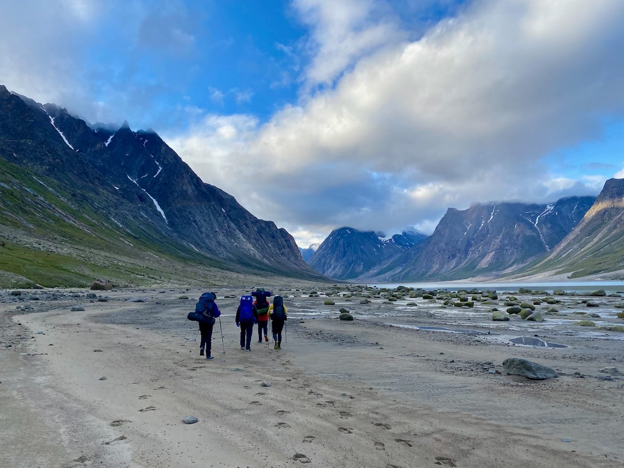 Neil, Dave, and Eli arrived on the afternoon flight, and we all met at the docks. The first journey: a 30-minute boat ride from Pangnirtung to the southern trailhead at Overlord. The boatman, Peter Kilabuk, was the MLA for Pangirtung in the early 2000s and the speaker of the Nunavut legislative assembly. We traveled up the fjord past taller and steeper mountains shrouded in clouds and embraced by waterfalls. The tide was quite low, and we landed a few kilometres south of the official trailhead.