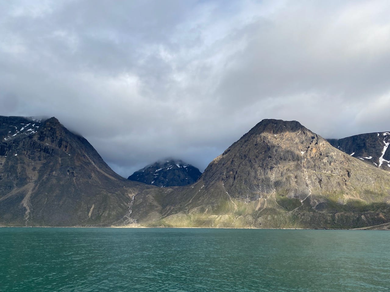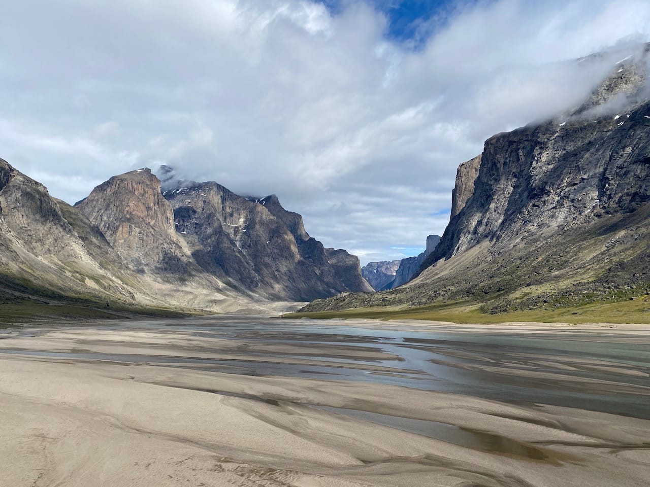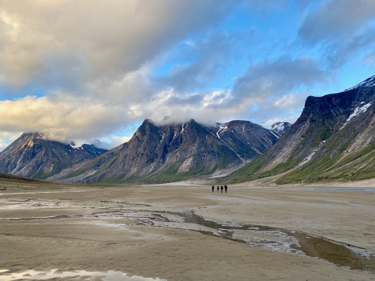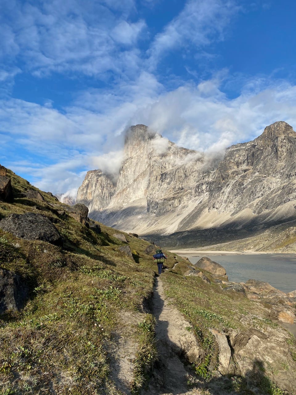 Neil, Dave, and Eli arrived on the afternoon flight, and we all met at the docks. The first journey: a 30-minute boat ride from Pangnirtung to the southern trailhead at Overlord. The boatman, Peter Kilabuk, was the MLA for Pangirtung in the early 2000s and the speaker of the Nunavut legislative assembly. We traveled up the fjord past taller and steeper mountains shrouded in clouds and embraced by waterfalls. The tide was quite low, and we landed a few kilometres south of the official trailhead.