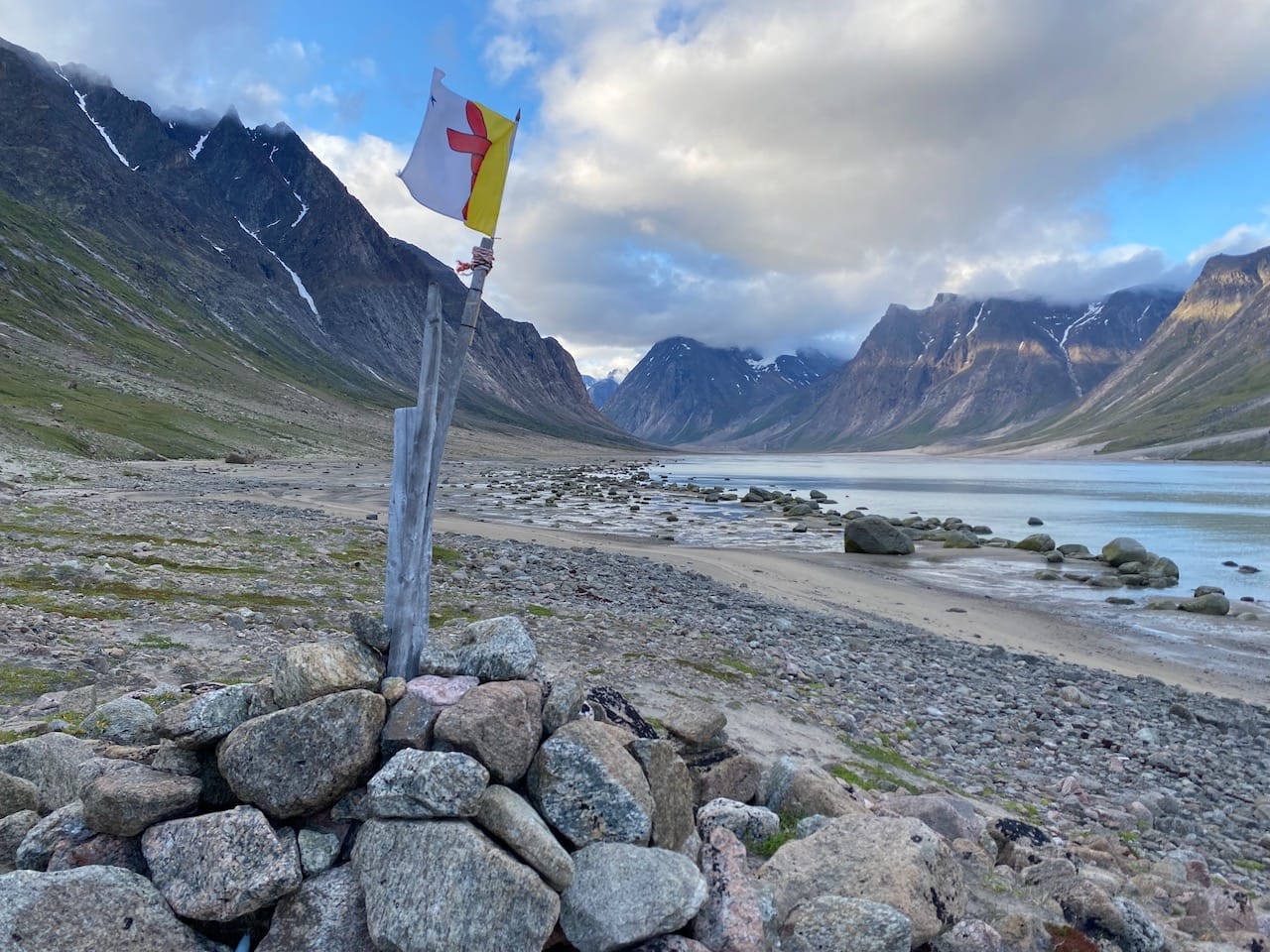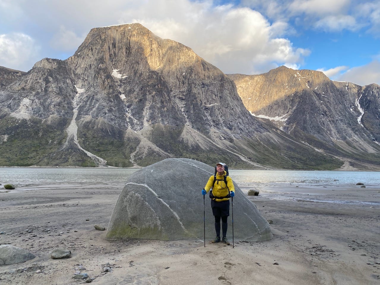 The five of us headed north along the west side of the fjord, getting used to our heavy packs. We soon reached the “official” Overlord West trailhead at kilometre 98, marked by a cairn and a Nunavut flag. It was 9:30pm, but it was still bright and sunny out.