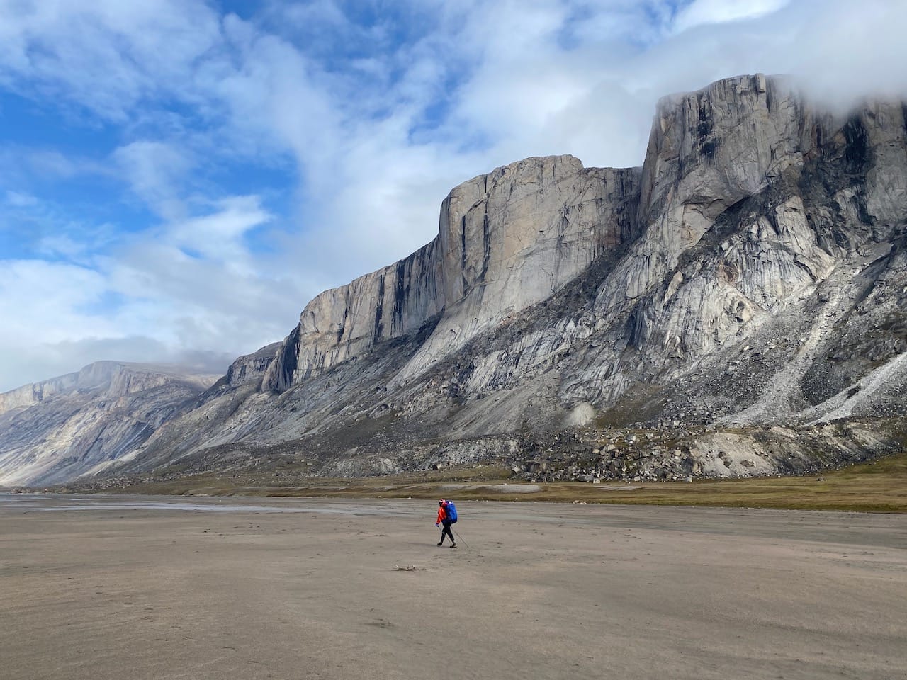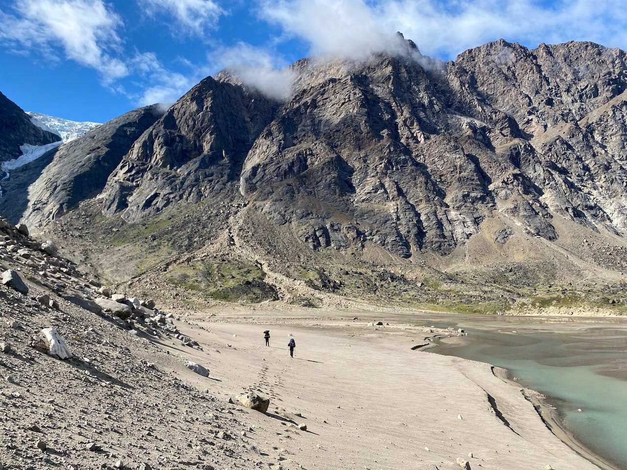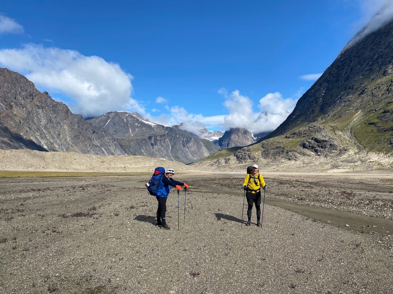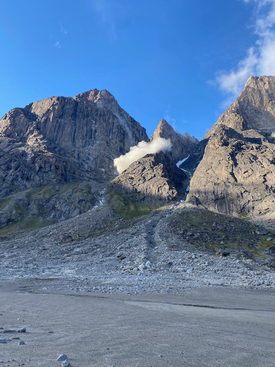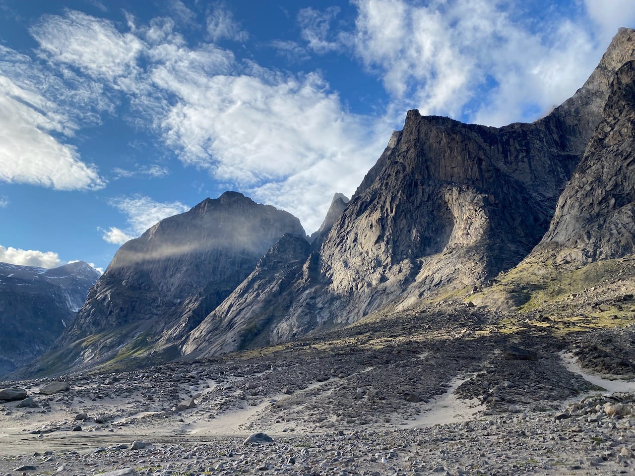 The next day, we woke up to fierce winds collapsing our tents. The area is known for these sorts of gales, but so far we’d mostly avoided them. It was difficult to stand upright, and wind blew sand everywhere. At one point I almost lost my jacket and had to sprint after it. Luckily, things calmed down after a few hours. We continued up the valley past many mini-Thors, looking back at Mount Asgard until it, too, disappeared behind a corner.