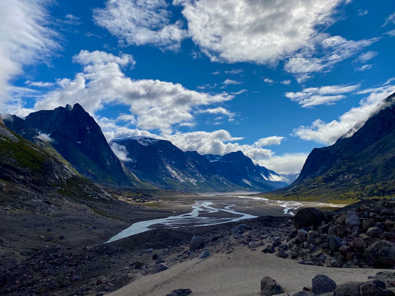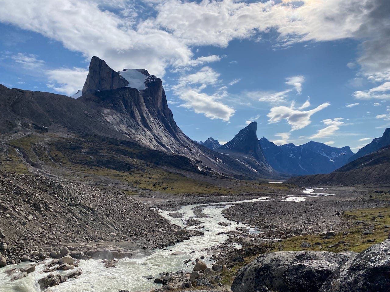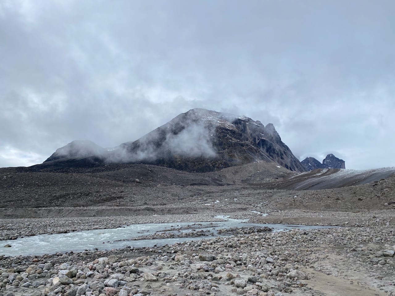 Eventually we reached a rocky valley, an outlet of Glacier Lake which dried out in the 1950s. Below the rocks flowed the waters of the Owl River. As we rested, the clouds cleared, and we finally saw Mount Asgard to the west.