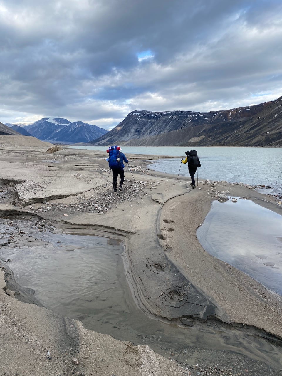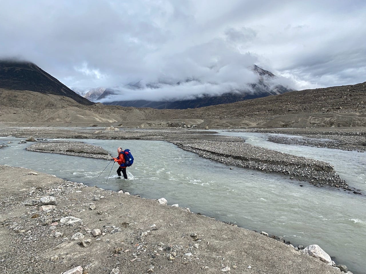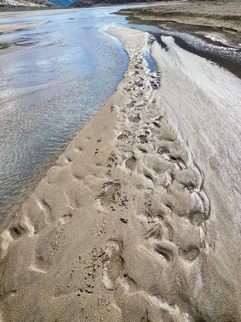 A lot of the next few kilometres were spent on the banks of the river, where solid river sediment was the most durable surface, except when it wasn’t… Most of the surface was solid, but every hour or so we’d reach a section of quicksand and sink into the sand. We got in the habit of testing the sand with our hiking poles to keep safe, which allowed us to avoid most - but not all - quicksand.