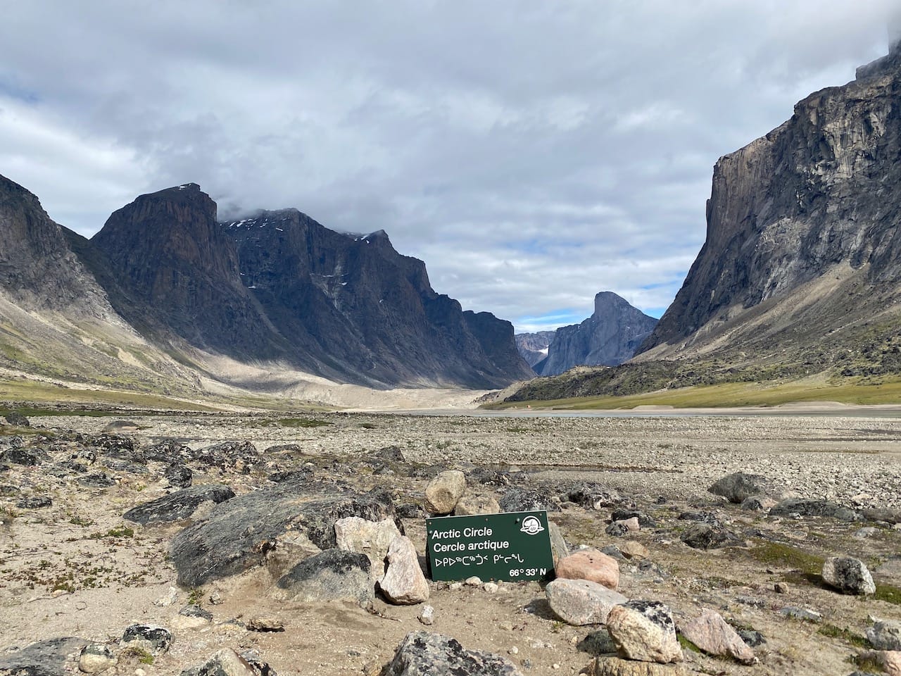 Eventually we made our way down the moraine. In a few kilometres we crossed the Arctic Circle, marked by a sign. In the distance, Mount Thor was framed by the valley walls. It felt like we’d crossed a milestone. Interestingly, there is another broken Arctic Circle marker a few hundred metres north.