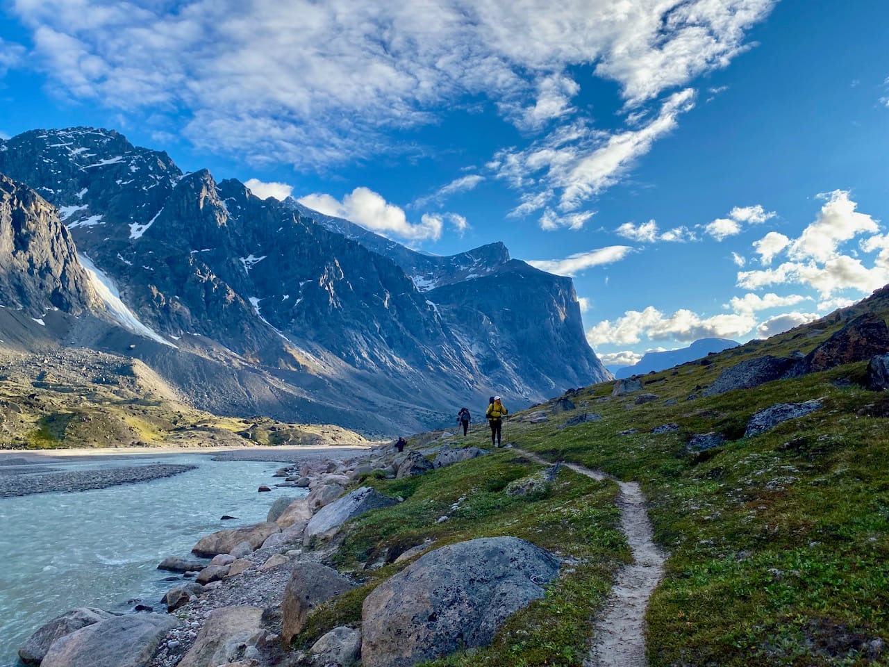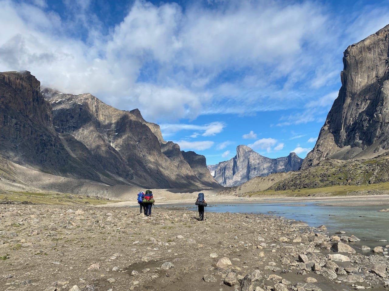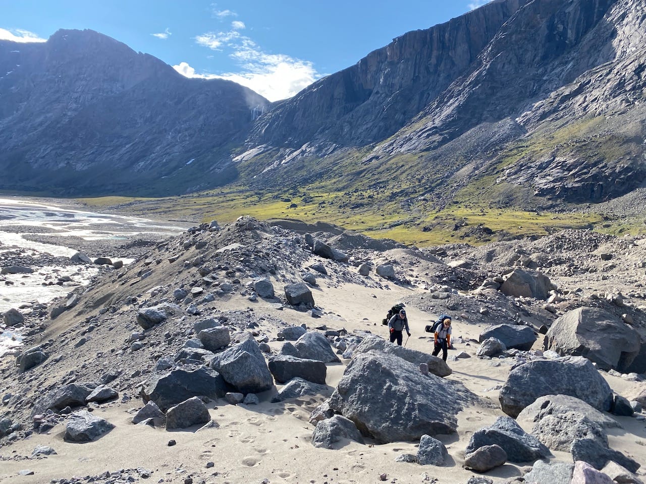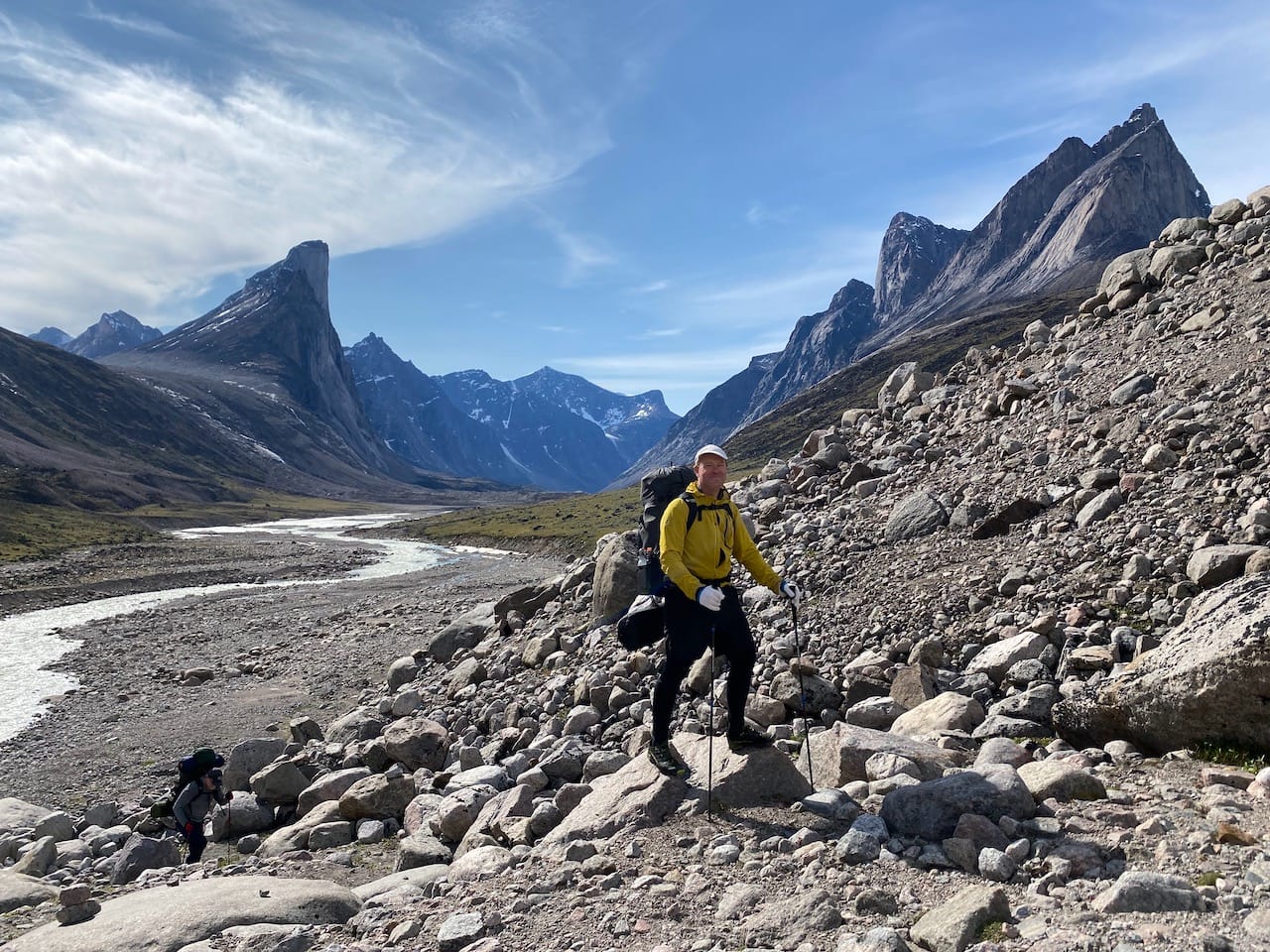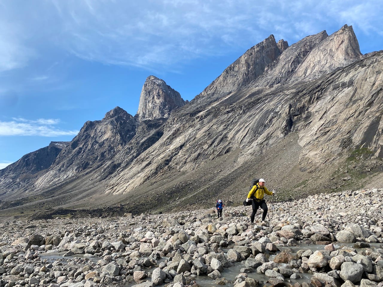 The Akshayuk Pass traverse spans almost 100 kilometres of breathtaking Arctic scenery on Baffin Island, Nunavut. It follows a traditional Inuit route between the communities of Pangnirtung and Qikiqtarjuaq, through a glacier-carved valley in the shadow of massive granite walls. Mount Thor, the world’s largest vertical drop, rises 1200m above the valley. Another highlight was Mount Asgard, two 1000m granite pillars, as seen in the James Bond movie “The Spy Who Loved Me”. Hundreds of metres above the valley, hanging glaciers - the edges of the mighty Penny Ice Cap - give way to moraines and fast-flowing creeks.