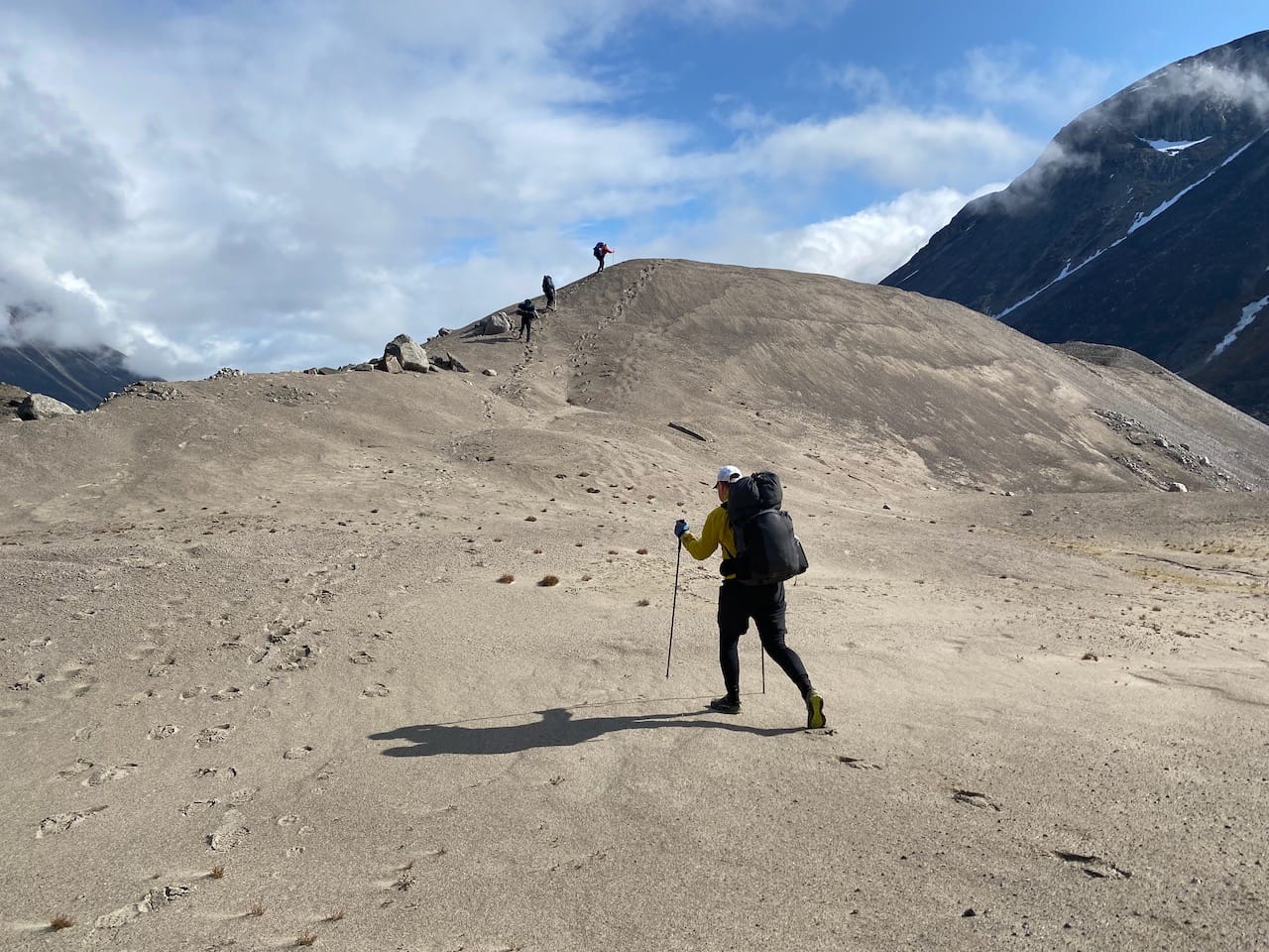 Around kilometre 88, we ascended the first of many terminal moraines, ice-cored ridges of gravel left behind by retreating glaciers. These moraines were usually around 100 metres high and presented the only significant elevation gain of the trip. We looked from the moraines to the now much-diminished glaciers that spawned them and contemplated the changes that have occurred here.
