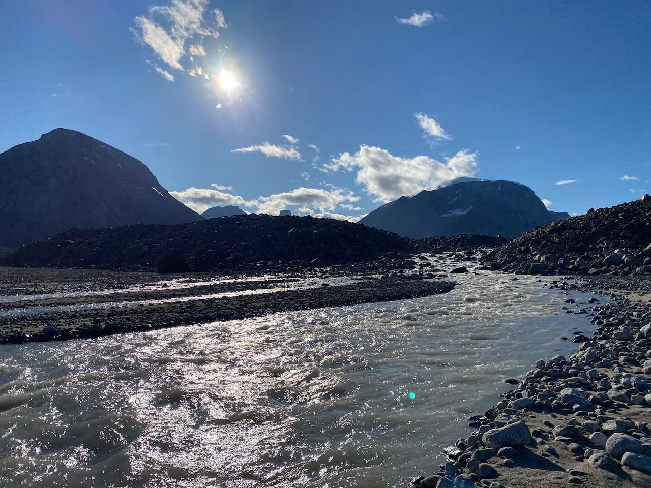 At the shelter, we met two hikers from Iqaluit and Alberta who gave us lots of helpful information about the trail. In particular, they warned us about the river crossing at the outflow of the Highway Glacier. We had dinner around 11pm, set up camp, and finally fell asleep around midnight. It was still bright outside.