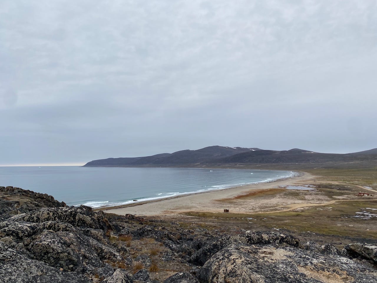 Polar bears are found around beaches, so we did not want to linger. We continued along the beach, underneath massive granite cliffs, and eventually saw the shelter behind a boulder.