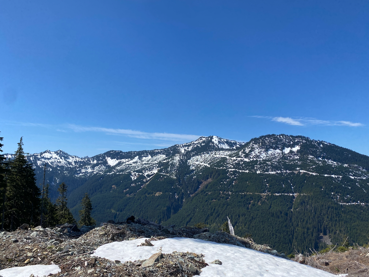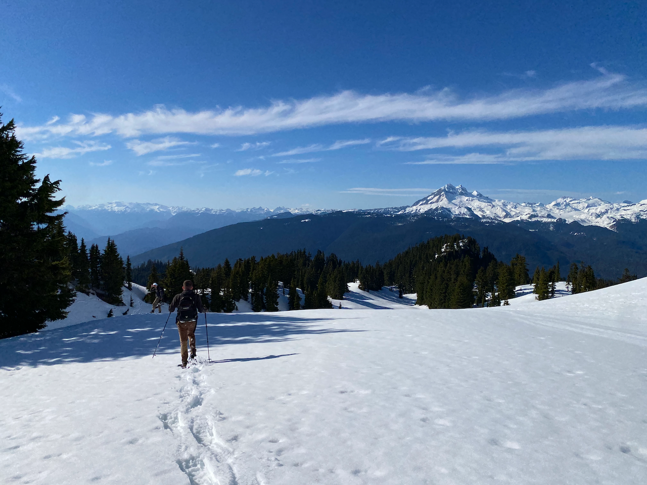 We put snowshoes on and plodded up the spur road for a while. There are many side branches, and a GPS or annotated map would be very useful here to avoid wrong turns. Good views of the surrounding mountains, especially Garibaldi, could be found through the clearcuts. Along the way, we were treated to some songs from Michal's hiking playlist, including a Bavarian marching song, which definitely inspired us to walk faster!