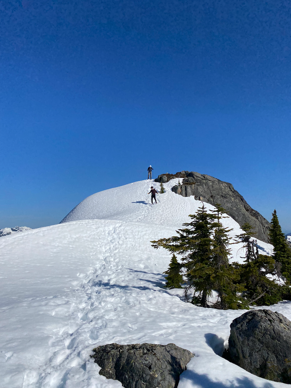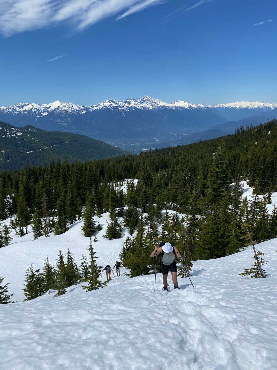 To avoid losing elevation, we traversed west of the false summit, then climbed up toward the real peak, sticking close to the treeline. This ascent, especially the last 50 vertical metres, involved several longer sections of steep snow and was more difficult than we had anticipated. One of our group took a break in a sheltered area while the rest of us pushed on.