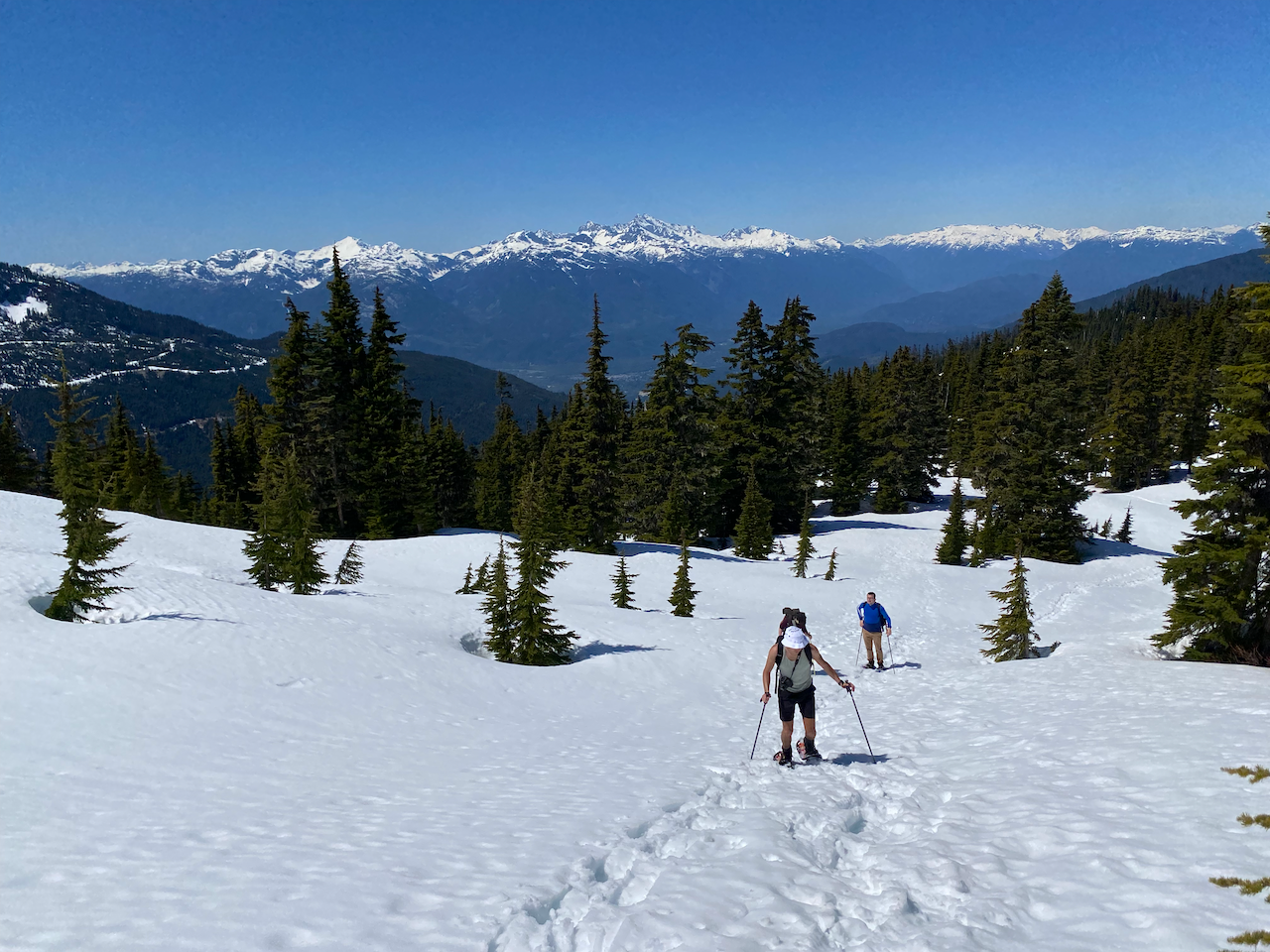 After savouring the summit views, it was time to descend. We retrieved our friend and retraced our steps down the slope, glissading at times. The slog back through the steeper area was made more difficult by the softened snow. At this point, we were getting somewhat exhausted, and snowshoers were compared to Soviet prisoners fleeing the gulag and Finnish soldiers in the Winter War. In retrospect, a shorter adventure would have been a good idea. We took a long break at the plateau above the road to catch our breath, then plodded back to the car, with some people singing to pass the time.