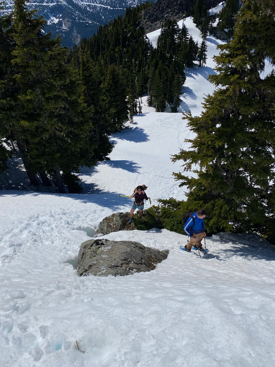After admiring the views, we switchbacked through the trees to reach a wide valley, which gradually took us to slopes below the false summit.