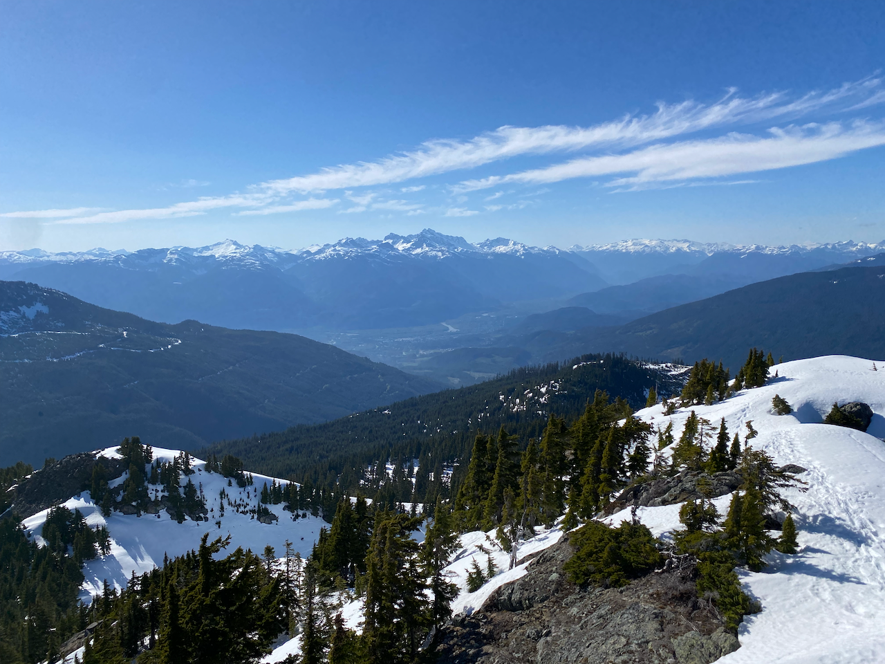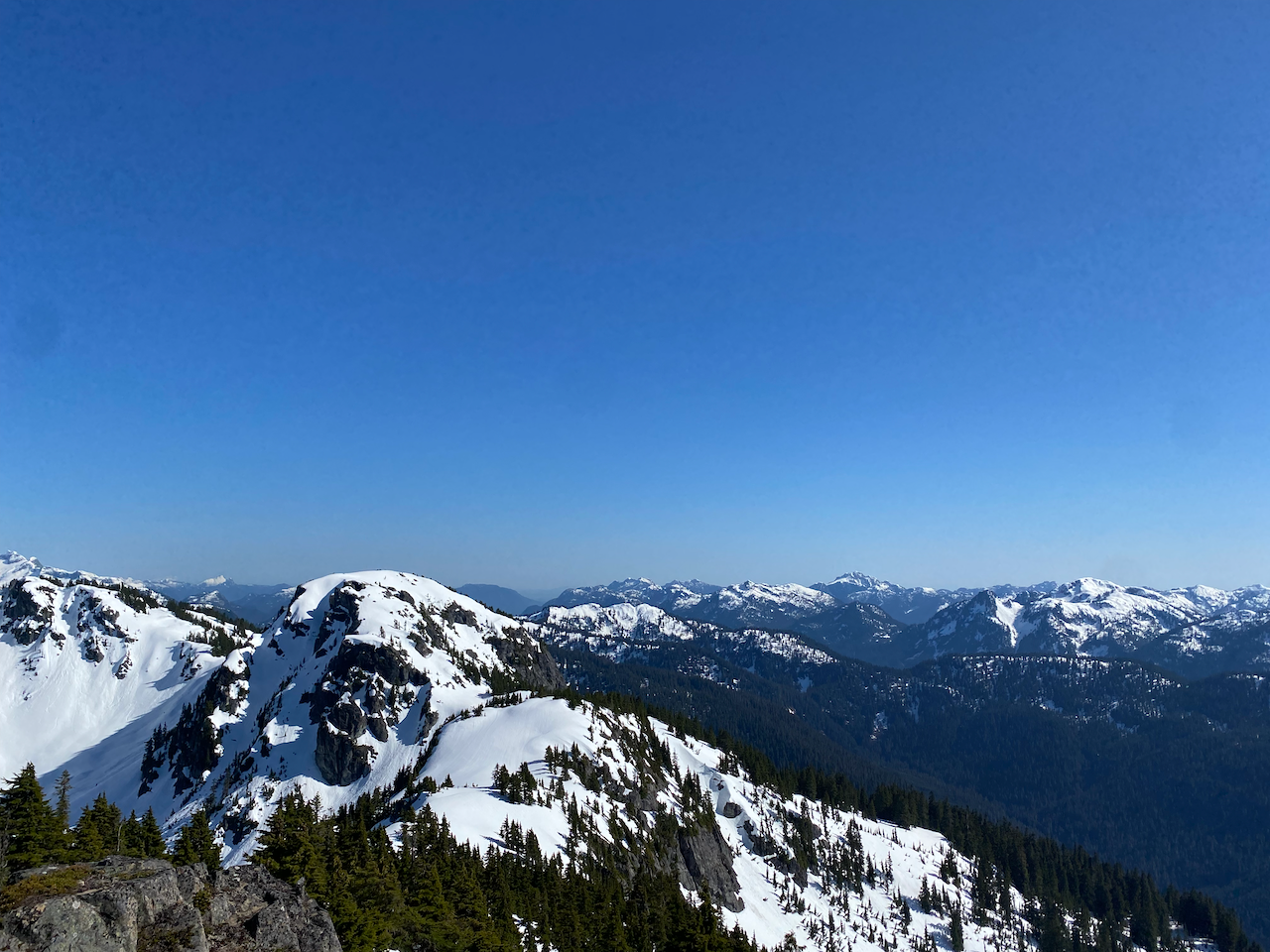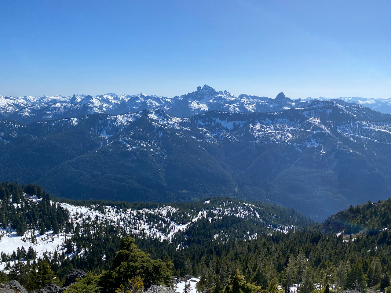 Most groups approach the summit from the south, but we zigzagged up the western side, a class 2/3 scramble. Once on top, we enjoyed the incredible views on this bluebird day. Garibaldi and Mamquam loomed on the horizon. To the south, we had front row seats to Sky Pilot, with some obscure North Shore Mountains behind it. Across the Mamquam River Valley, we could see Sedgwick and the entire Tantalus Range.