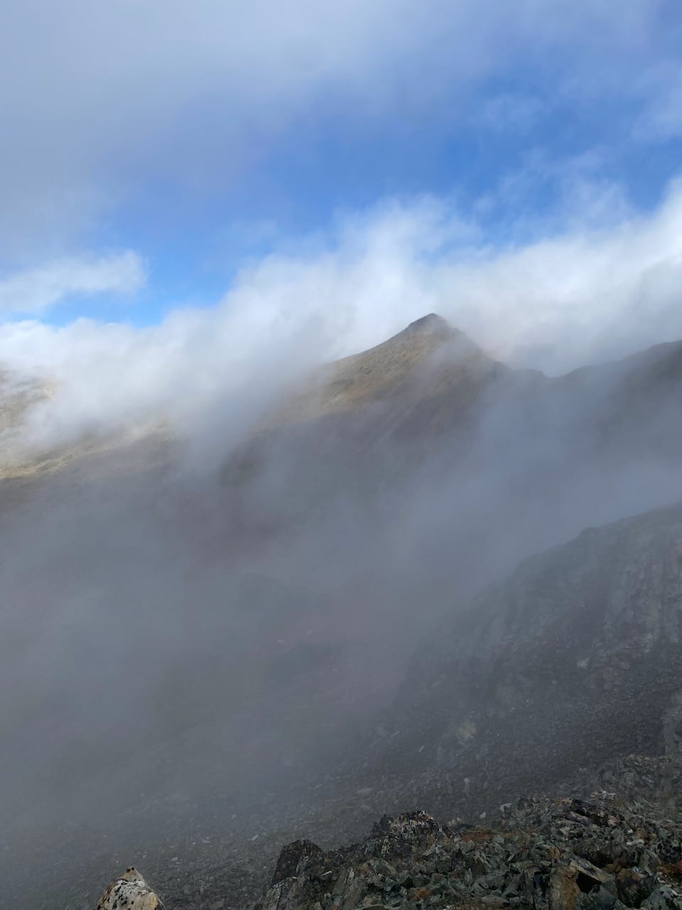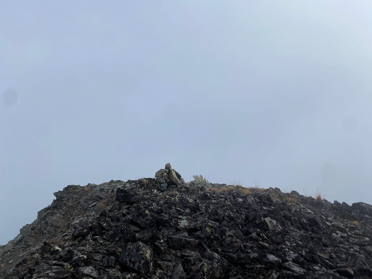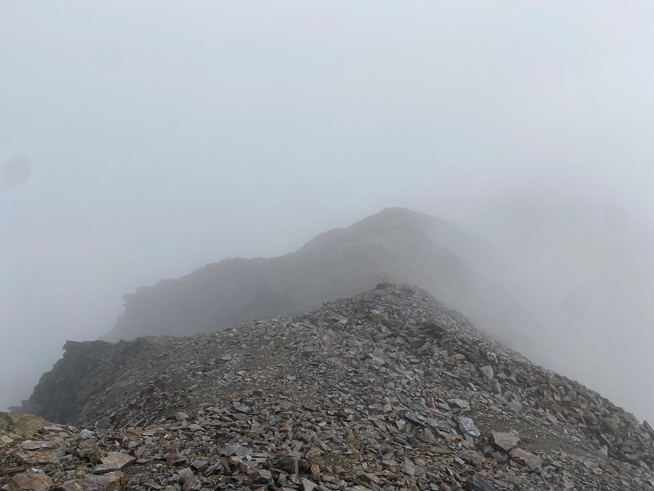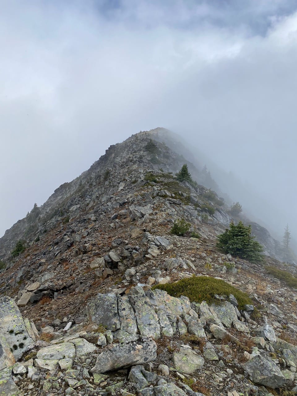 The weather cleared up for a while, but clouds immediately rolled in as I left camp. By the time I reached the summit of “Billy Peak”, nothing could be seen through the fog. I was hoping the weather would clear, so I continued. This part of the ridge was mostly easy walking, with some steep sections and scree descents, but nothing exceeded class 2.
