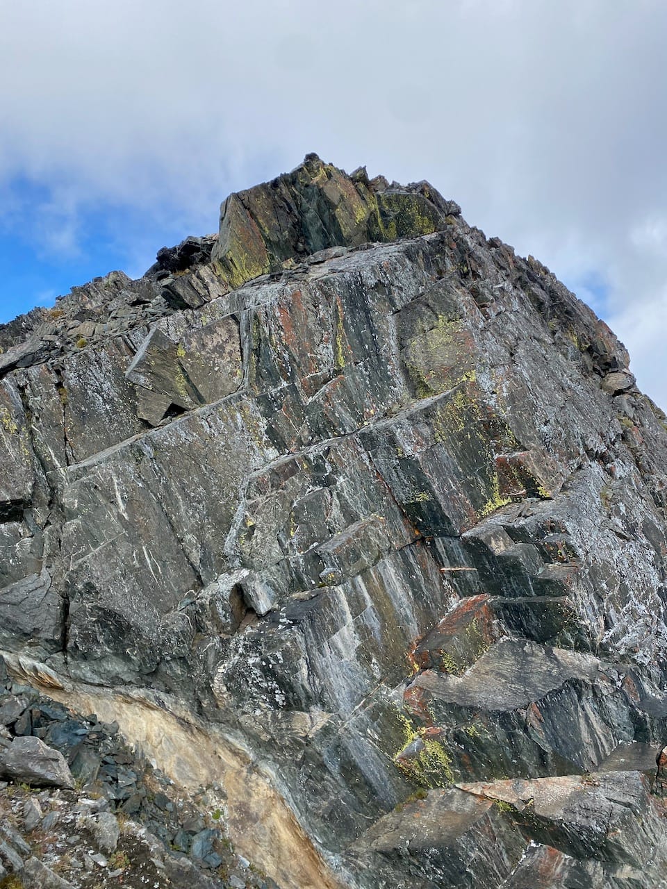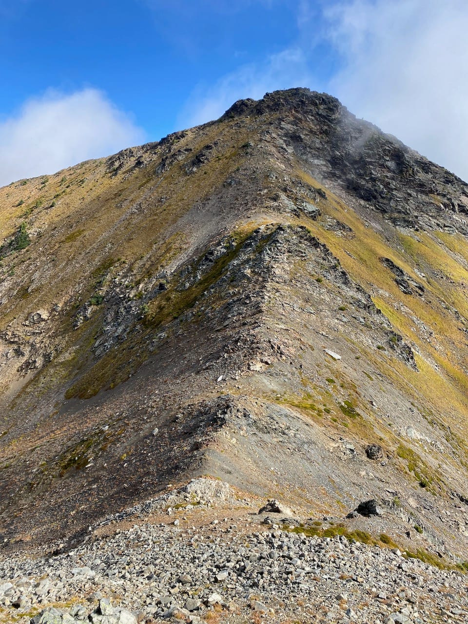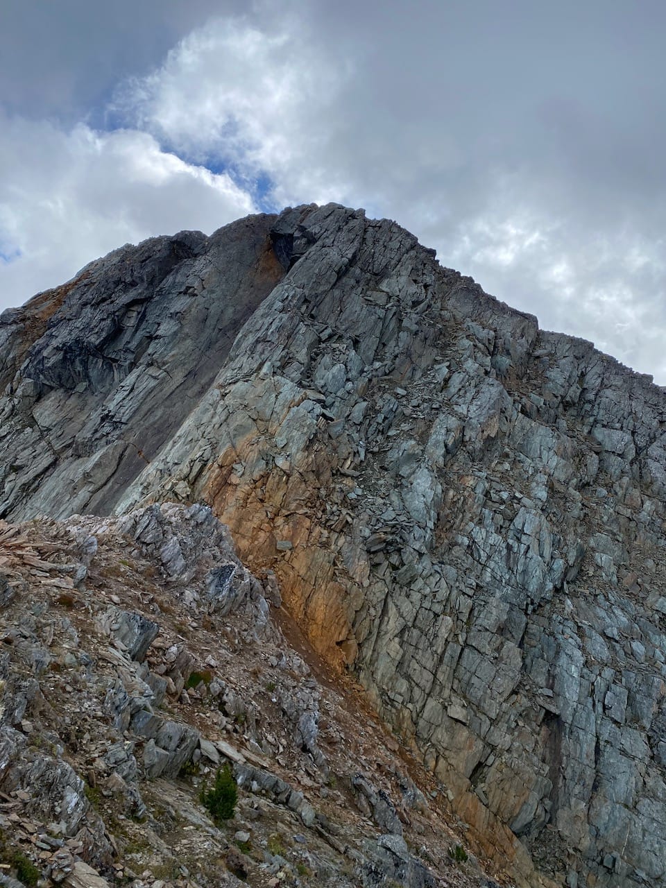 The cruxes of the day were the scrambling sections when getting off the summit. I was nervous about this section, especially since I didn't climb up here, but it turned out better than expected. There was a short section along the ridge that was somewhat exposed, but not difficult to traverse. The second, more extensive scramble involved a steep slope with several class 3 descent options, then a short traverse across a gully, but both were manageable. After getting past the scramble, I turned around; the slope I’d descended looks like a sheer cliff from this angle, much scarier than it actually is.