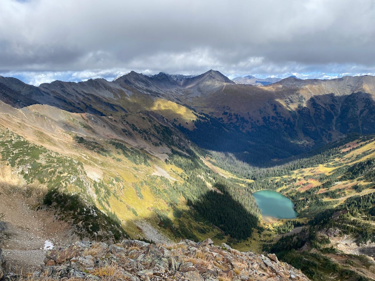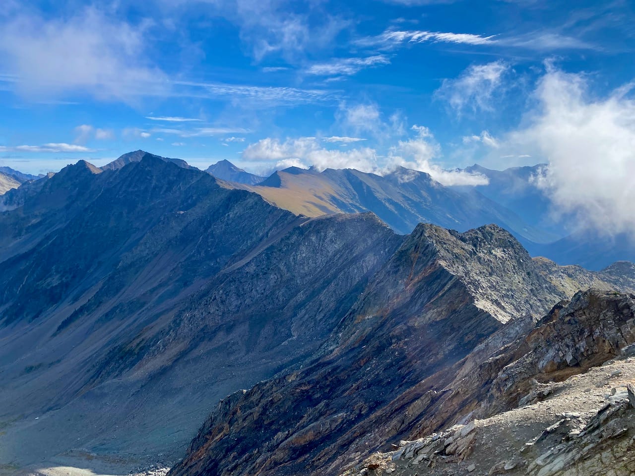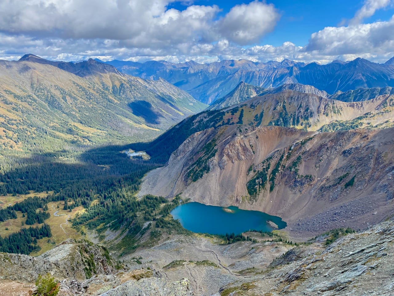 My last destination was Crystal Peak, to the west of the lake, which is listed in the Scrambles guide. The pointy-looking peak west of Elliot is actually a subpeak; the true summit is less intimidating. Crystal was a straightforward class 2 ascent on talus, marked by the occasional cairn. The summit had great views, including an interesting perspective on the Lost Creek valley that was hidden from view from the rest of the peaks on this trip. The west side of the Twin Lakes-Downton ridge looked quite steep and imposing. There is a small pinnacle a few metres away which might be the true summit, accessed by an exposed but relatively wide ridge.