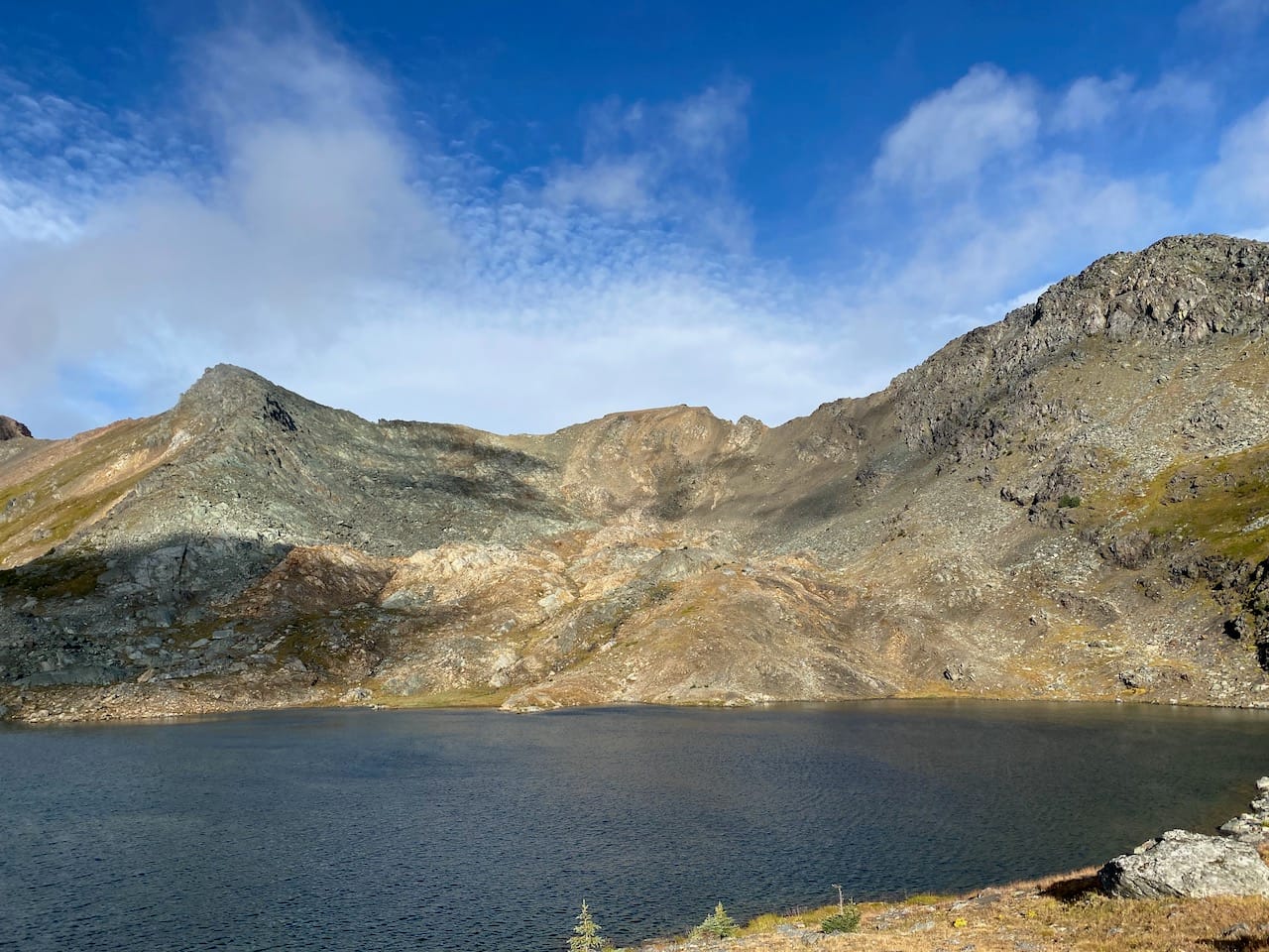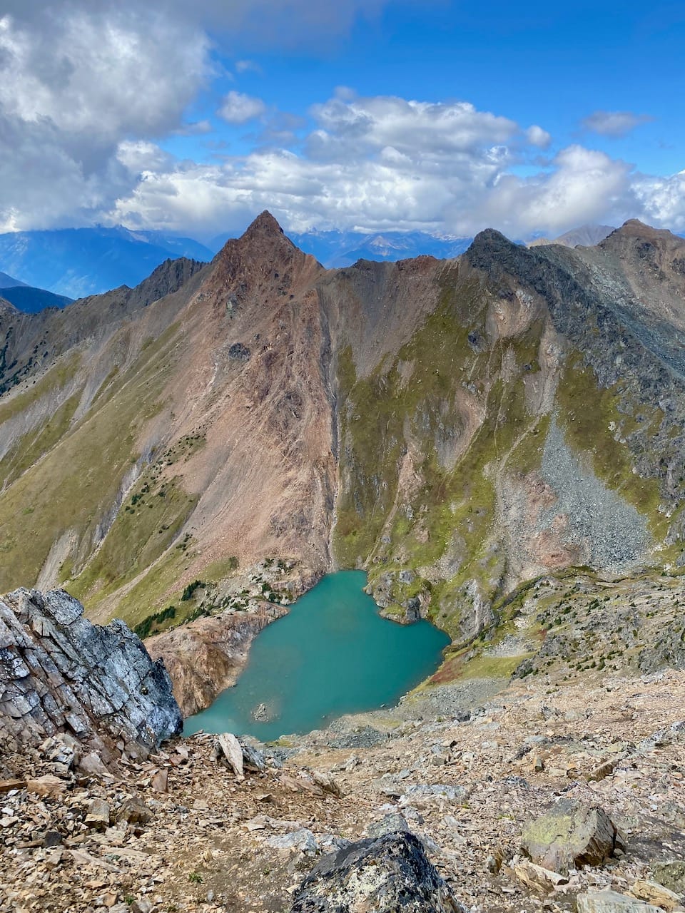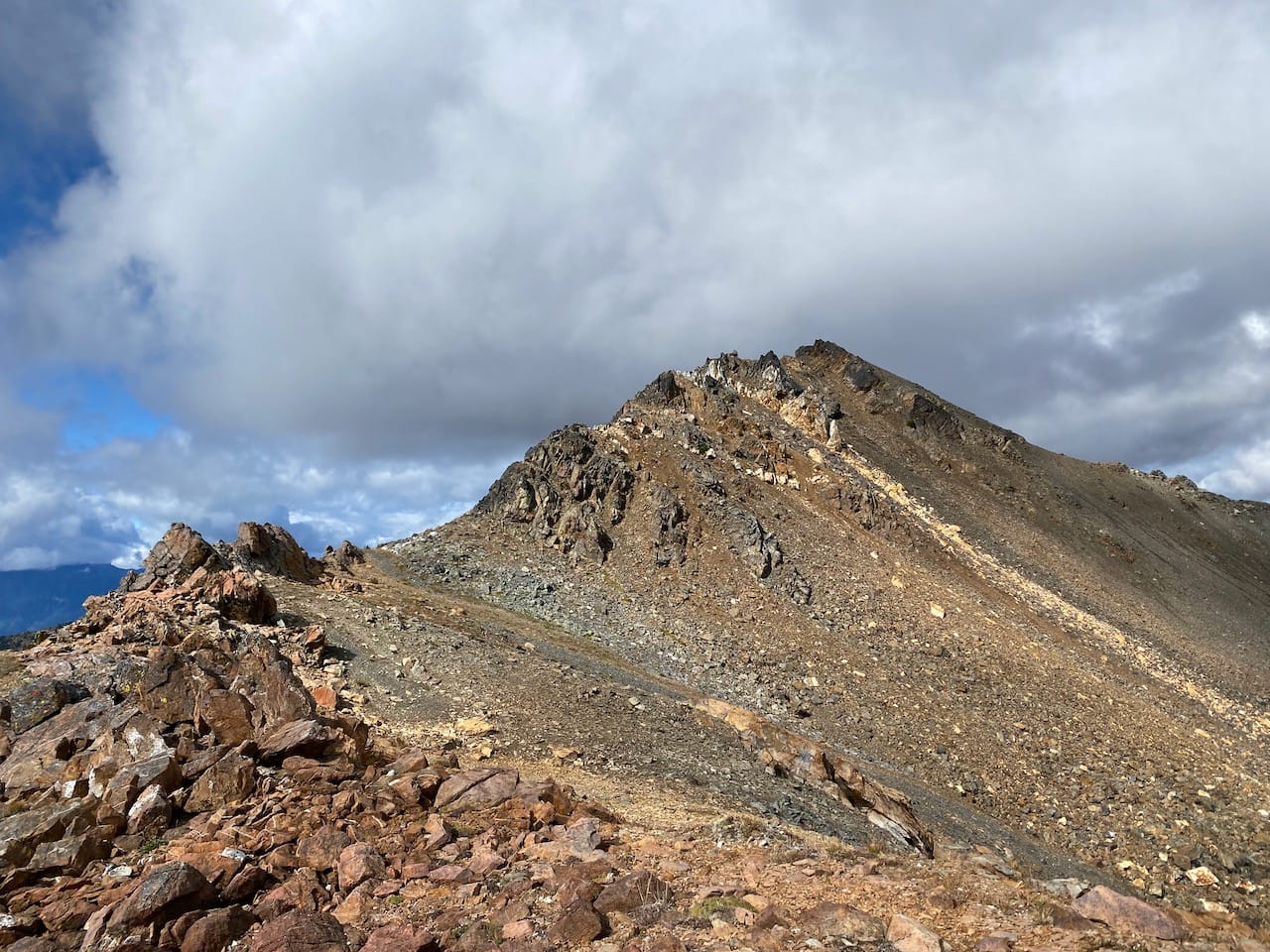 There are two peaks between the col and Elliot Peak, marked as “Peak 2380” and “Peak 2394” on Peakbagger. Each one has a glacial cirque to its north with a beautiful glacial lake within. Peak 2380 was a walk up but Peak 2394 had some easy class 3 scrambling along a broken ridge, which could probably be bypassed.