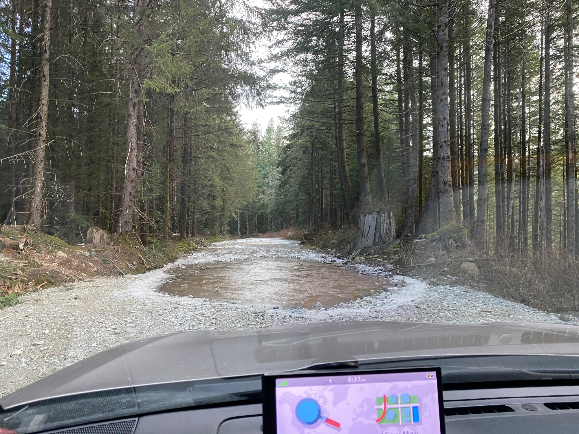 Paul and I met up downtown and drove east, then north, passing through the small farming community of Durieu before venturing onto the Lost Creek FSR. In total we’d be on logging roads for almost an hour. From the start, the road was a bit of an obstacle course with many potholes, which got worse as we ventured further. Around Salsbury Lake, there were several very large potholes filled with icy water, one of which was deeper than expected.