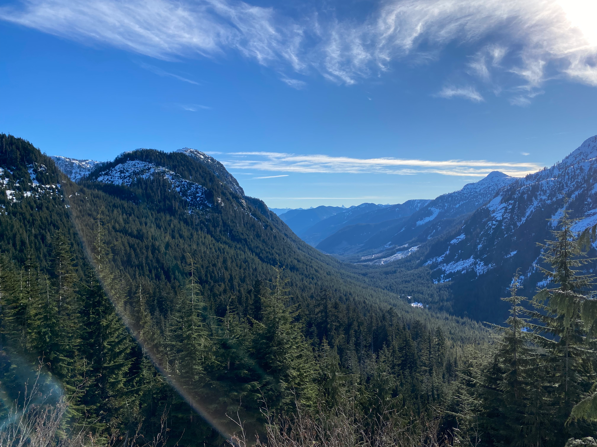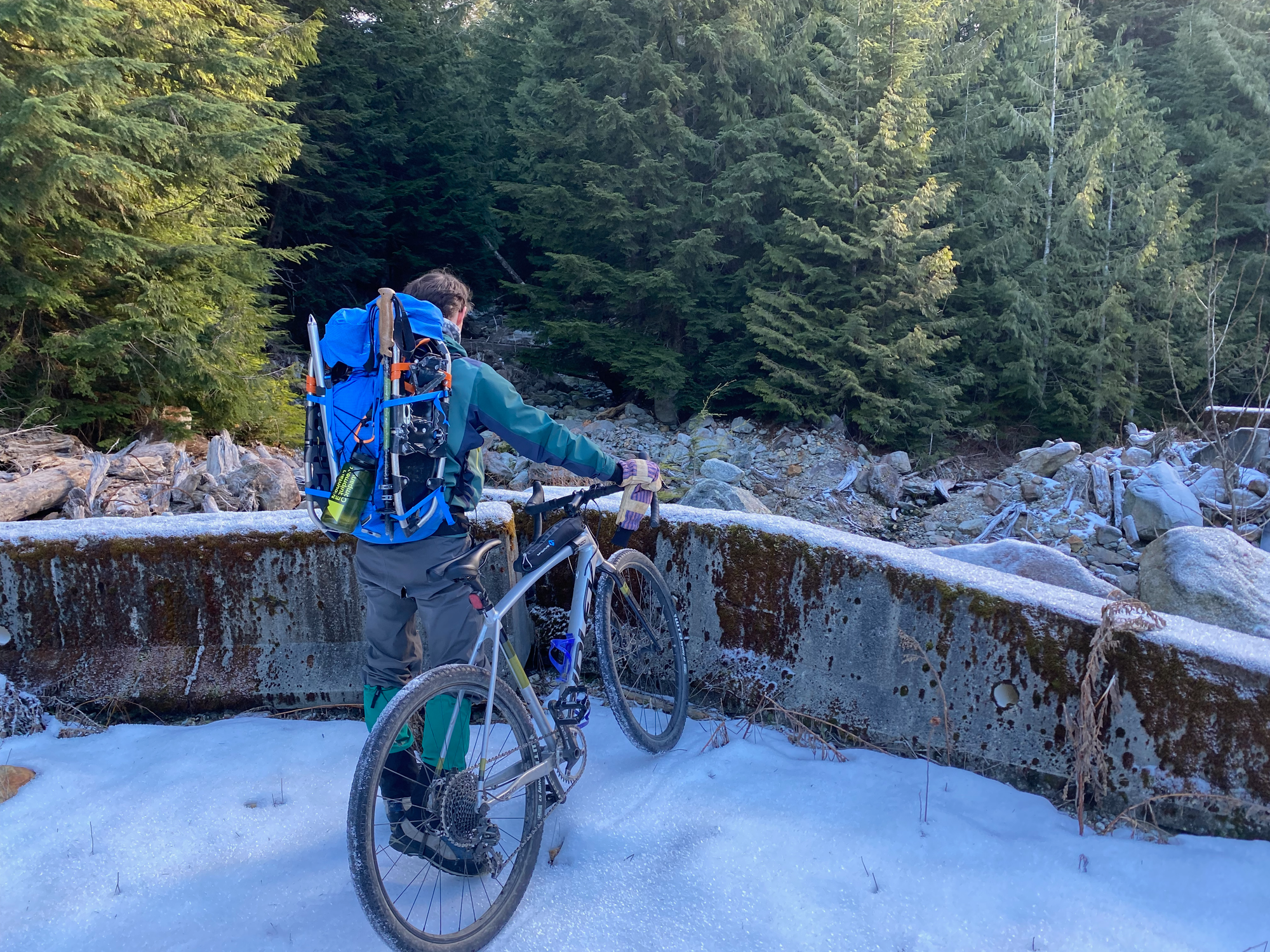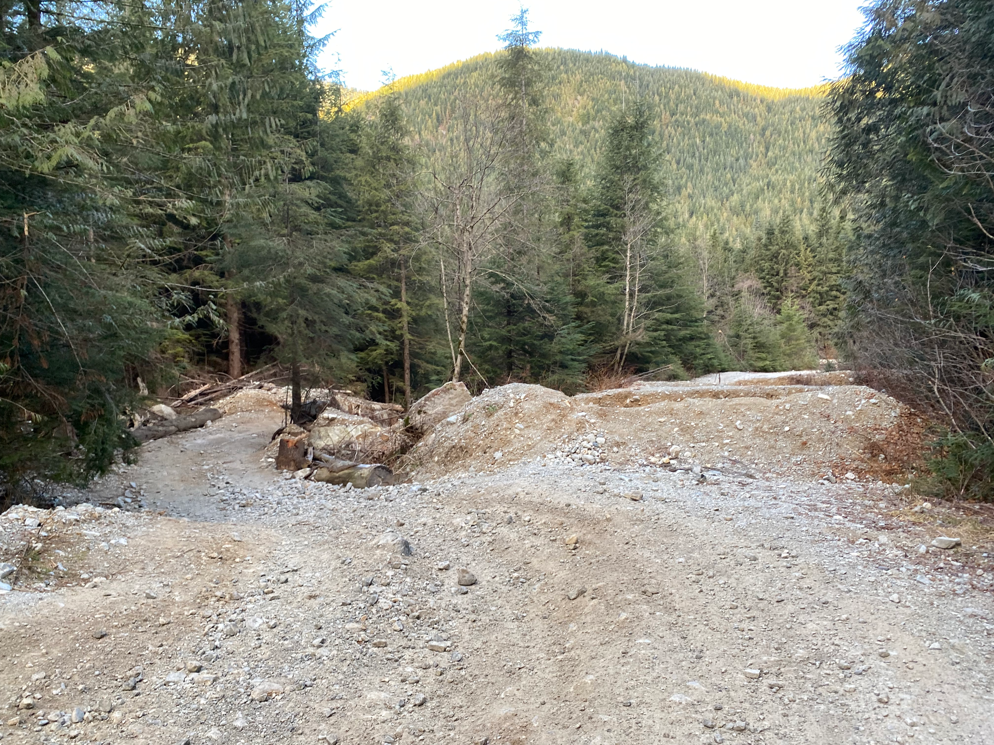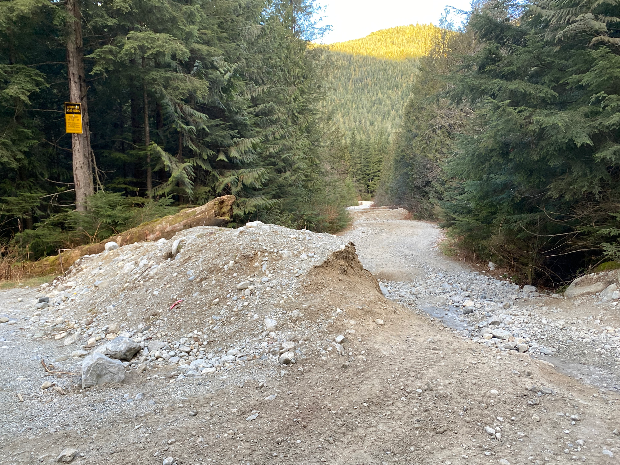 Around 16km, the Lost Creek FSR has been deactivated with large dirt walls for no reason. There was a bypass that could probably be managed with a medium or high clearance 4WD, but it was quite icy and I didn’t want to risk sliding into the ditch, so we parked there. We had brought bikes for this exact situation and they ended up being very useful.