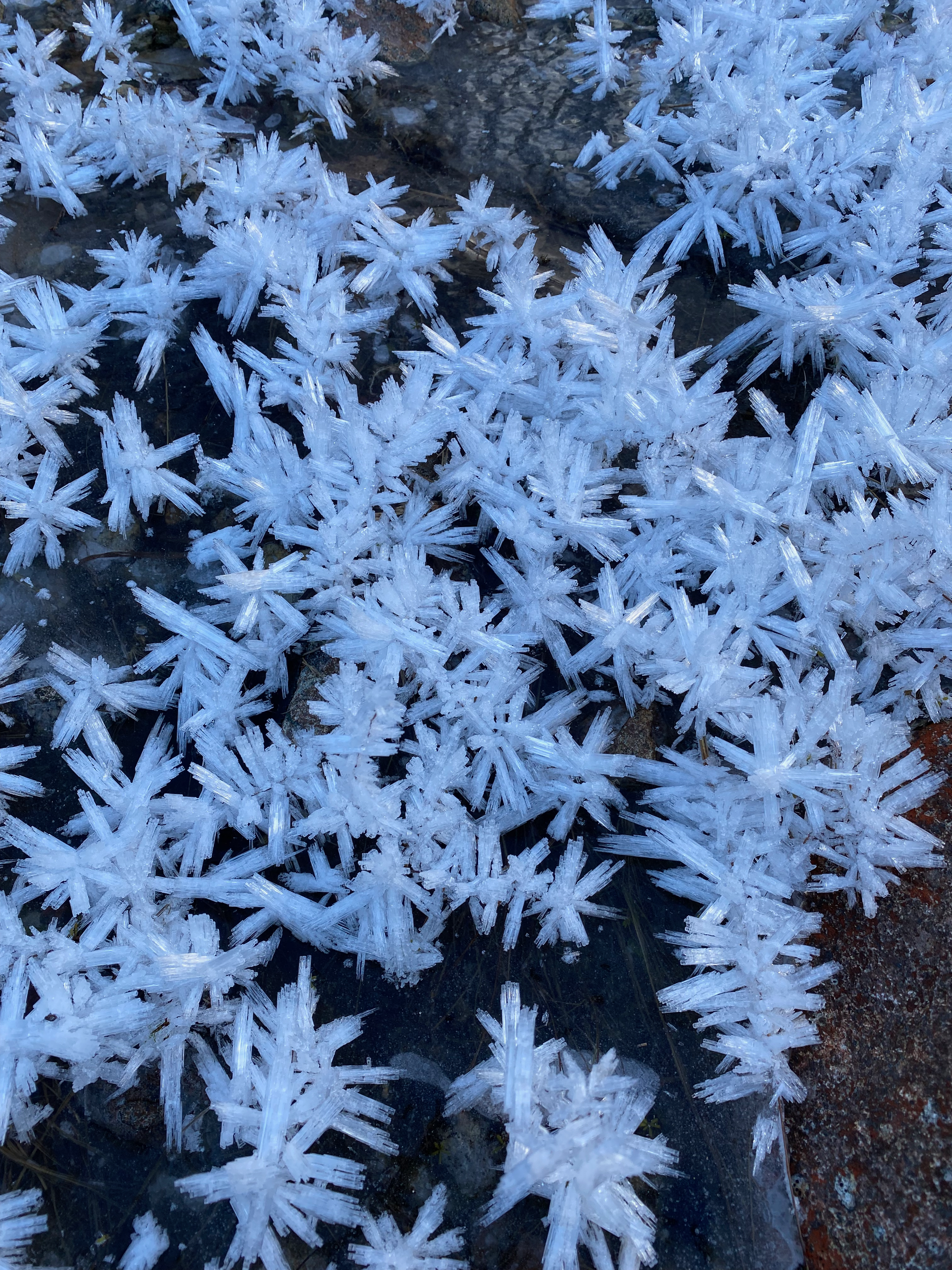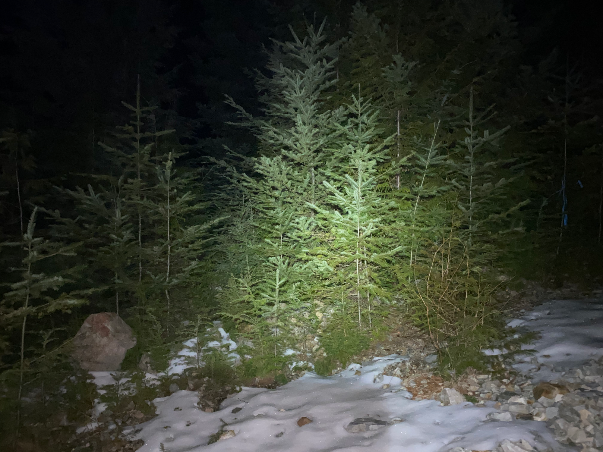 We went down the ridge as the light faded, eventually entering a cutblock. Despite the darkness, we mostly stayed on track, reaching a very overgrown logging road. This road eventually connected to the road we’d left earlier, but it became very difficult to follow for the last 50m or so after crossing a creek. Eventually we reached the other road, jogged back to our bikes, and headed back to the car. This part was mostly smooth sailing, except for a few exciting ice-covered sections. Eventually we made it back to the car and began the long drive home.