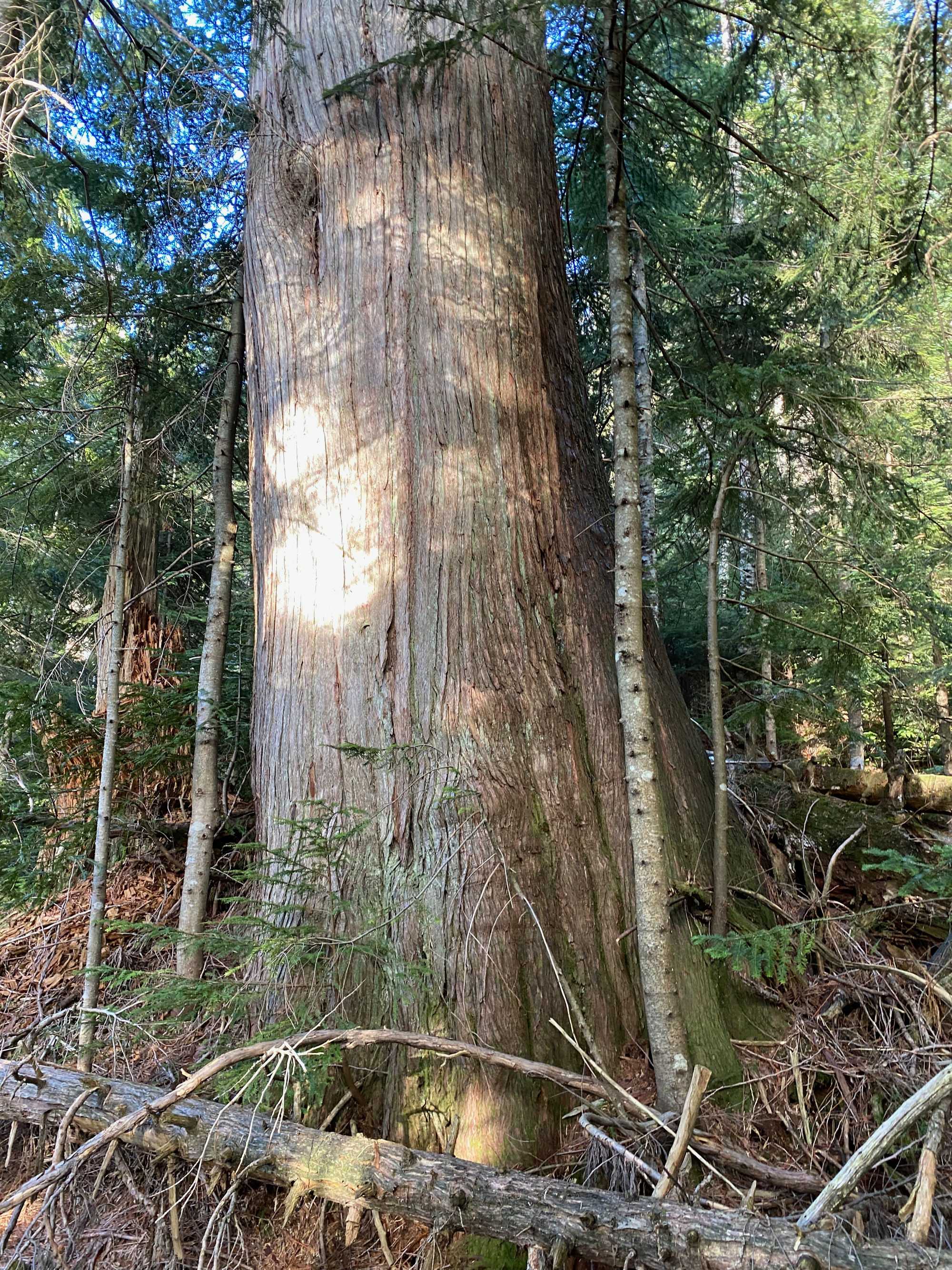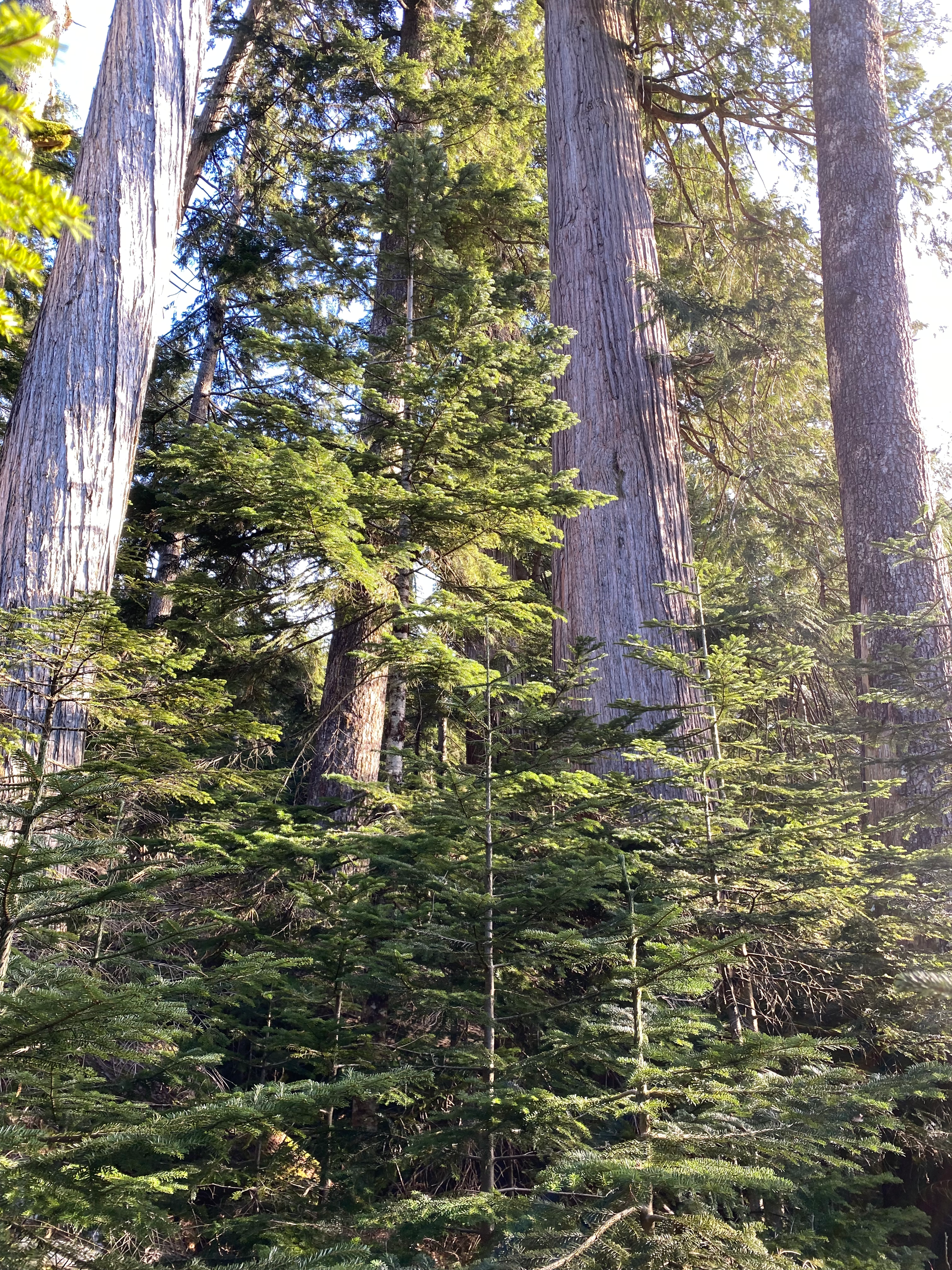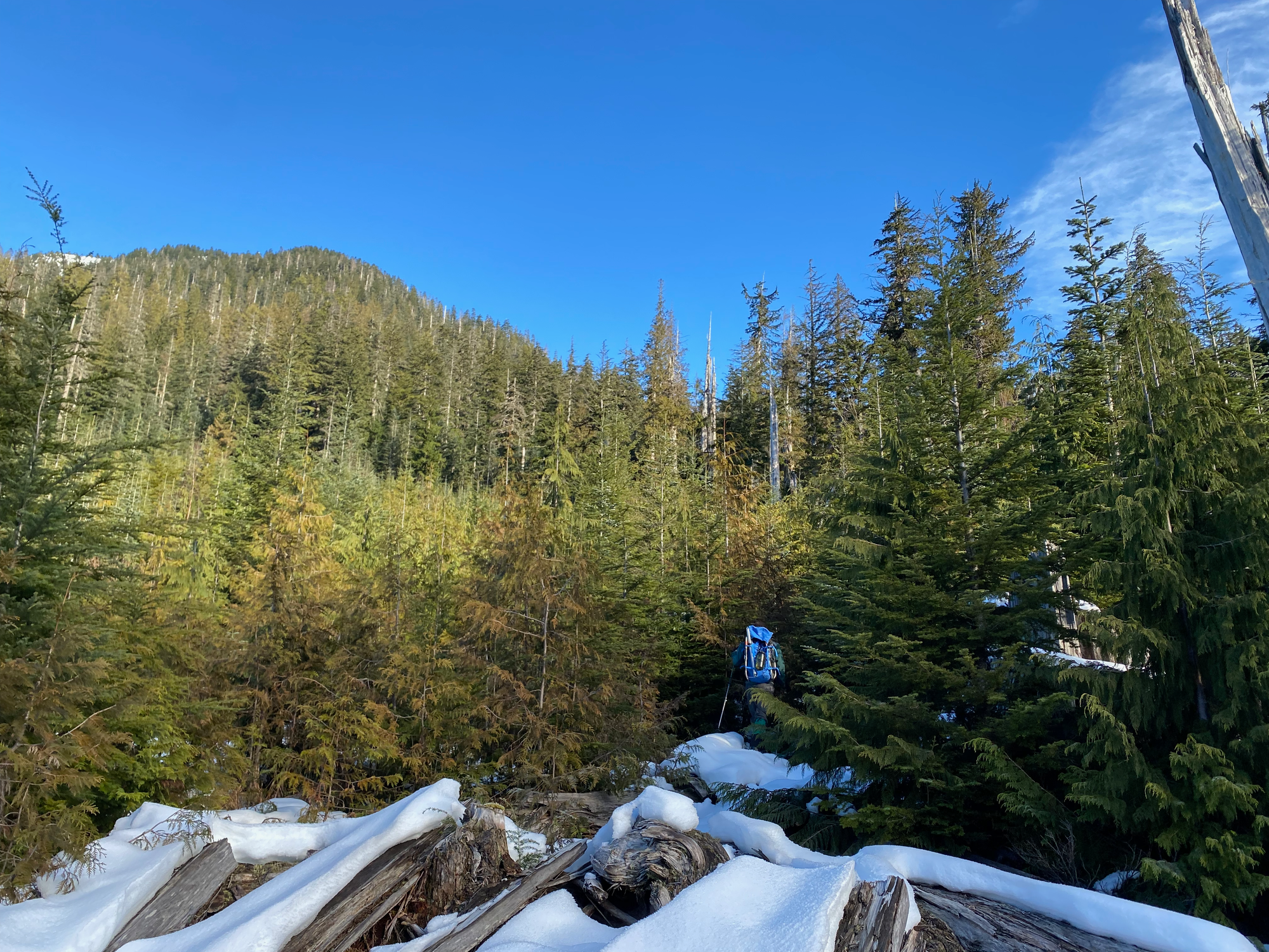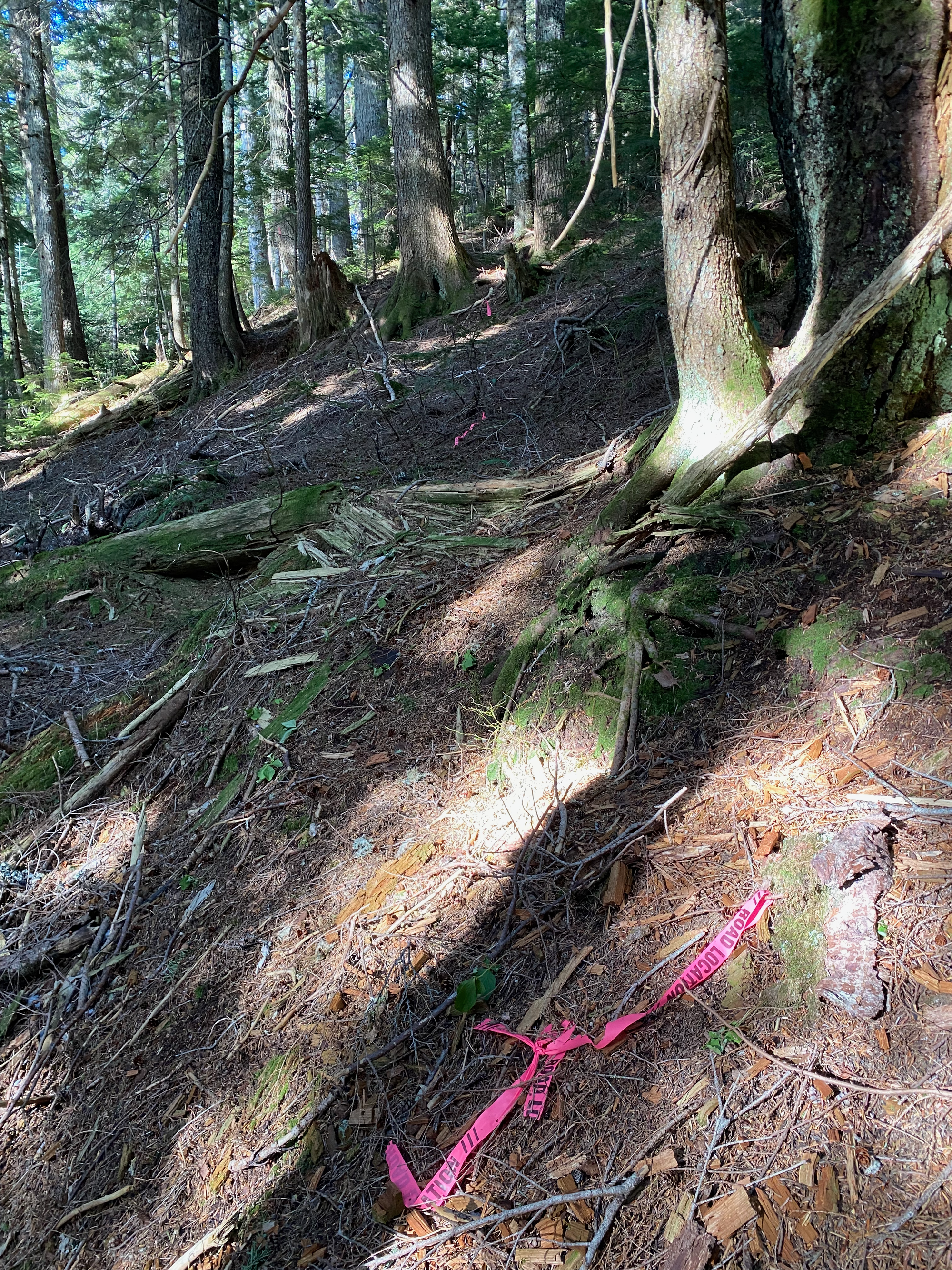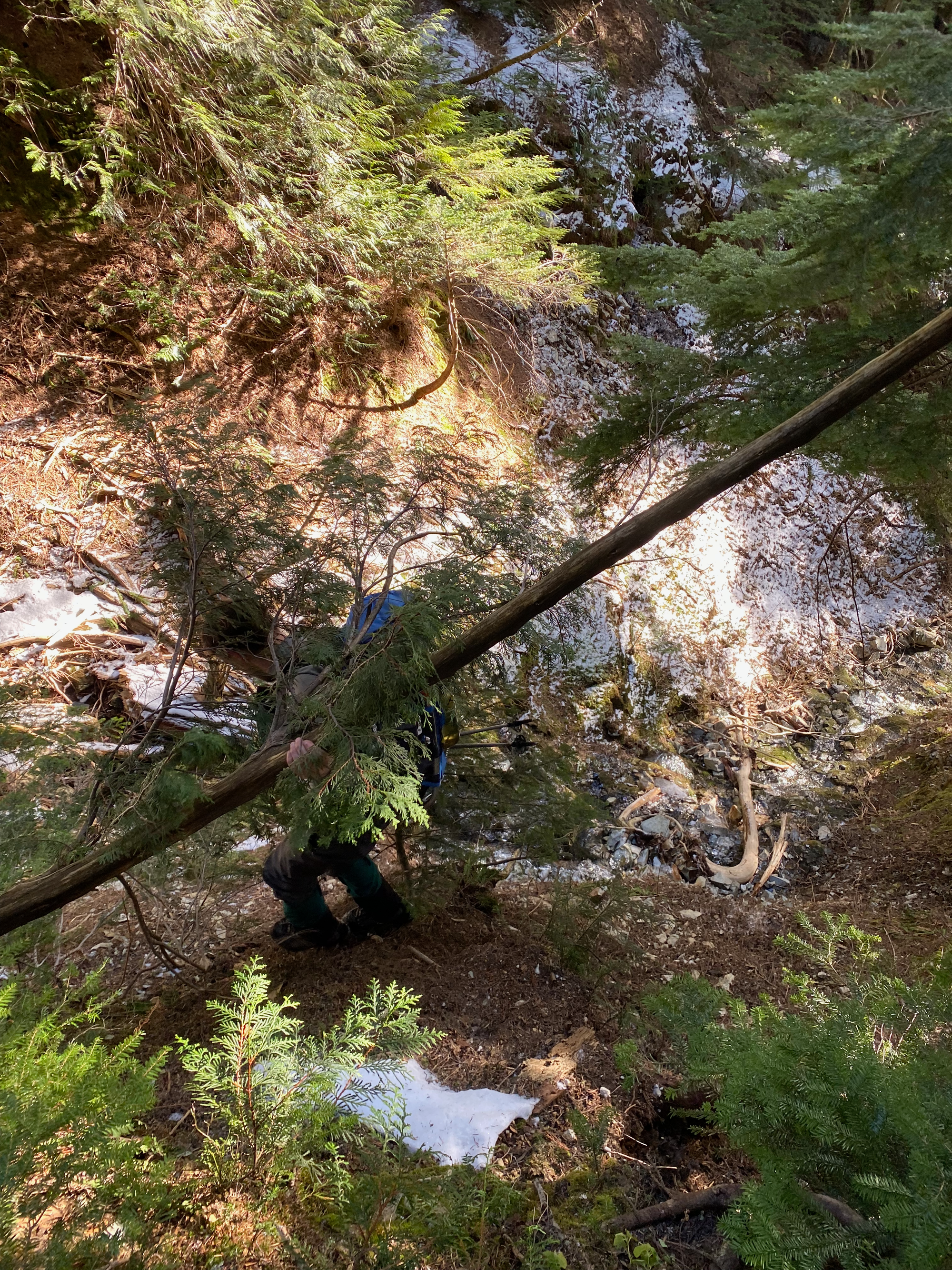 Near the end of the road, we headed northeast into the cutblock. After about 100m we entered an area of old-growth forest, which was far more open and offered much easier travel, with minimal bushwhacking. It turns out we’d gone too far north and west and avoided the “giant ancient forest” on the BC forest map, instead traveling through regular ancient forest. At two points we had to cross small creek valleys.