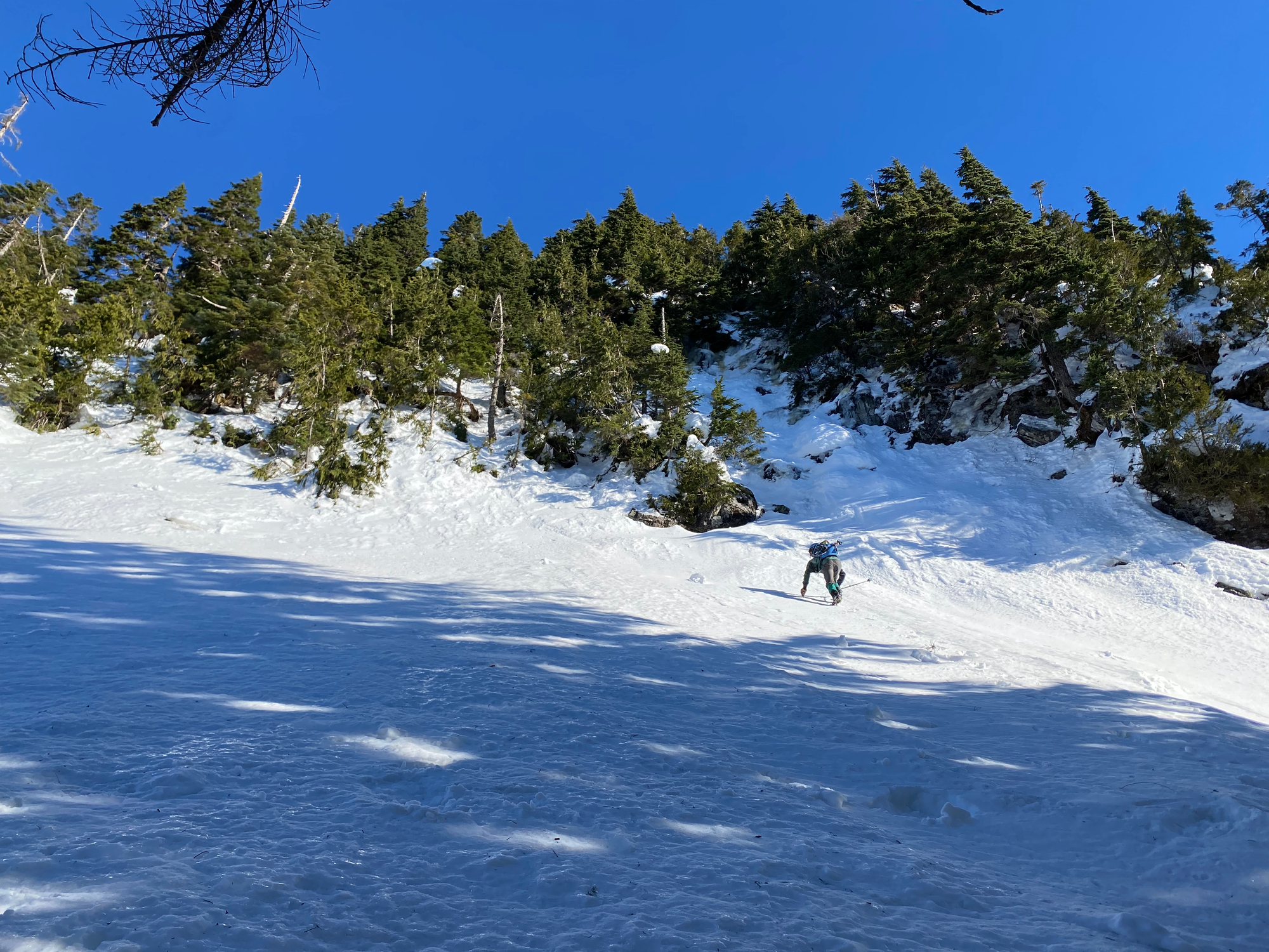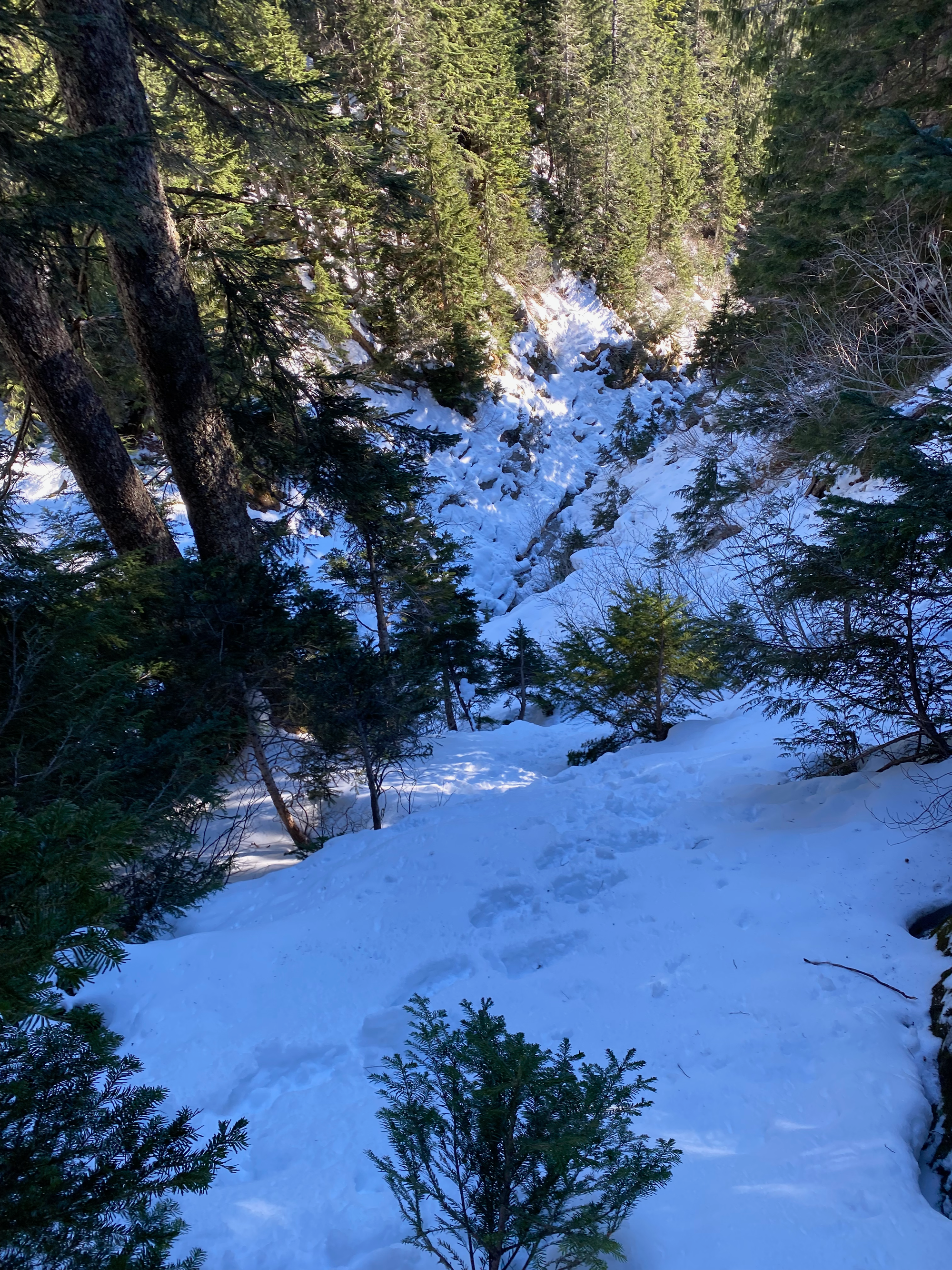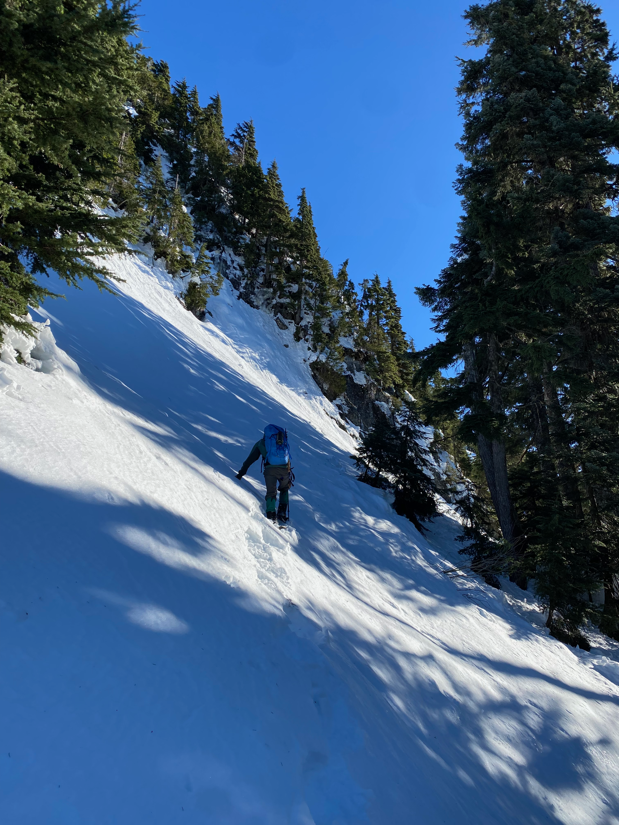 This was going to be the crux of the trip. Steven Song’s group had ascended this bluff directly, using trees as handholds. We tried to do the same, but the snow consisted of a thin crust on top of deep powder and provided very little support. It didn’t seem safe to keep going, and we were running out of time to get Blinch, which was the main goal of the day, so we decided to bail on Flinch.