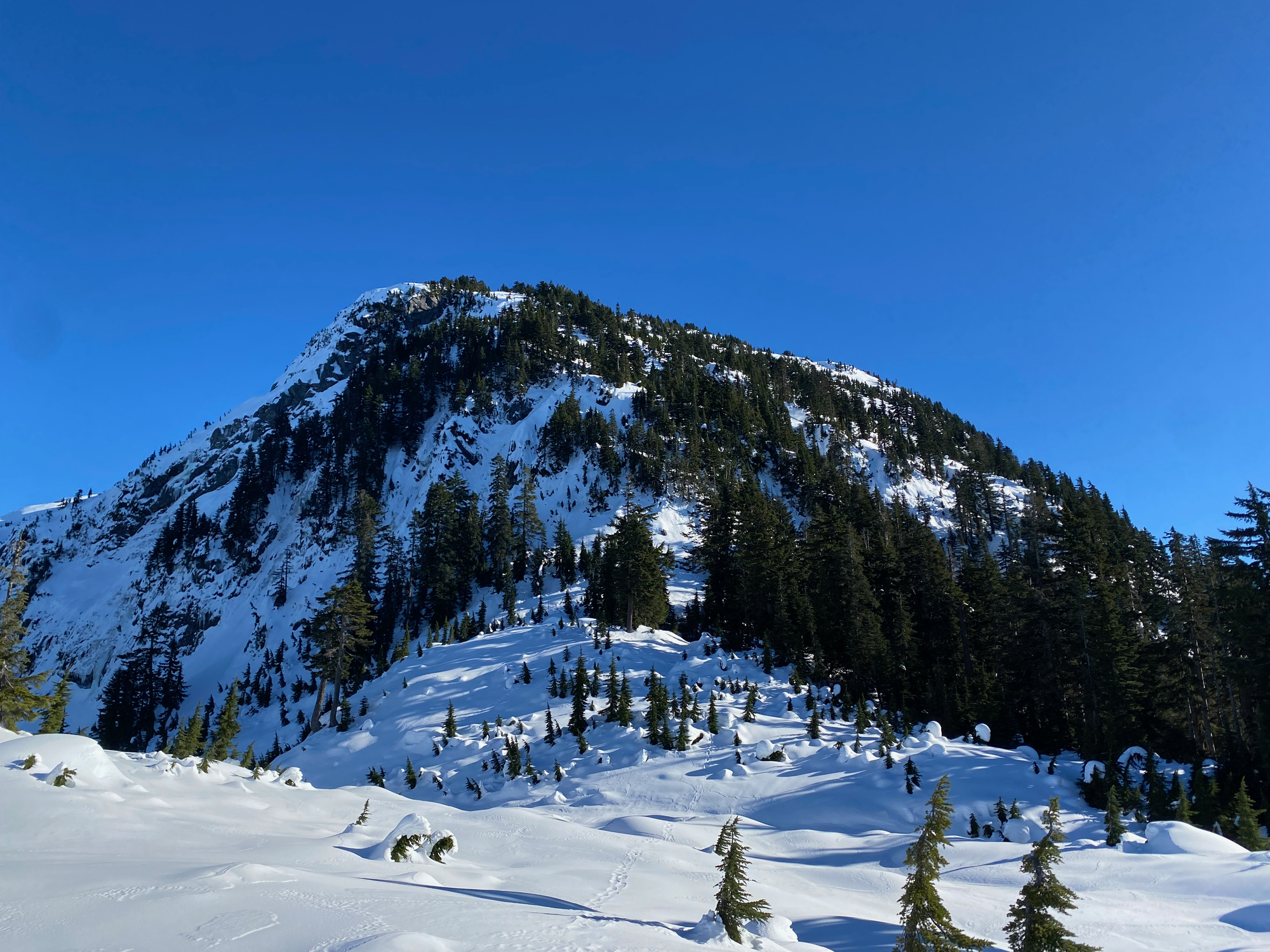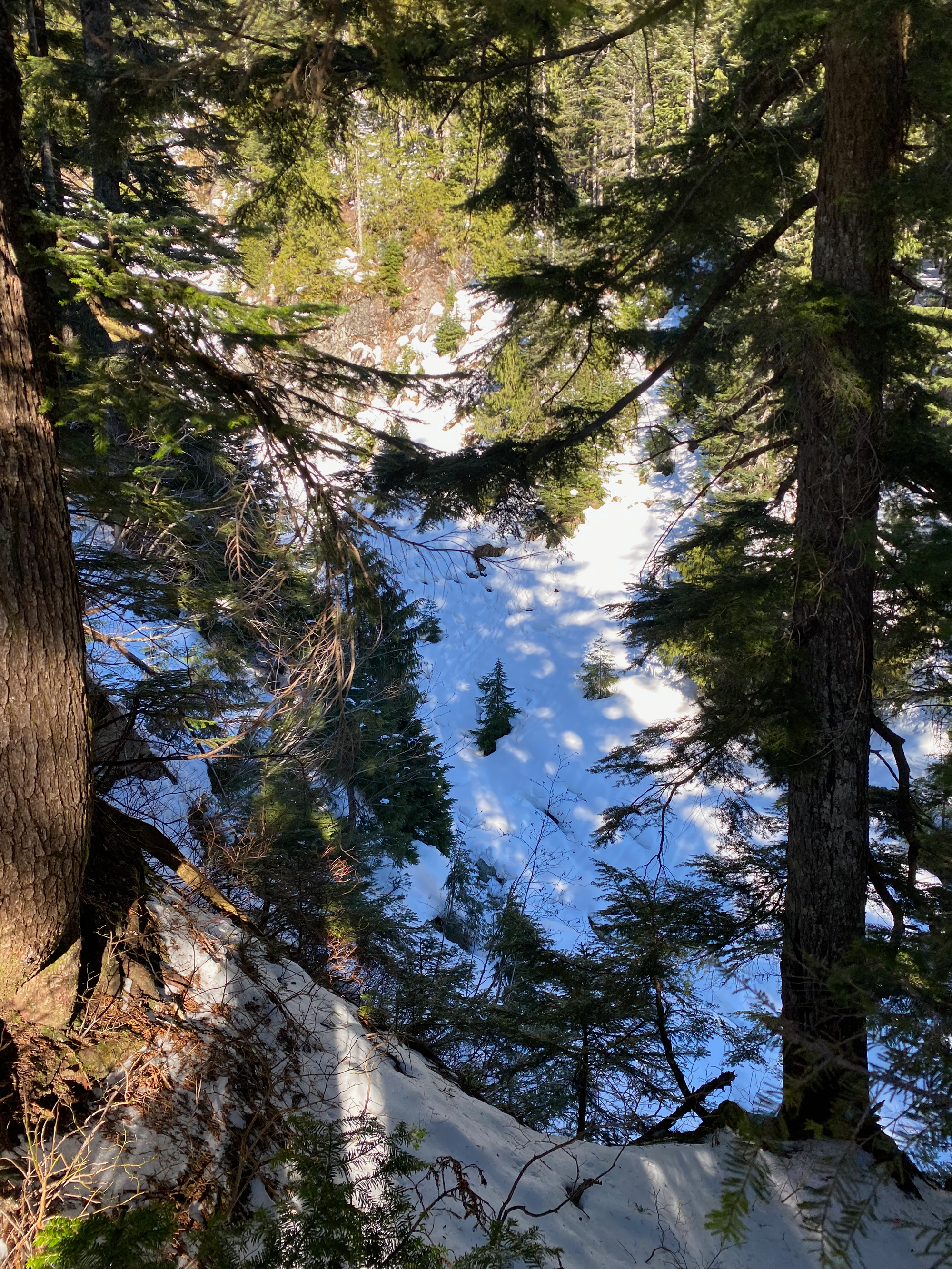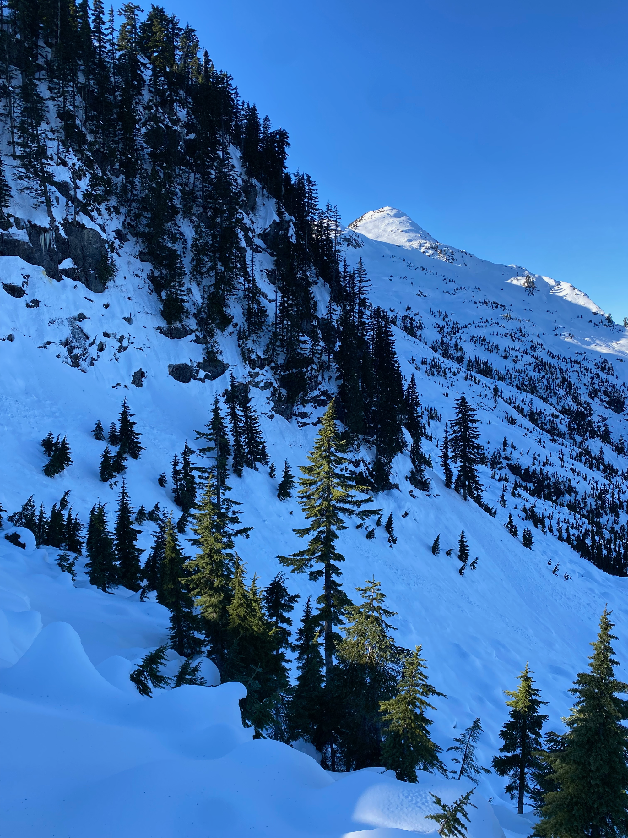 This was going to be the crux of the trip. Steven Song’s group had ascended this bluff directly, using trees as handholds. We tried to do the same, but the snow consisted of a thin crust on top of deep powder and provided very little support. It didn’t seem safe to keep going, and we were running out of time to get Blinch, which was the main goal of the day, so we decided to bail on Flinch.