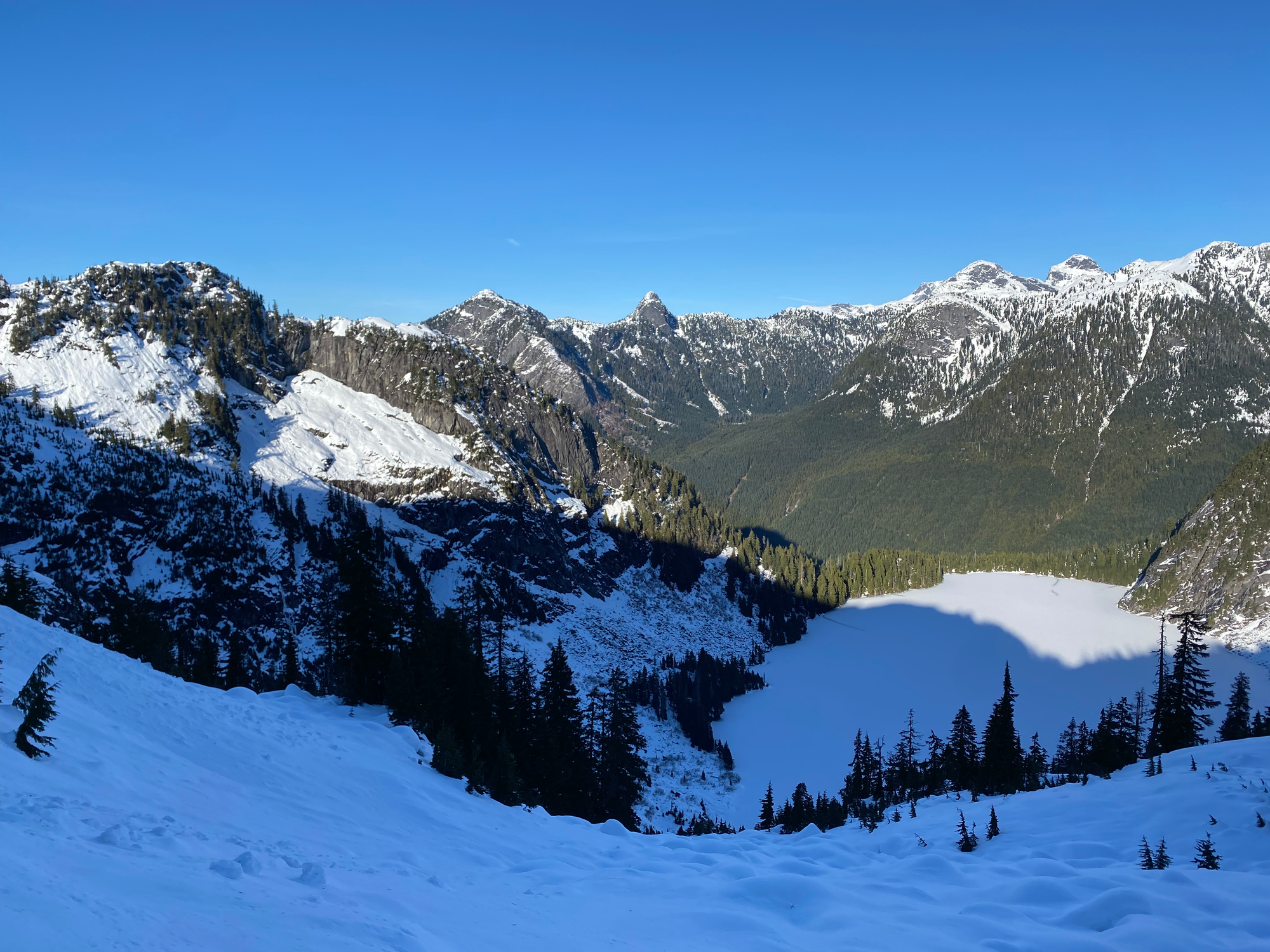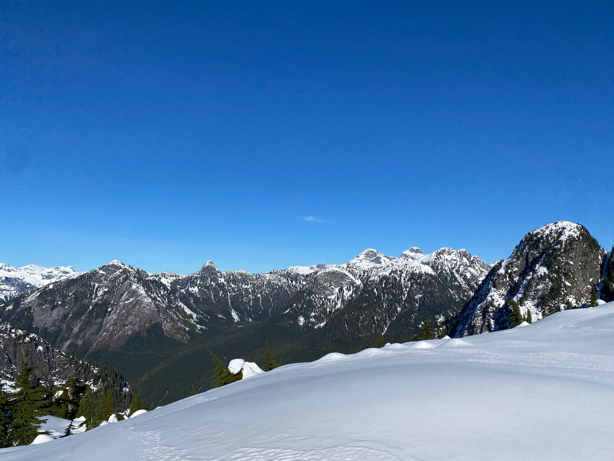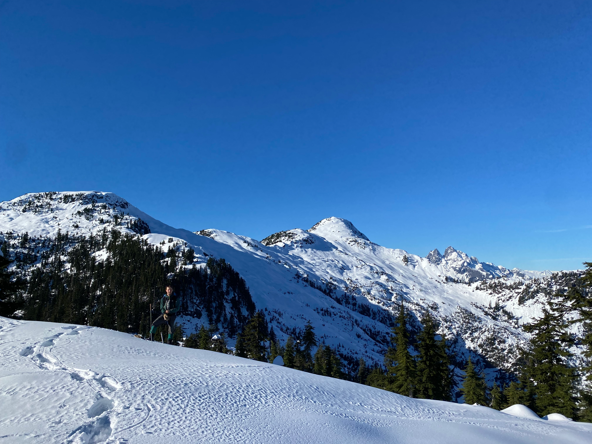 We returned to the Blinch-Flinch col and had lunch, gazing across the valley at some extremely obscure Chehalis-area peaks we’d never seen before.