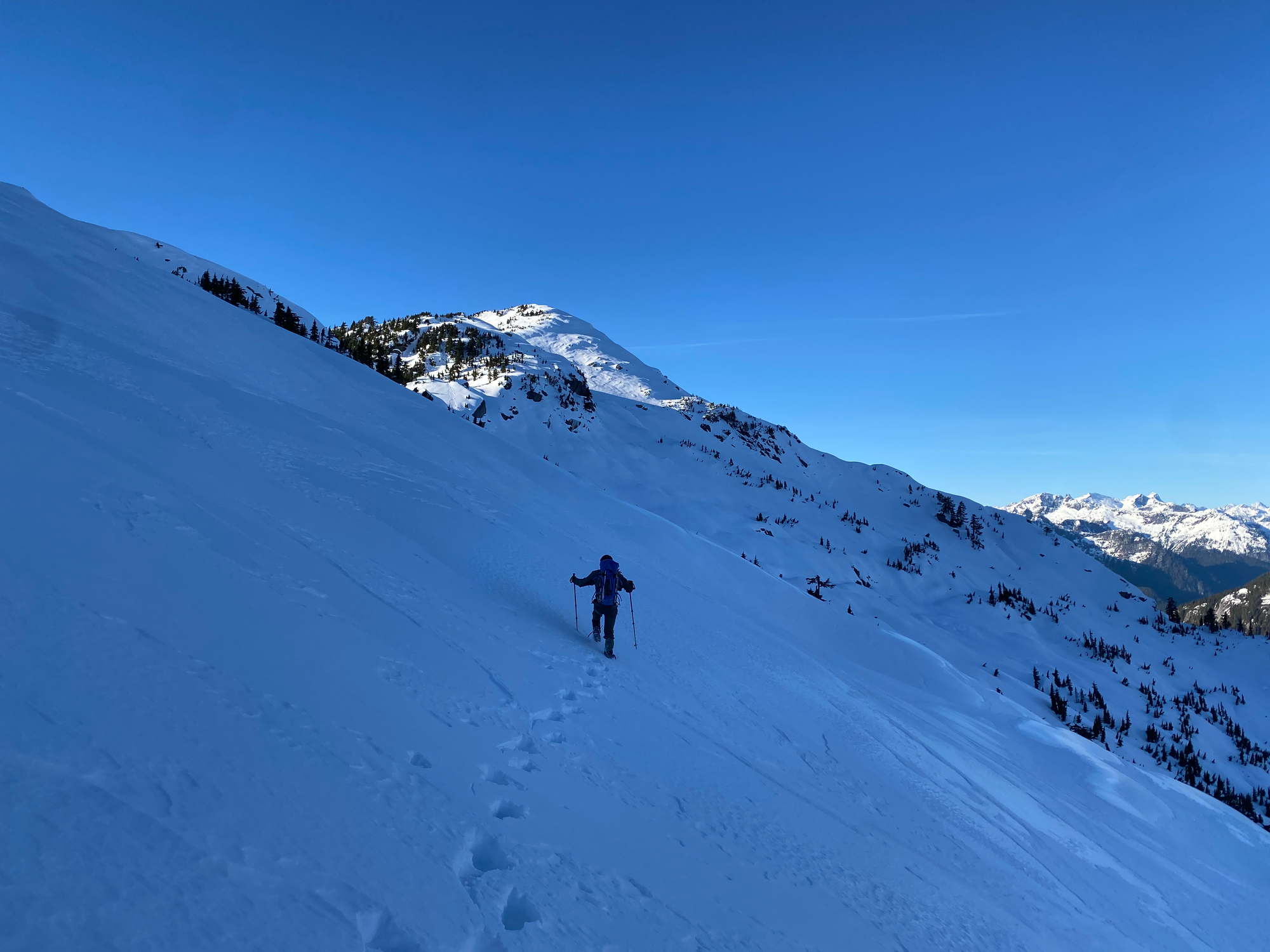 There are several bumps between Flinch and Blinch, so we saved energy by directly traversing their north face to the base of Blinch, taking advantage of the low avalanche risk.