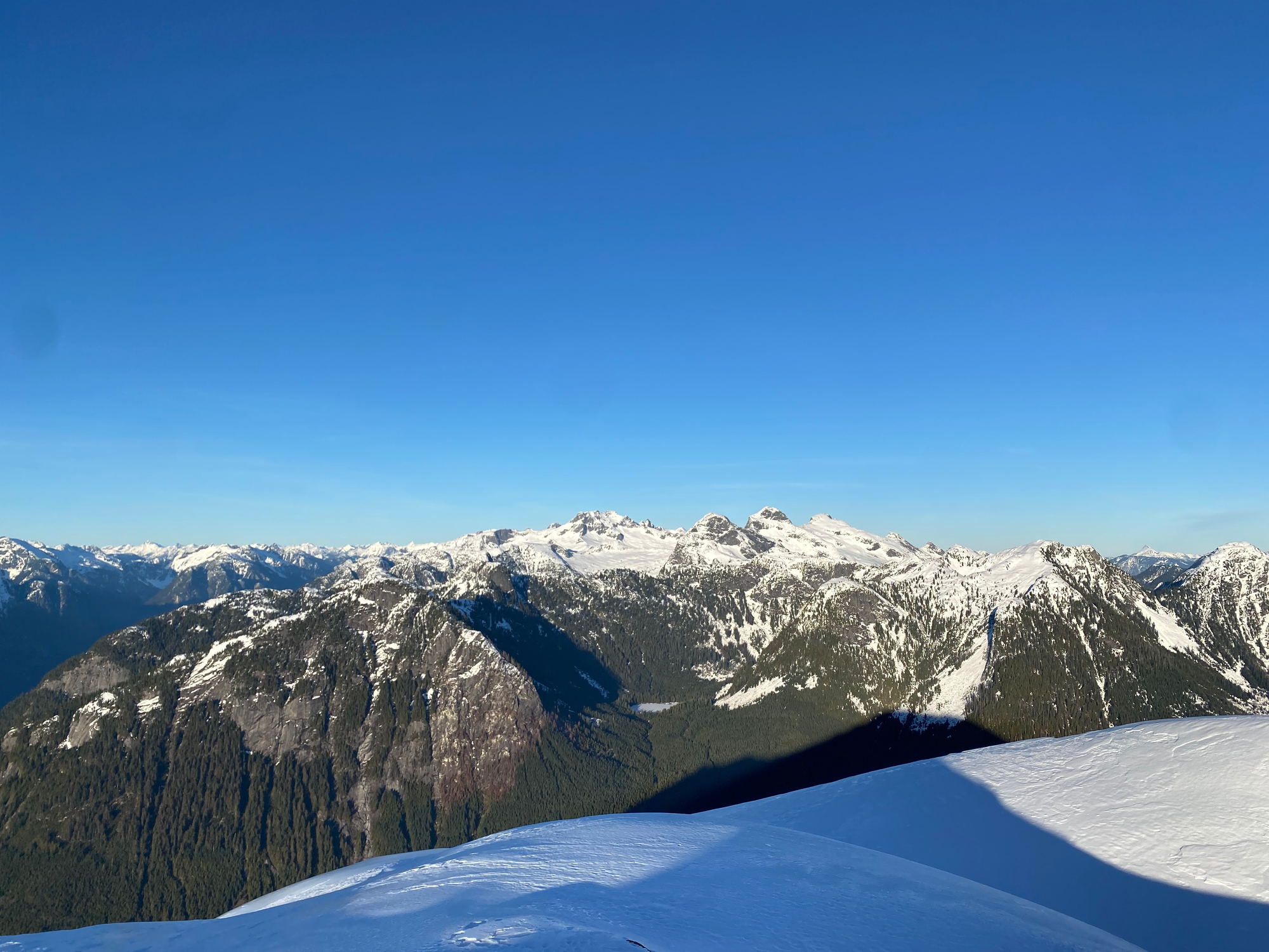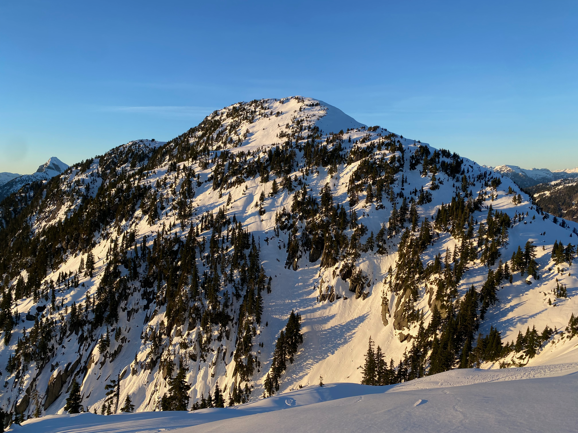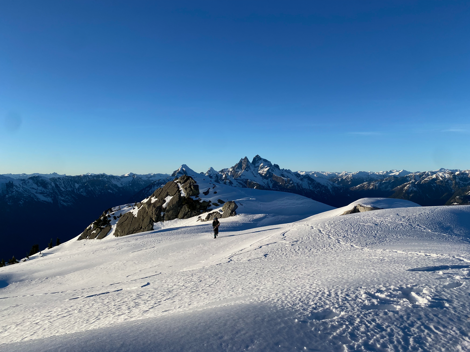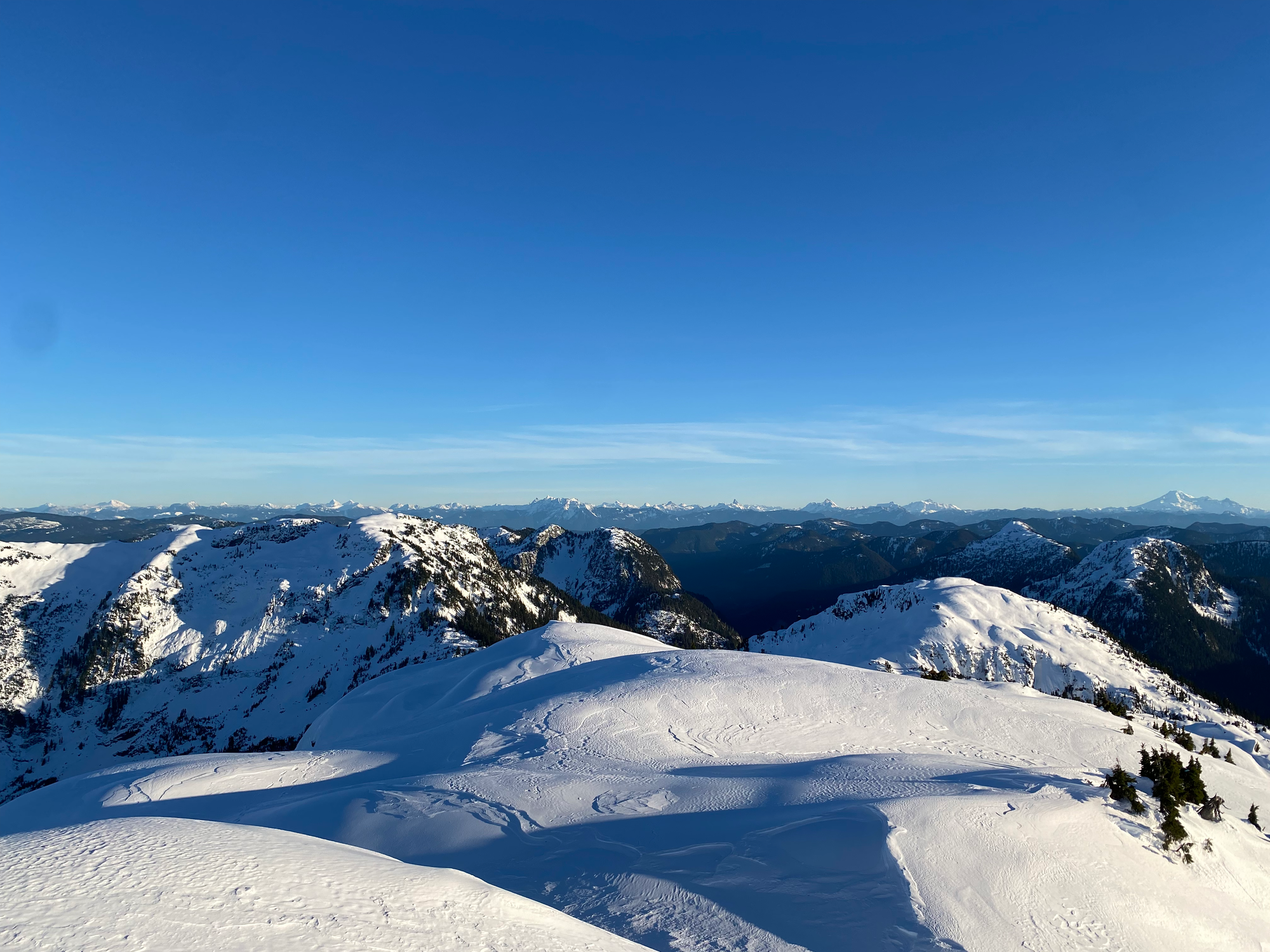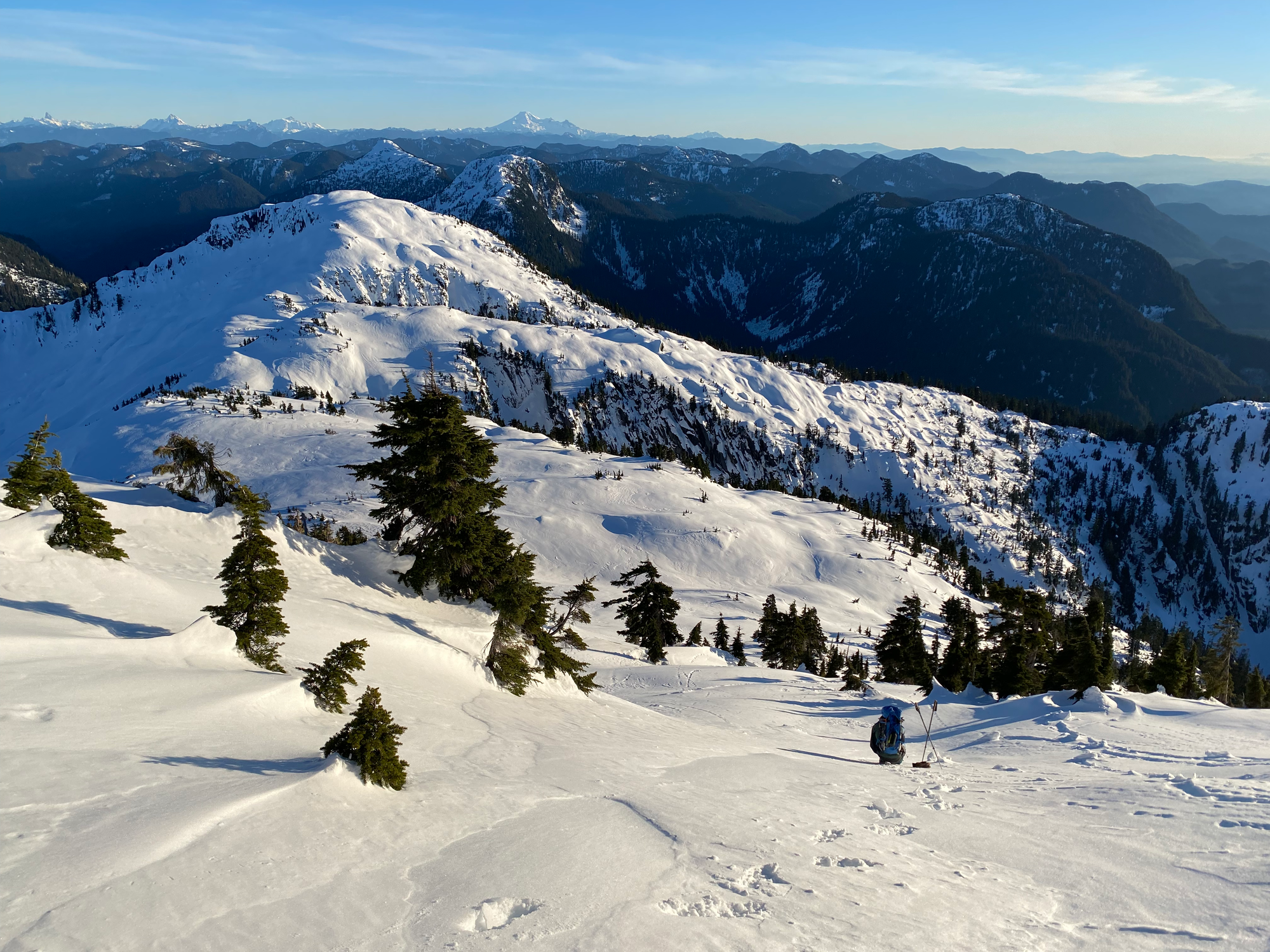 As expected, the views were excellent, with a great vantage point of the Judge and Robie Reid and surprisingly nice views of the Chilliwack peaks to the south. It felt very remote, with only the faintest view of the Fraser Valley in the distance. Sunset was approaching and we could not stay long.