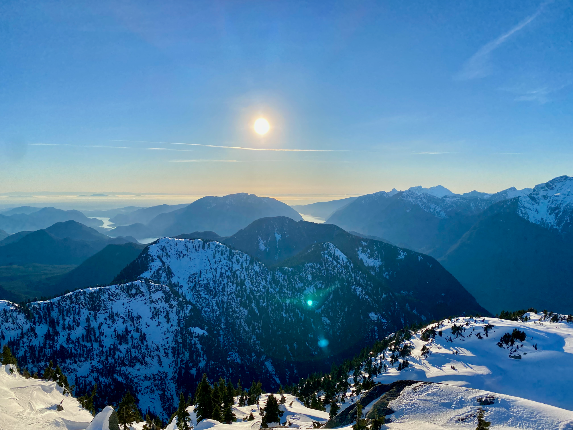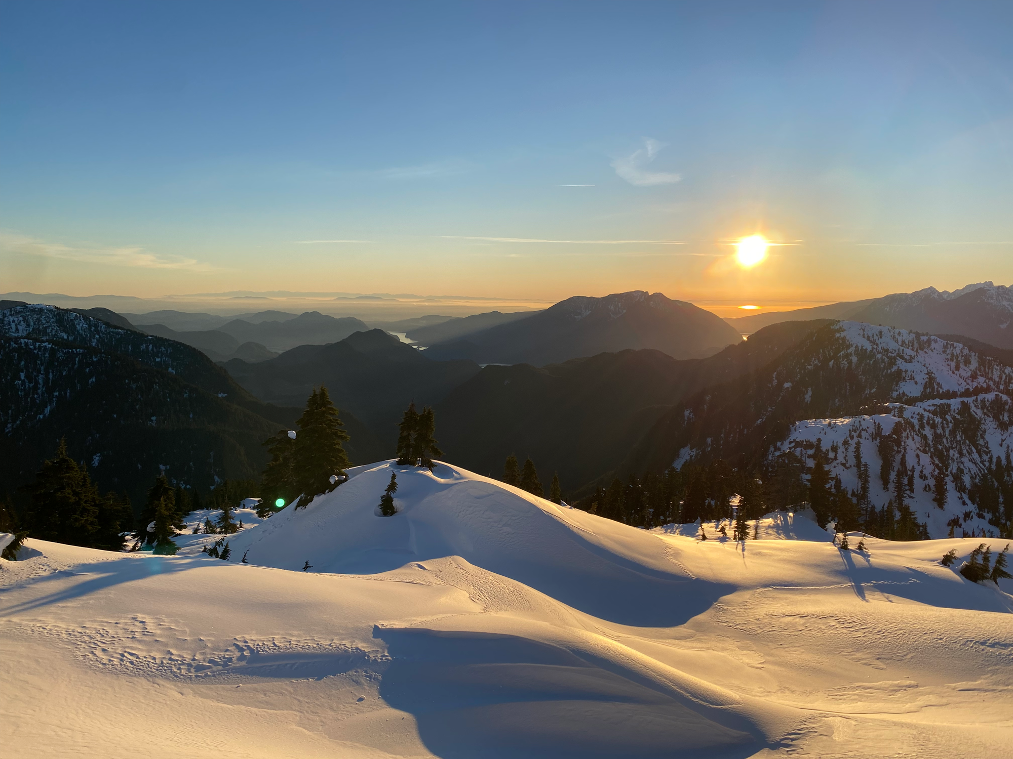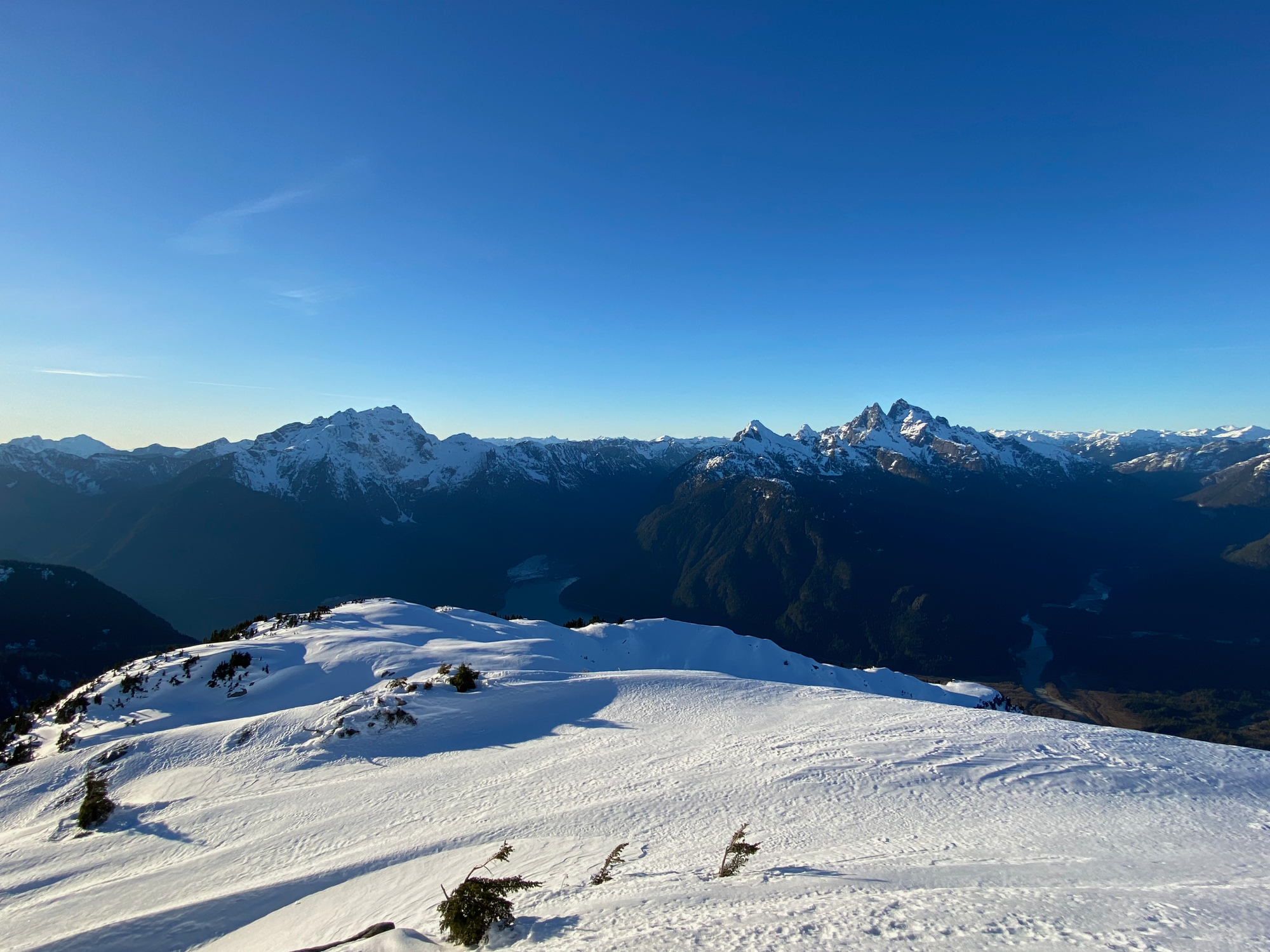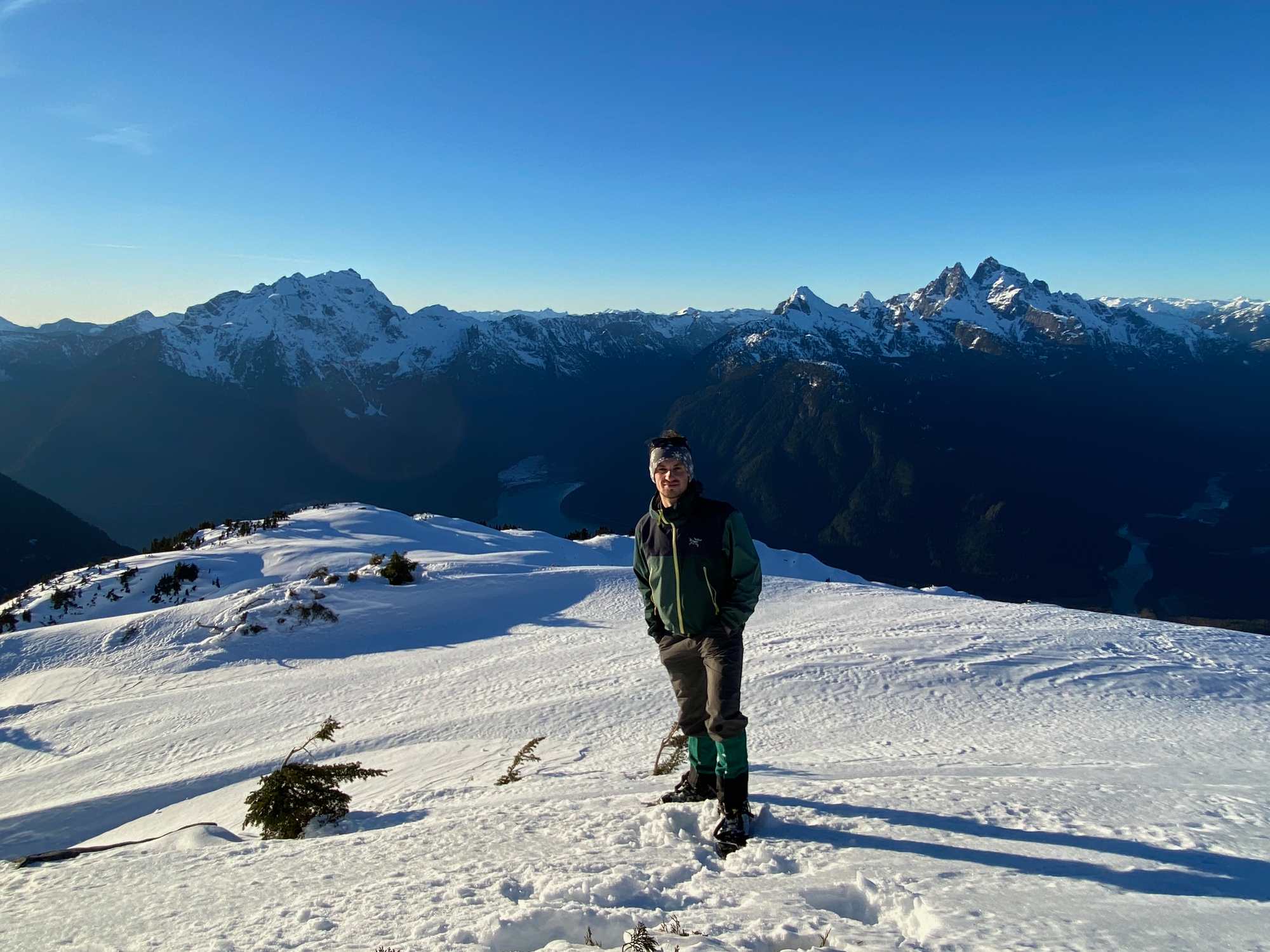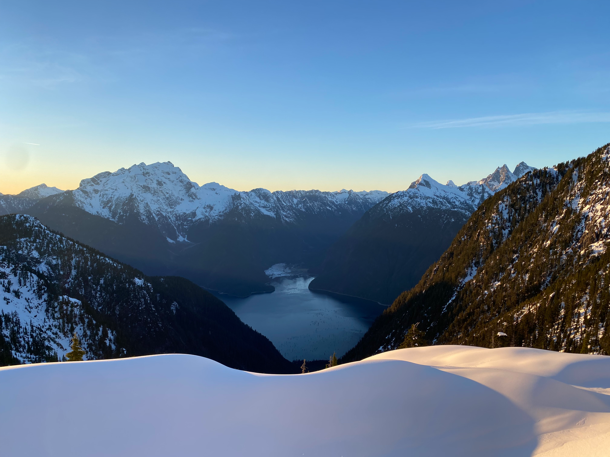 As expected, the views were excellent, with a great vantage point of the Judge and Robie Reid and surprisingly nice views of the Chilliwack peaks to the south. It felt very remote, with only the faintest view of the Fraser Valley in the distance. Sunset was approaching and we could not stay long.