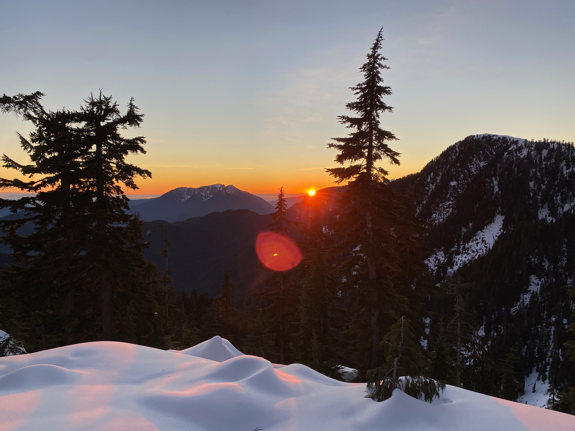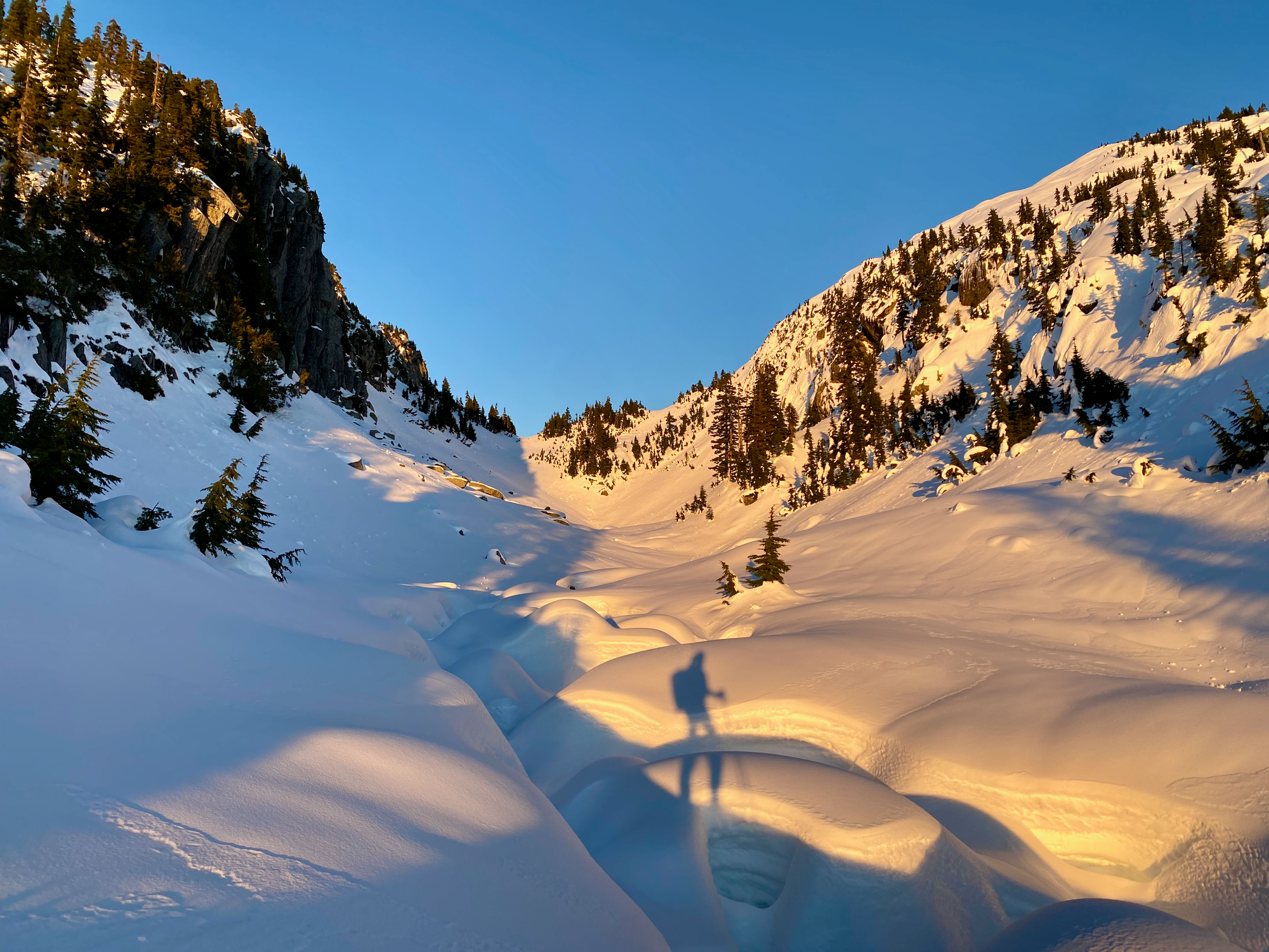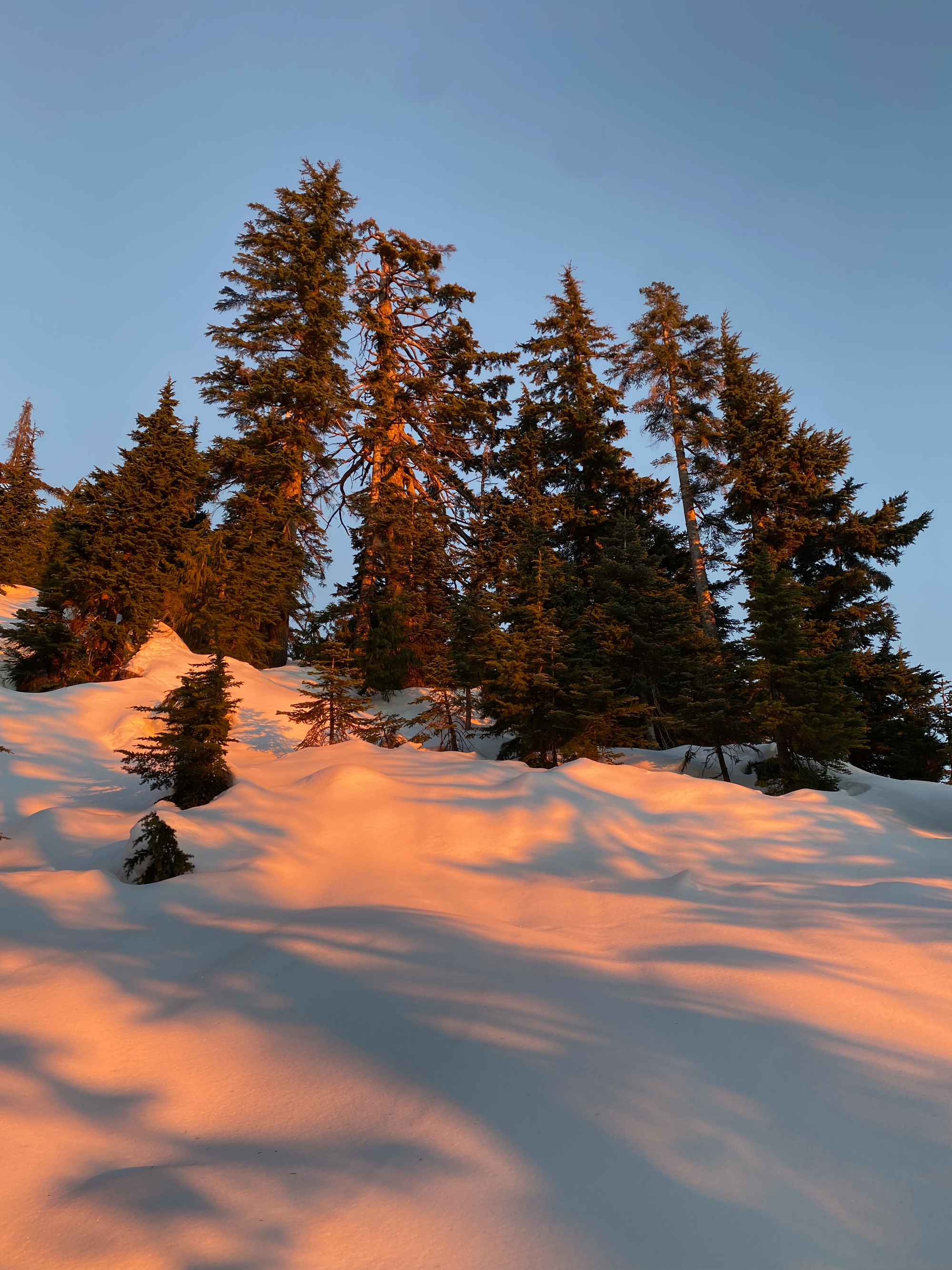 To descend, we followed a track on peakbagger.com. We went to the next bump on the ridge between Blinch and Flinch, crossing a beautiful valley in golden hour to do so. From there, we went down the ridge to the southwest above the canyon, then crossed the canyon to another ridge once the topography allowed. Through the trees we had nice views of the sunset and Mt. Crickmer.