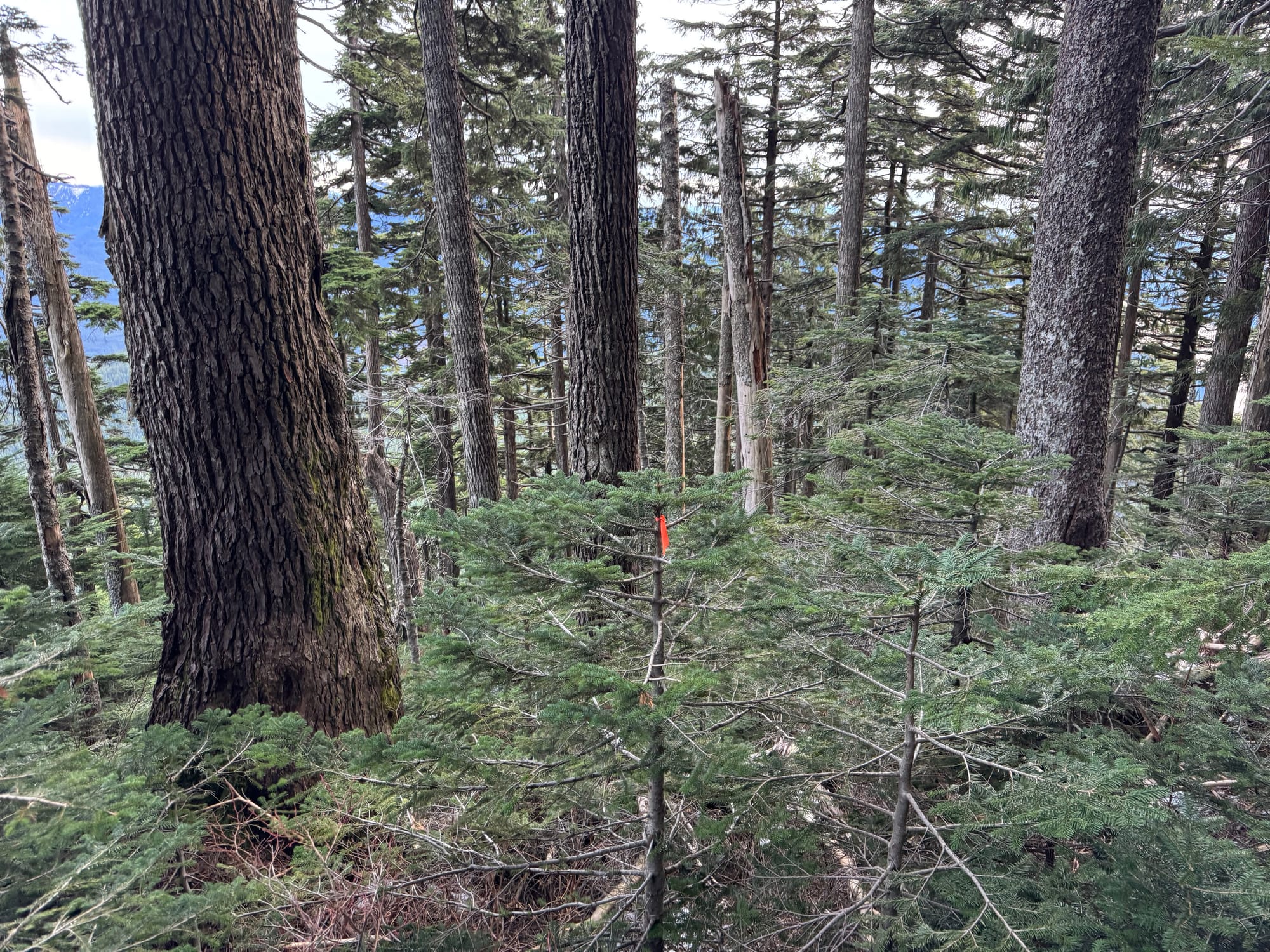 Around 890m I left the FSR and started heading uphill. This was a steep bushwhack, but not too bad by coastal standards. There were some cliffs but they were easily avoided. Surprisingly, there were flags in some places.