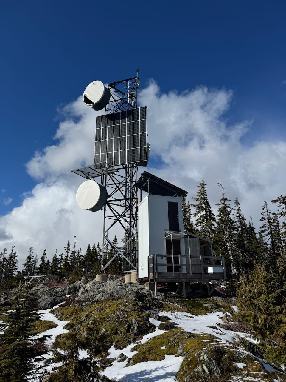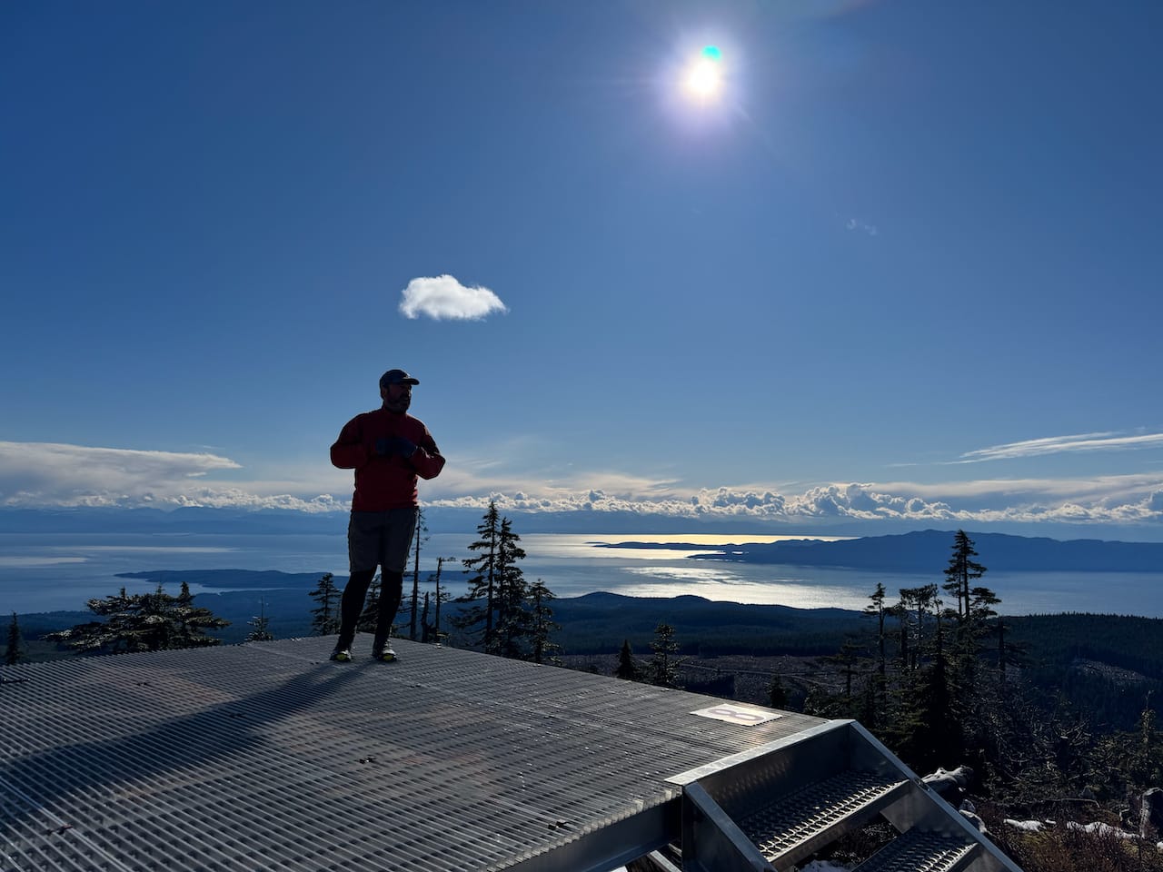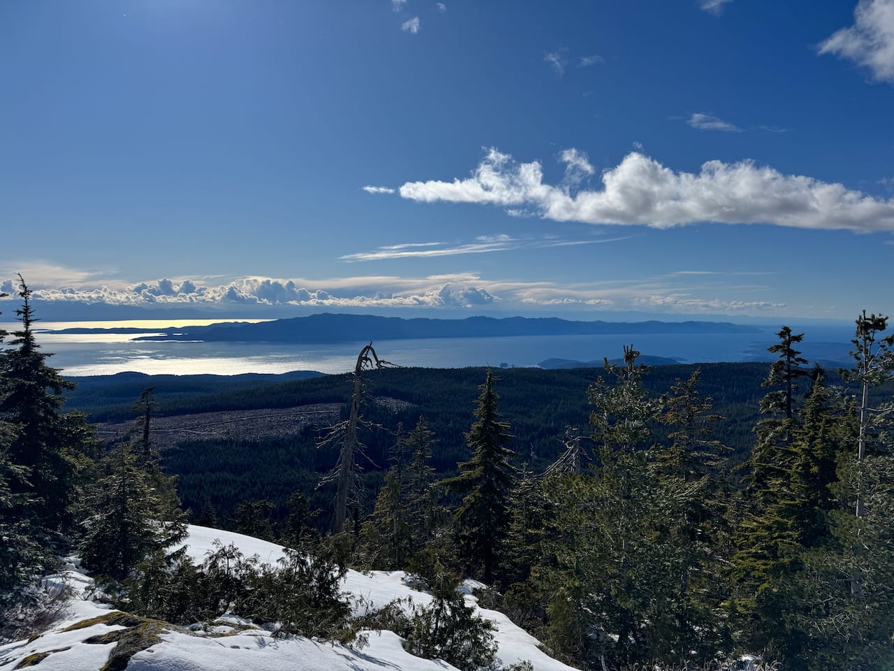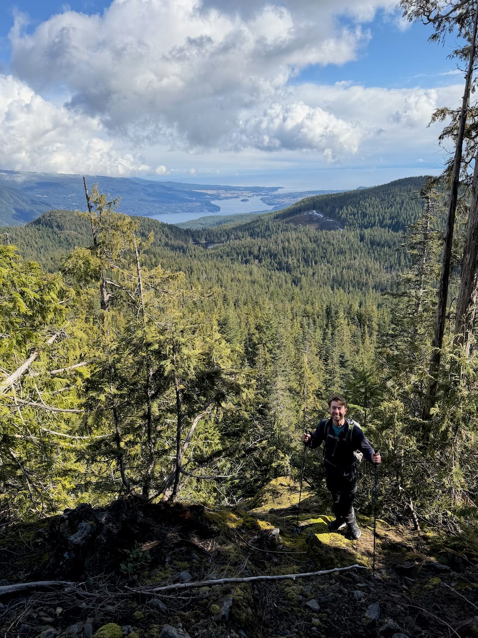 Like other peaks in this range, the summit is marked with some sort of tower. Clearings provided great views west to the Gulf Islands and north along the Sunshine Coast, including Spipiyus Peak which we'd just visited.