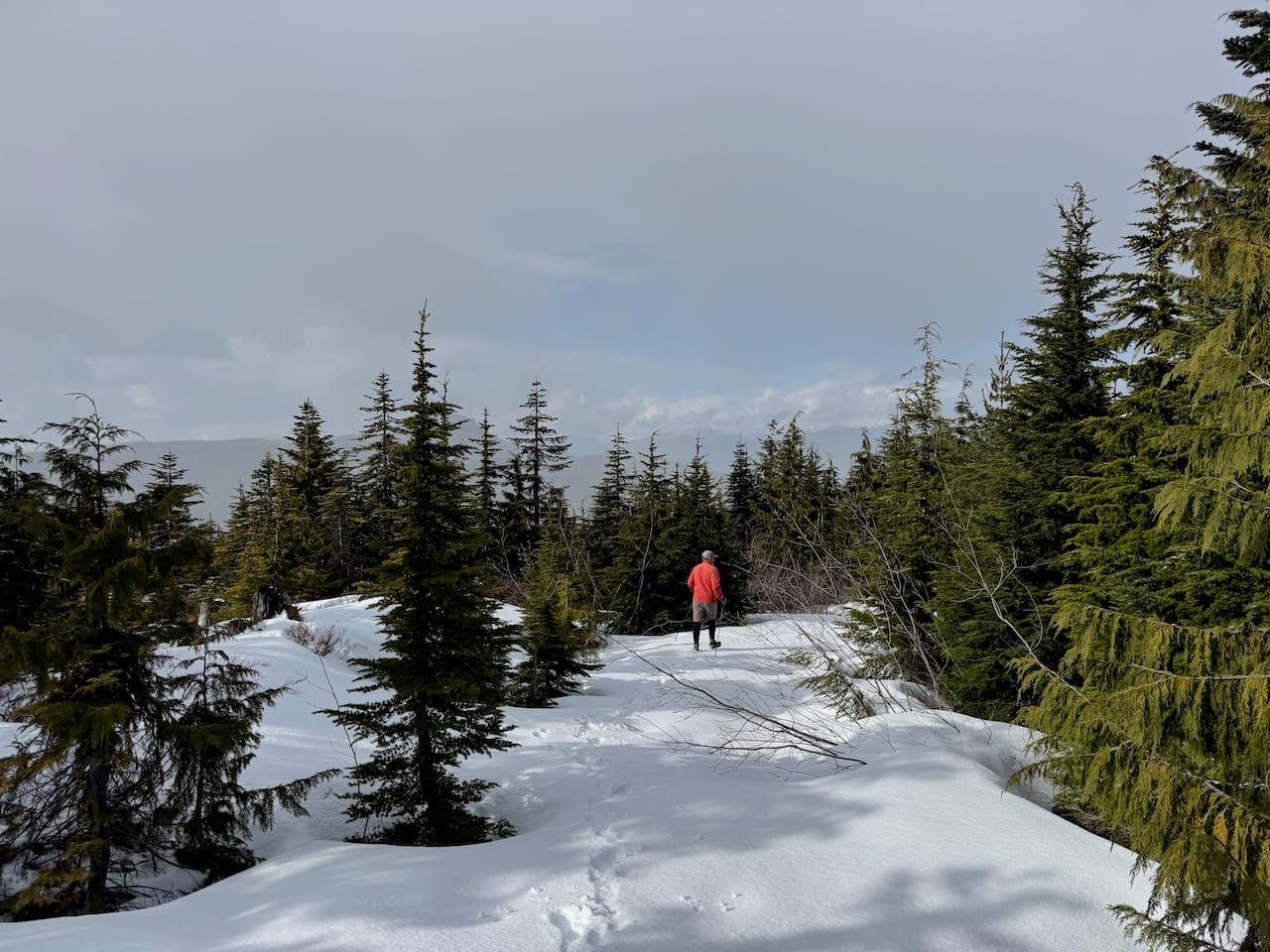 We headed along the FSR for a kilometre or so, then took a shortcut by bushwhacking due north to the peak. This wasn't too bad by BC standards, and bluffs on the way provided nice views.