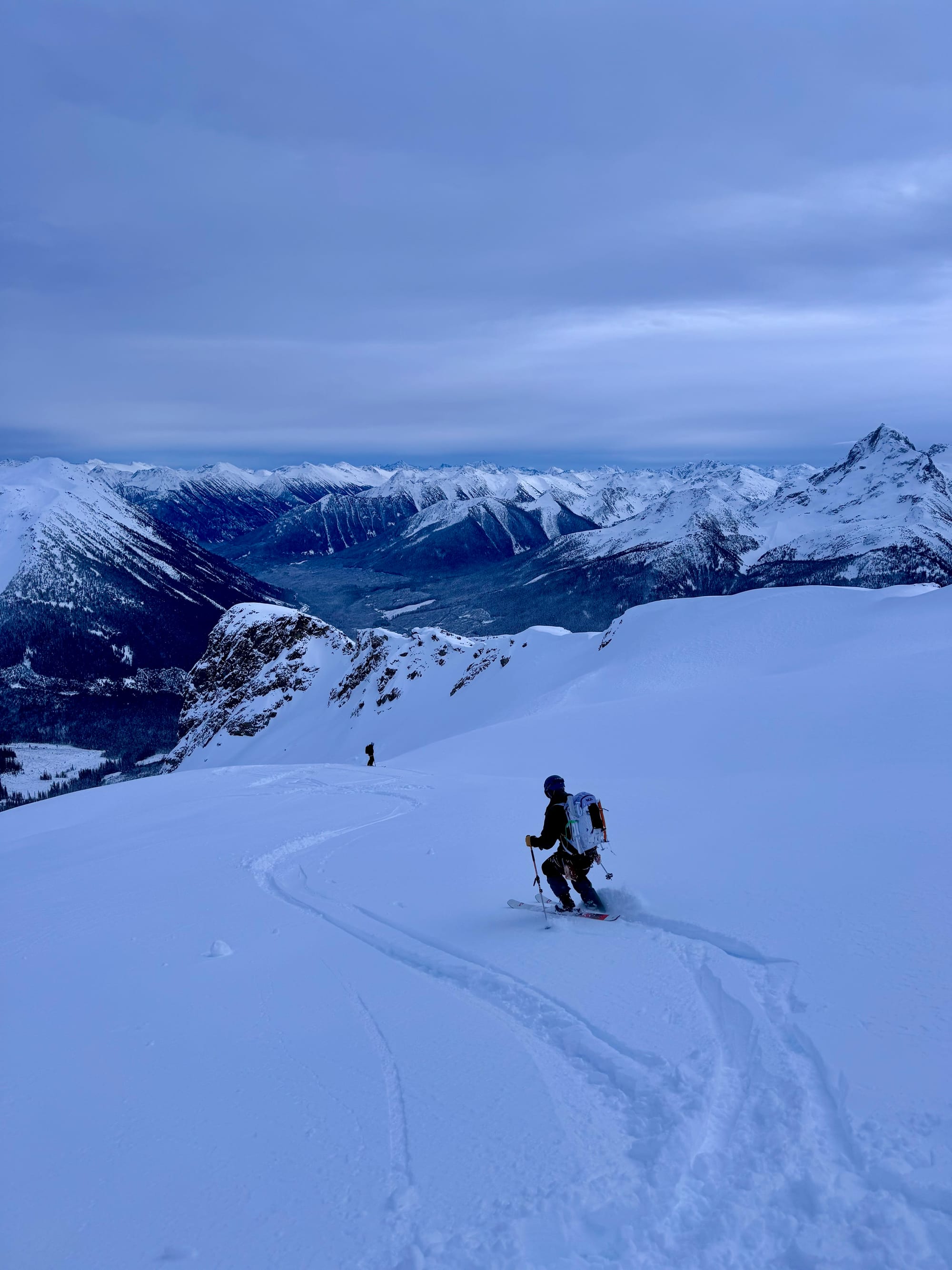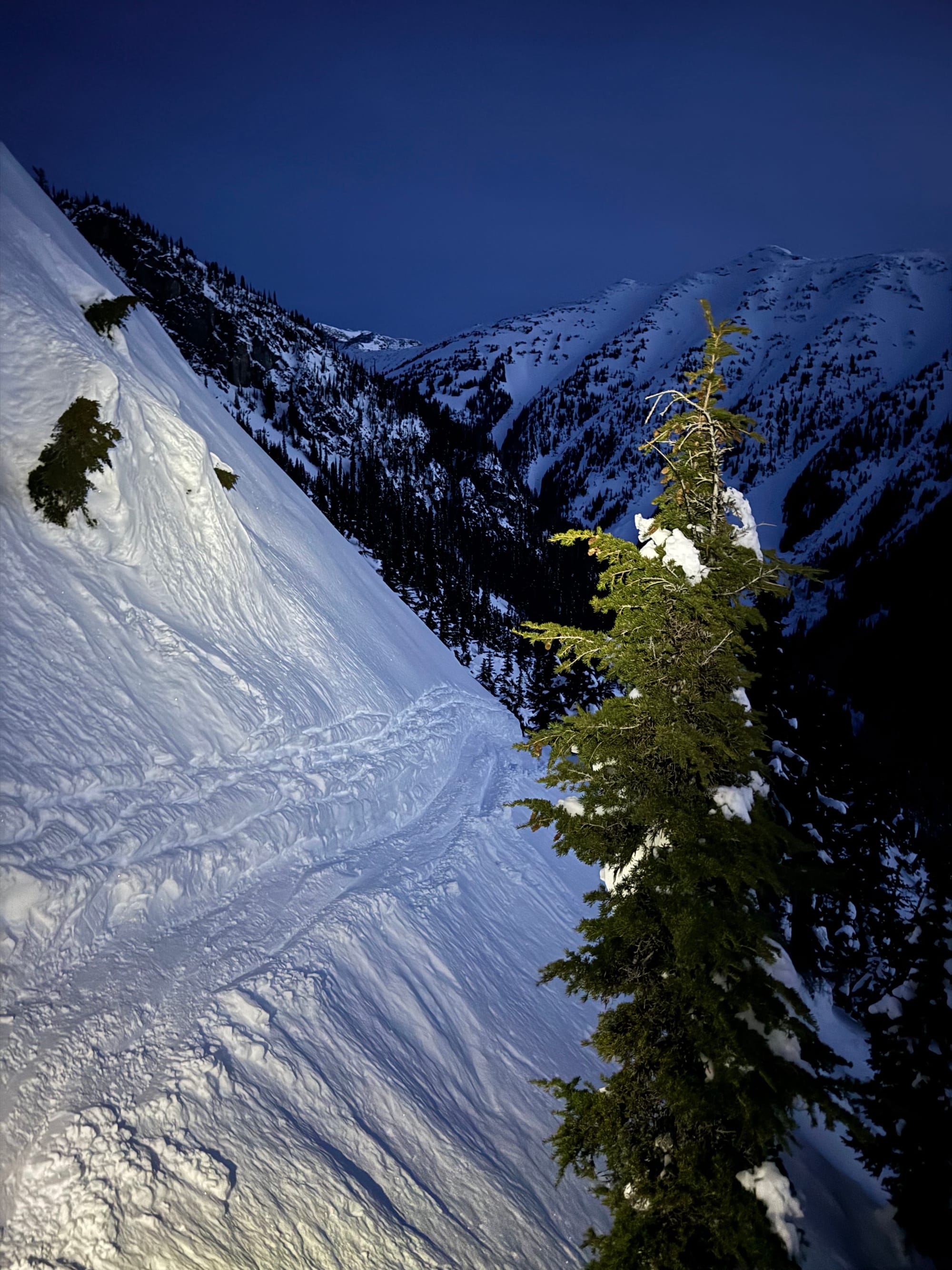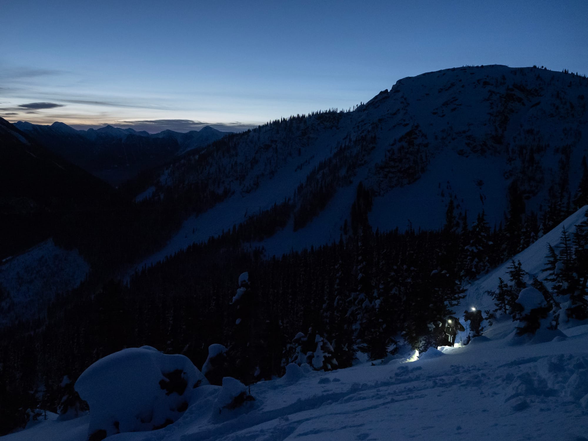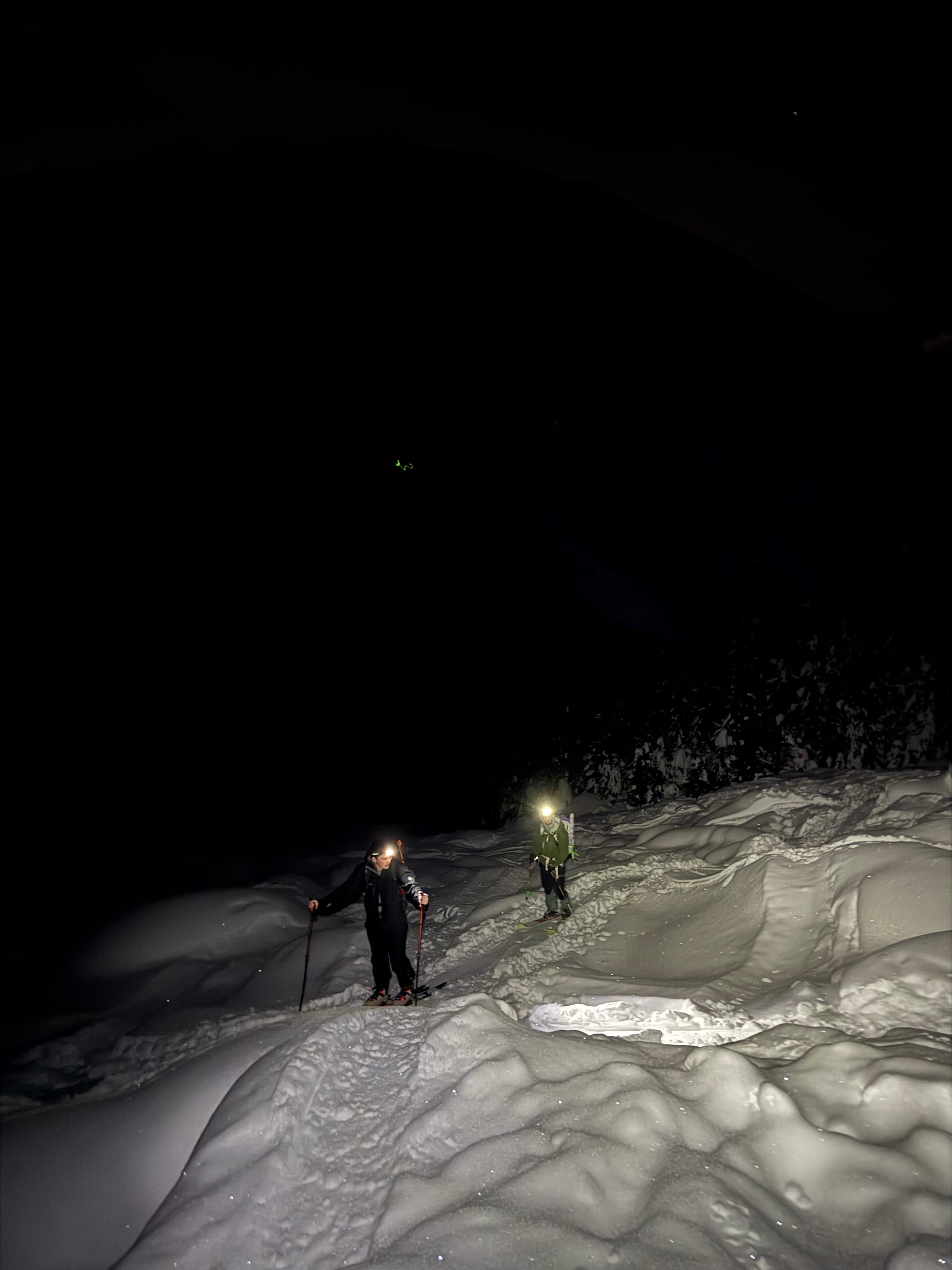 Here, routefinding becomes tricky. You want to head northwest from the lake through a steep forest, then traverse the ridge to the north of the lake. We followed someone else’s tracks, which led us a bit too far uphill, eventually reaching a traverse that was much steeper than it needed to be. At one point we decided to take our skis off and bootpack. After a few steps, one member of our party might have fallen into a waist-deep tree well and almost dropped his skis.