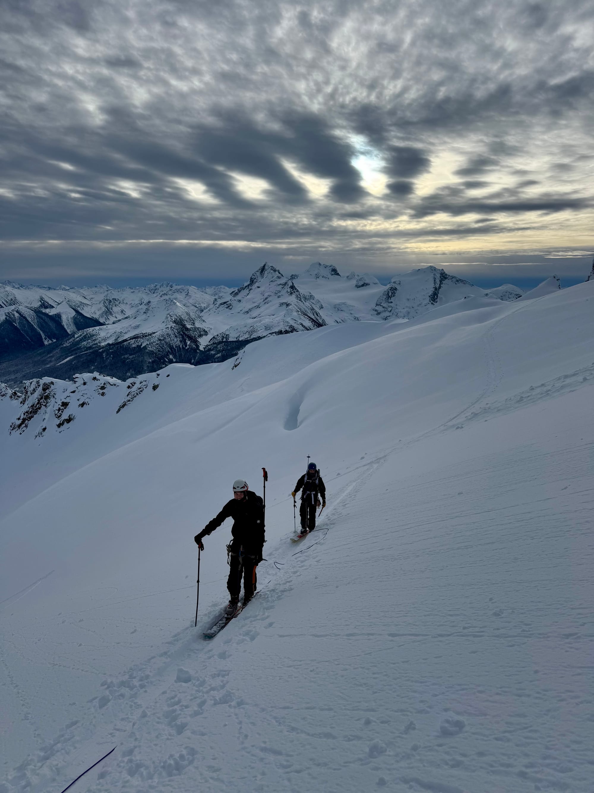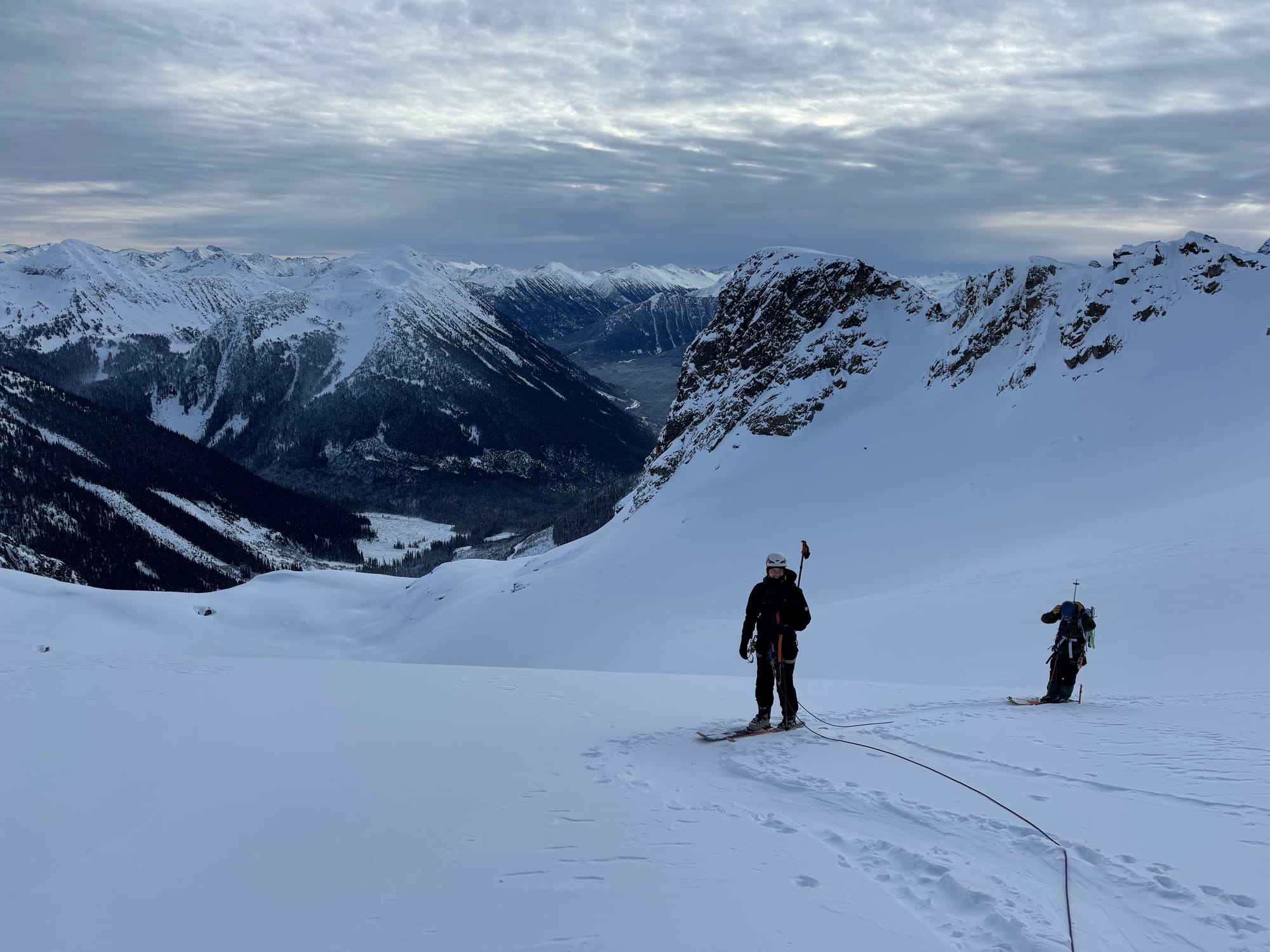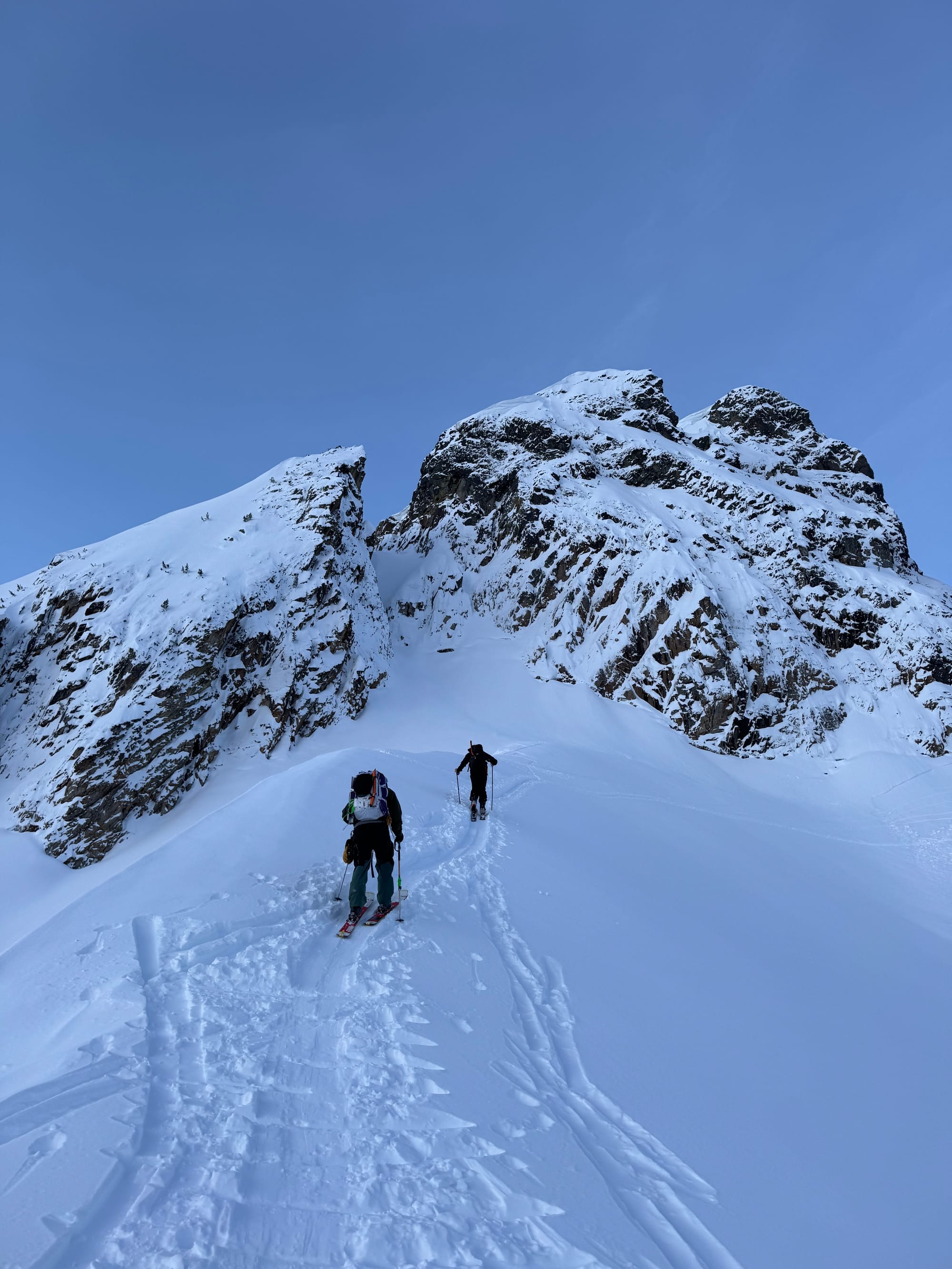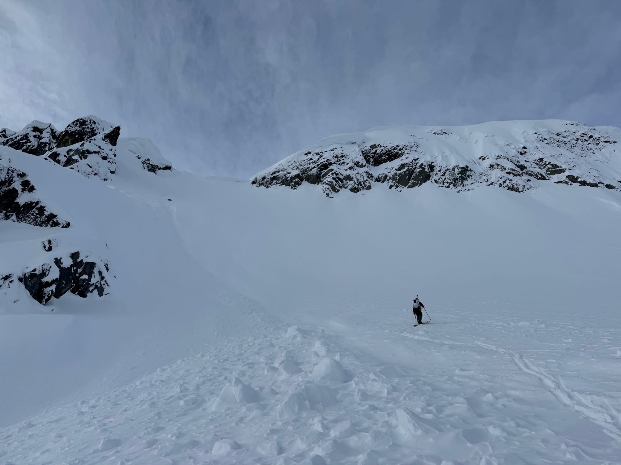 From there, the next challenge was getting to the ridge containing the summit. A long, steep slope leads southwest from the pass, allowing access. However, there were large cornices on each side of the slope, and a smaller cornice at the top blocking the ridge.