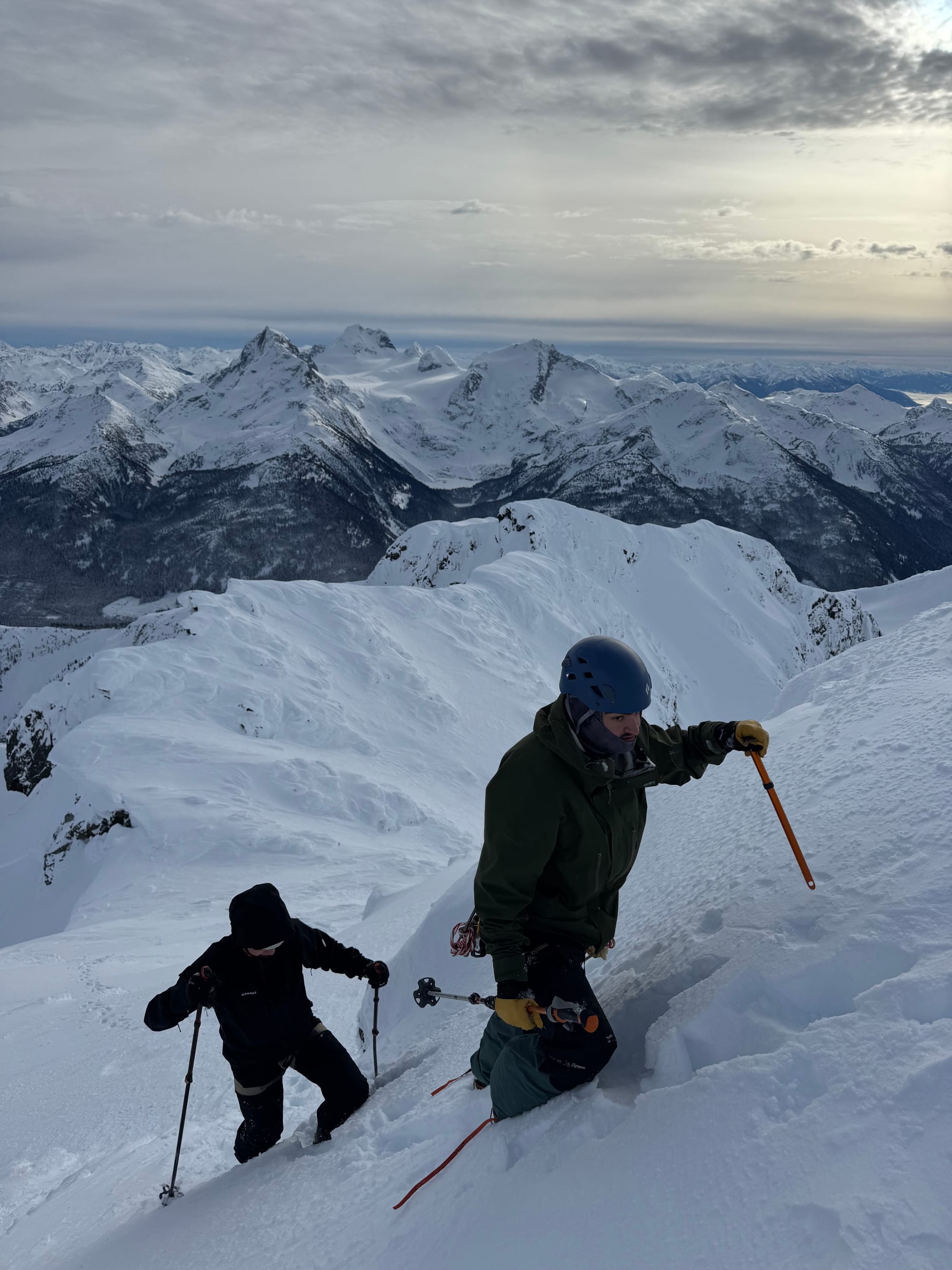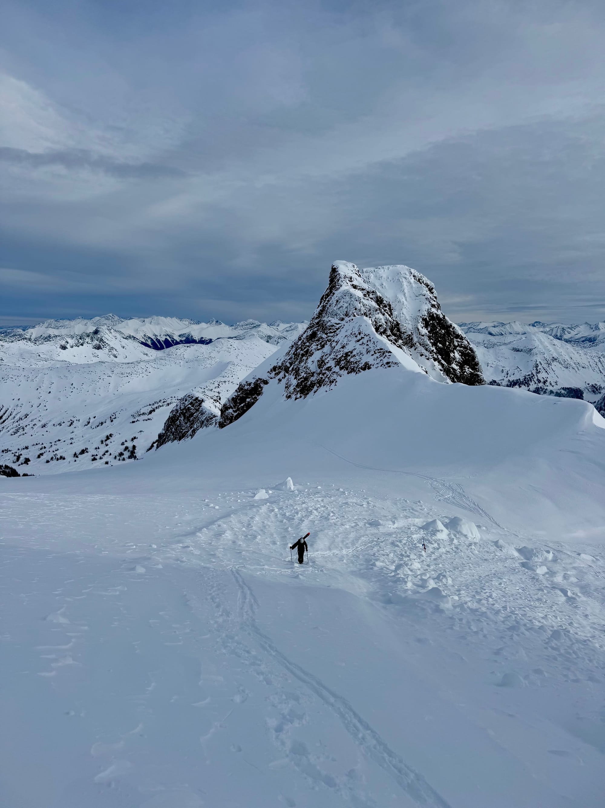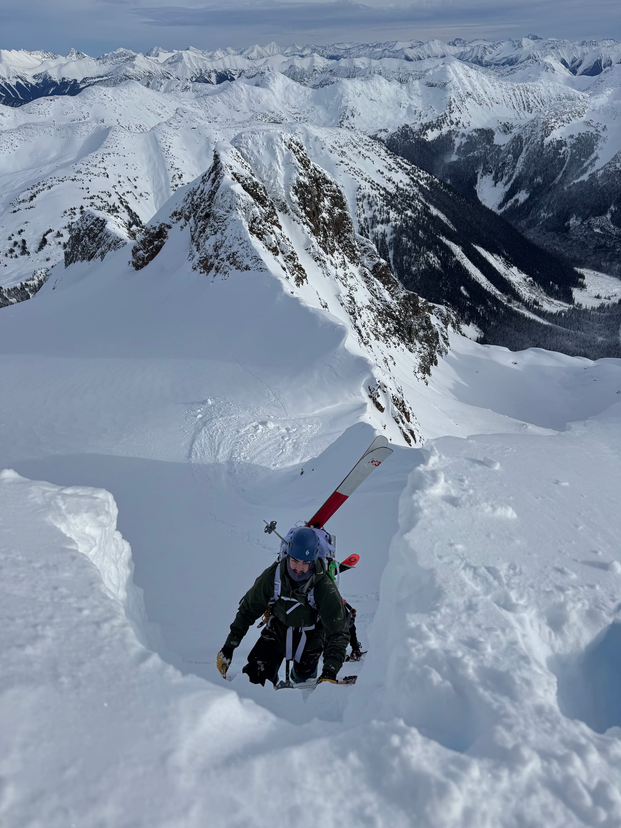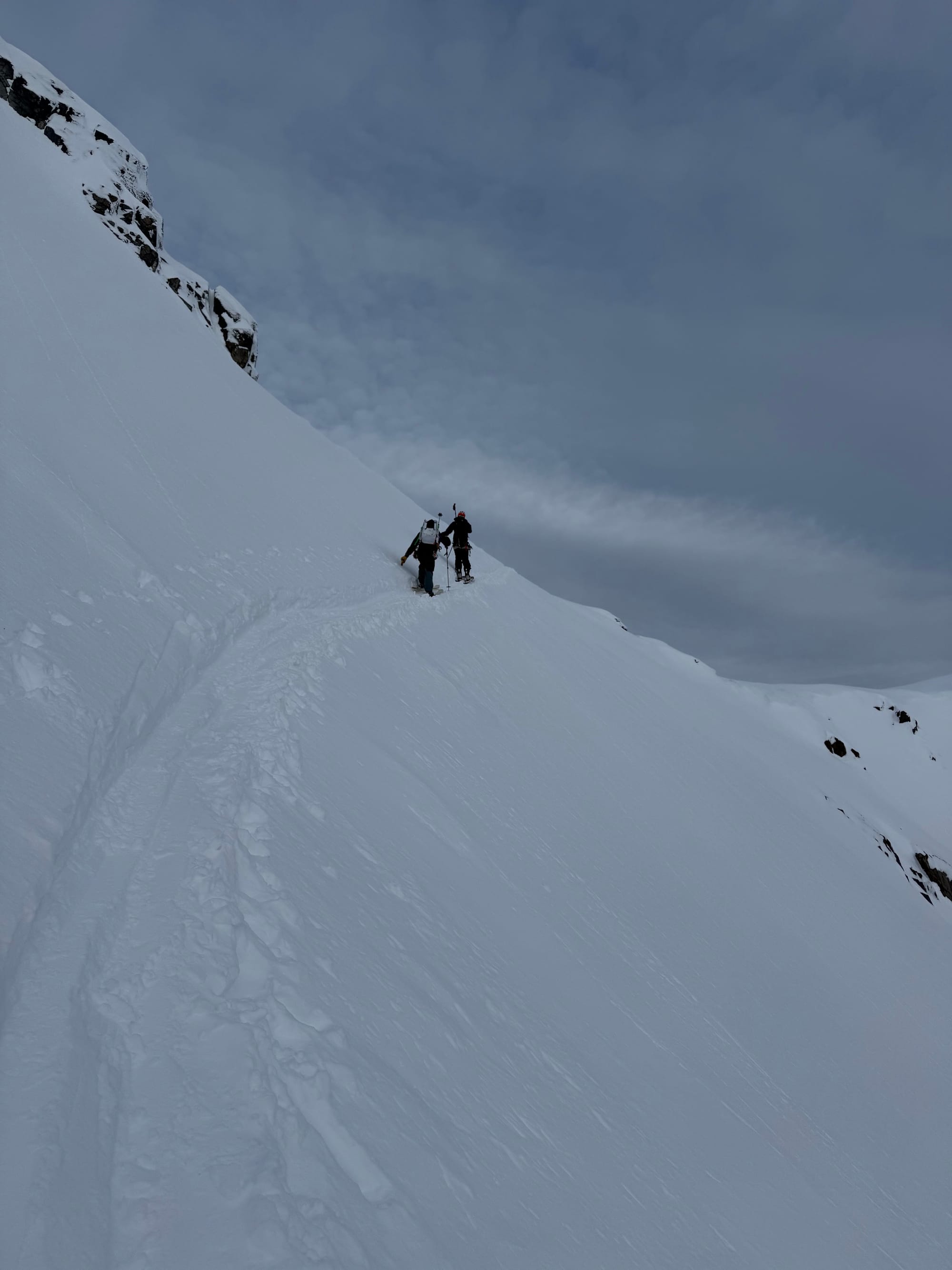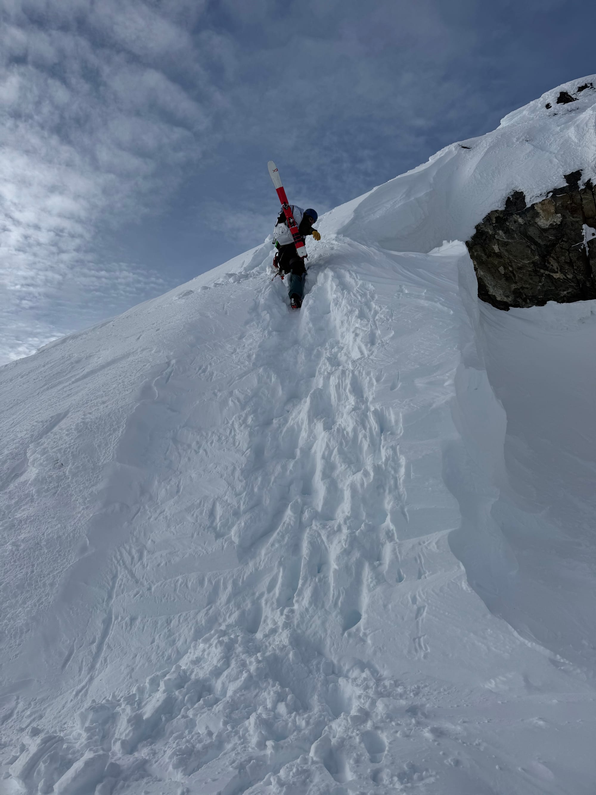 With the low avalanche danger, we decided to continue. We went straight up the middle of the slope, avoiding the larger cornices on the edges. There was no obvious way around the central cornice, but it was small and stable enough that I was able to dig a tunnel through it with my ice axe. We were on the ridge.