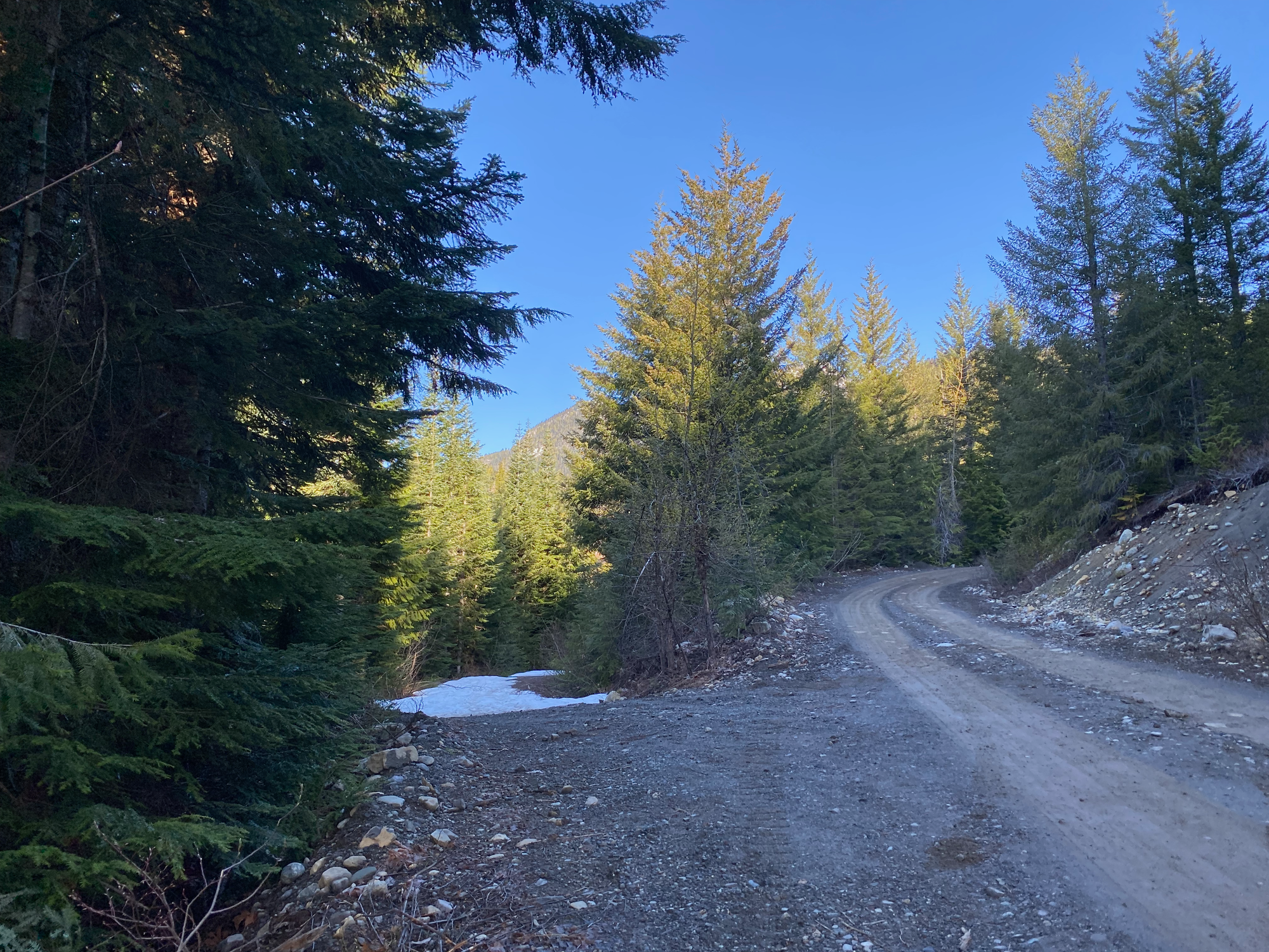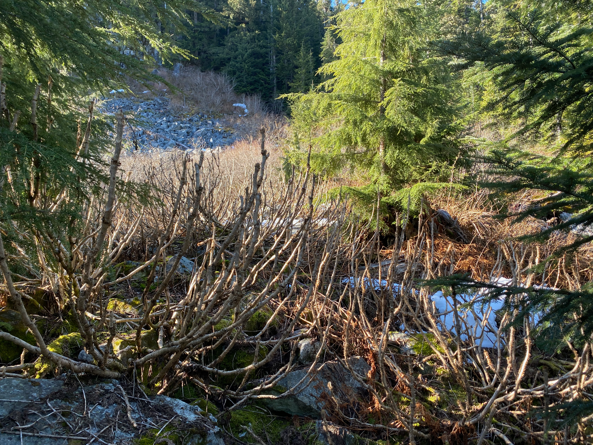 The Cloudburst Branch was still covered in snow so I parked at a pullout before the turnoff. The route follows a deactivated logging road for 300 m, passing a mine site, then branches off to the southeast on another abandoned road. In the winter there are usually tracks here, but all the snow at this level had melted, so this road was an alder-choked mess. After about 100m the route leaves this road, but the turnoff isn’t obvious. Steven Song’s GPX track was very helpful here. I see why no one does this route in the summer!