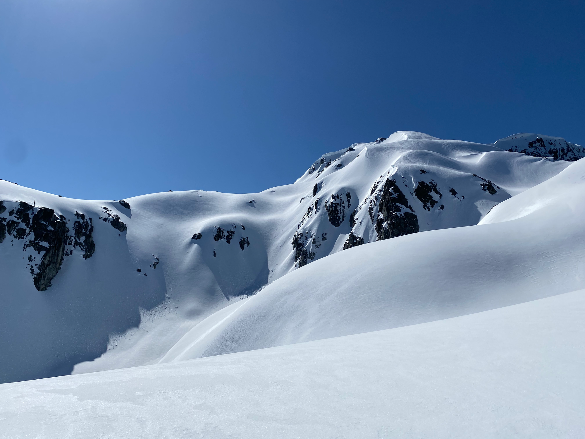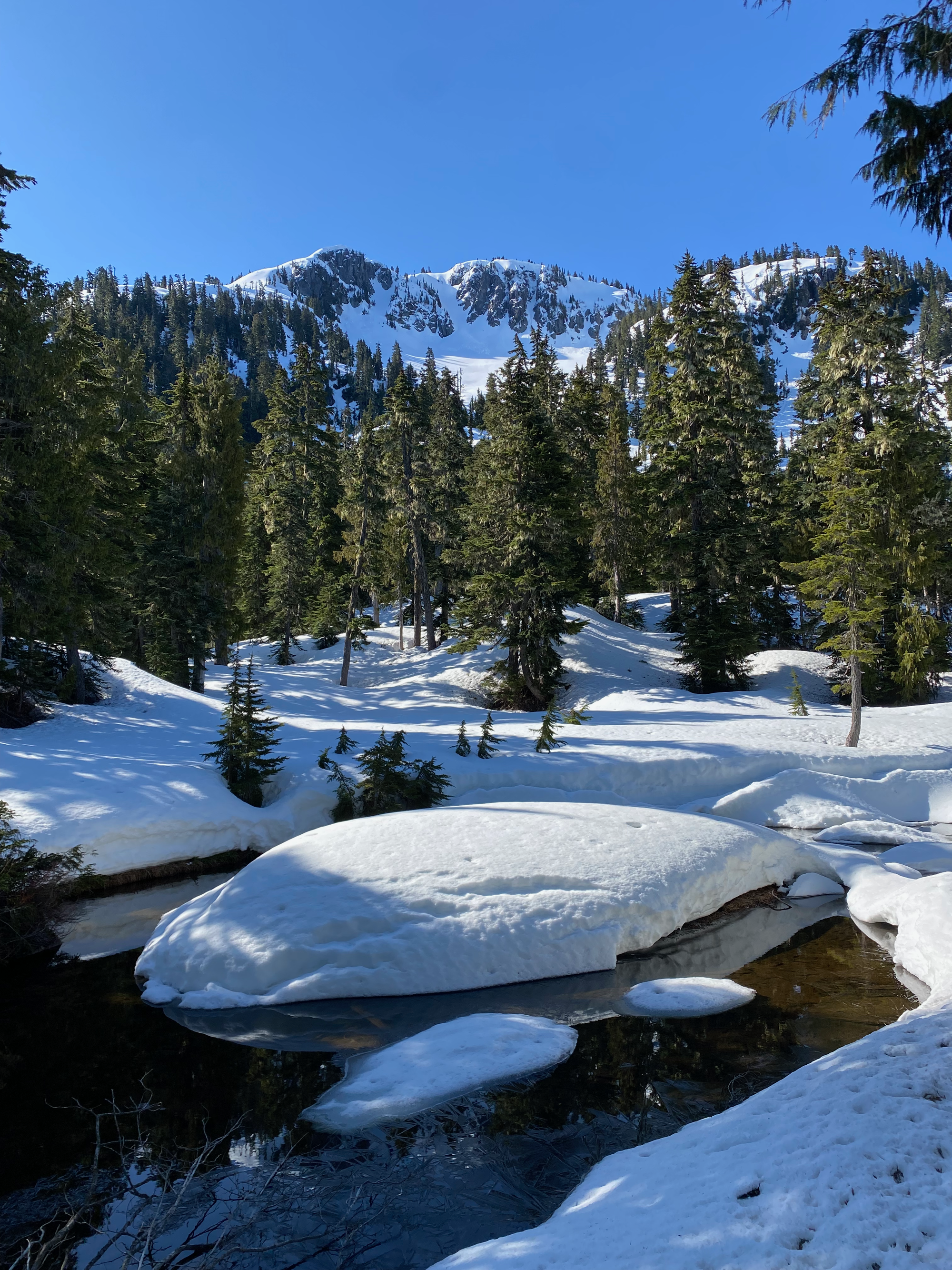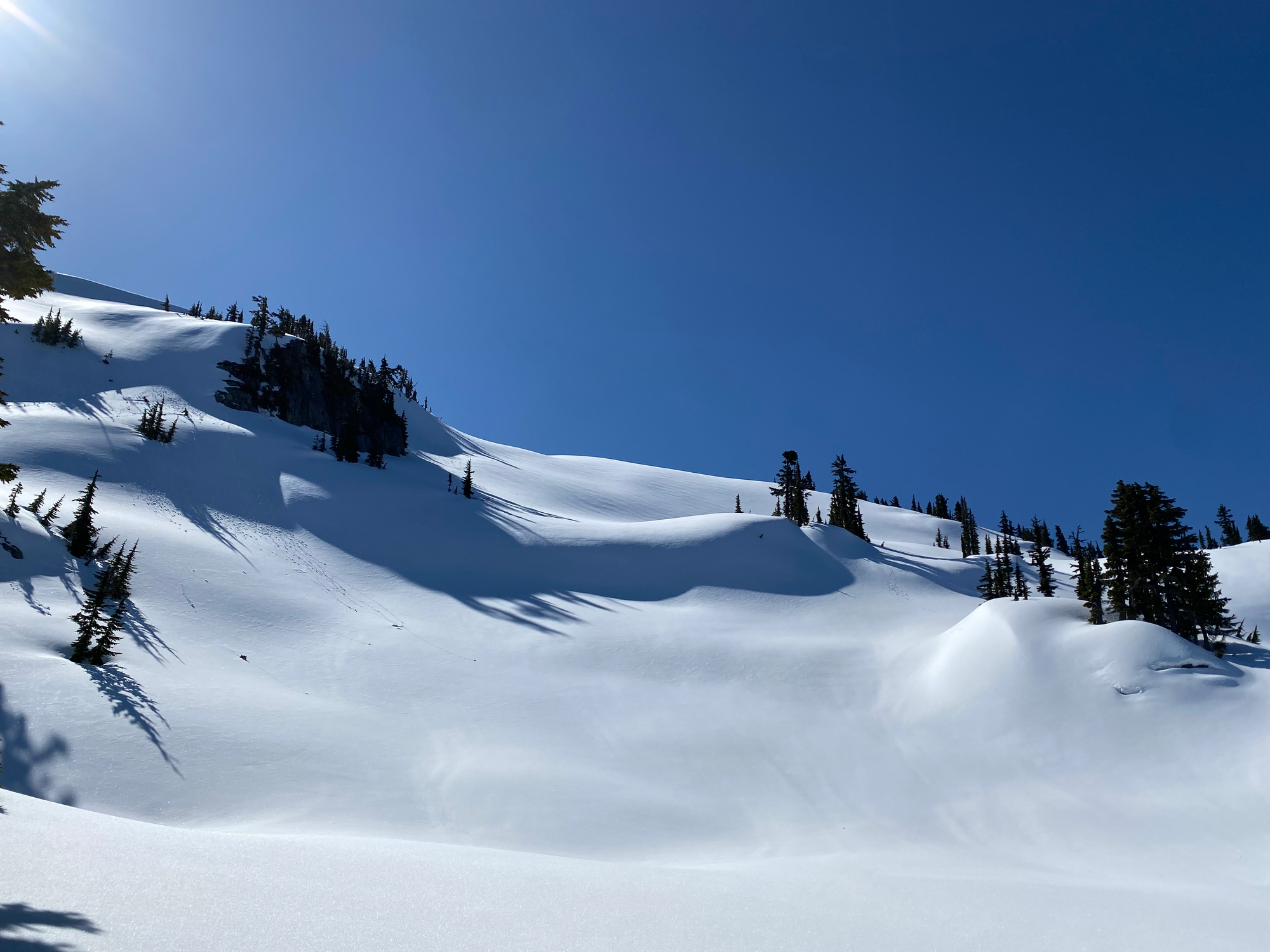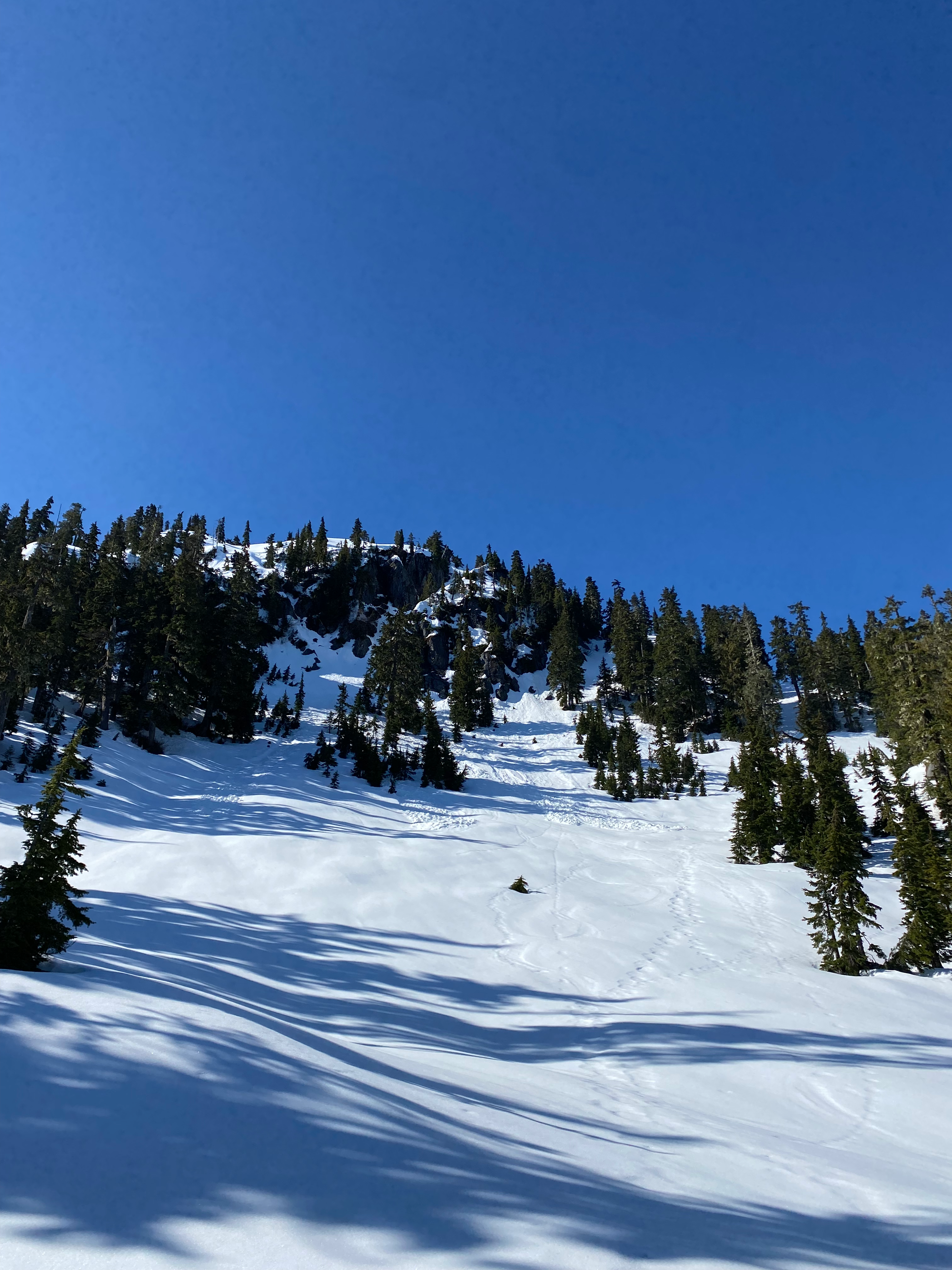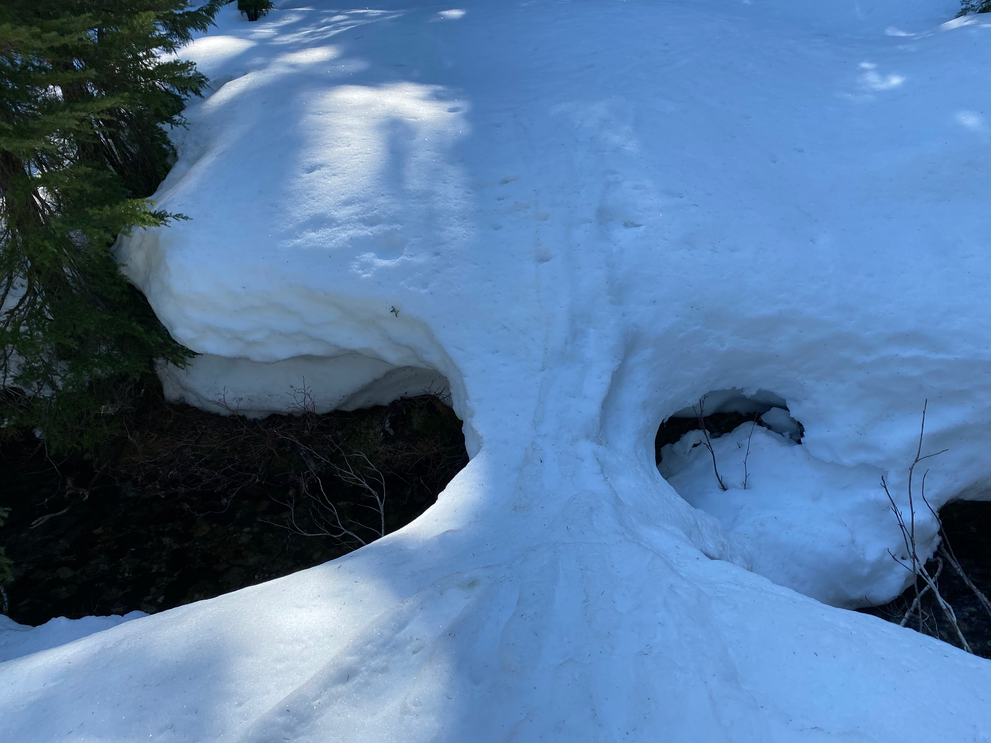 It was warming up so I didn’t want to linger. The snow was much softer on the descent. On one southeast-facing slope at 1600m I heard a whumphing sound, a sign to get off the mountain quickly. It was a relief to get below treeline. The bushwhack was annoying, but it was over quickly, and I drove home.