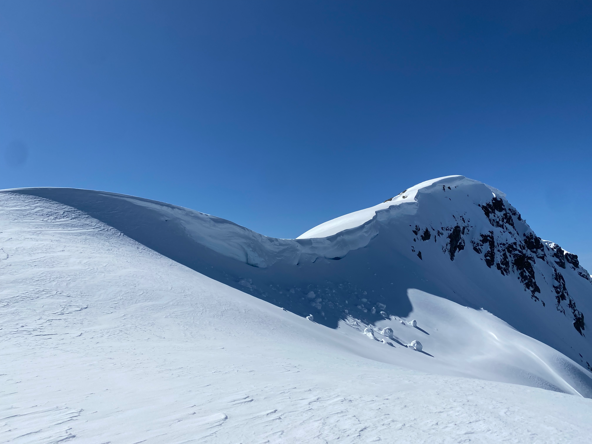 At about 1200 m the route entered a bowl, then climbed out of it into the alpine to the southwest. I kept following some tracks until they disappeared, then picked a route to the summit ridge. The route ascends a series of slopes and ridges to join the summit ridge at its northern end. There was one section where an ice axe was needed, but I got away with snowshoes for the ascent and descent. The ridge was heavily corniced on its western side. Once on the ridge, I walked along significantly softer snow to the summit, which has two green radio repeater towers.