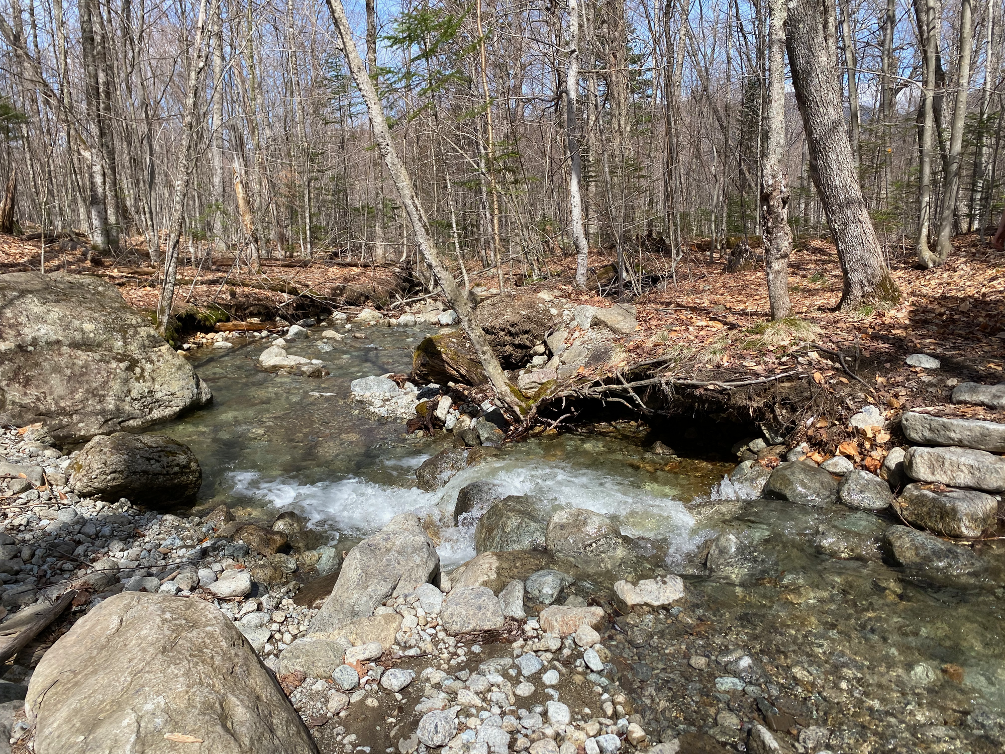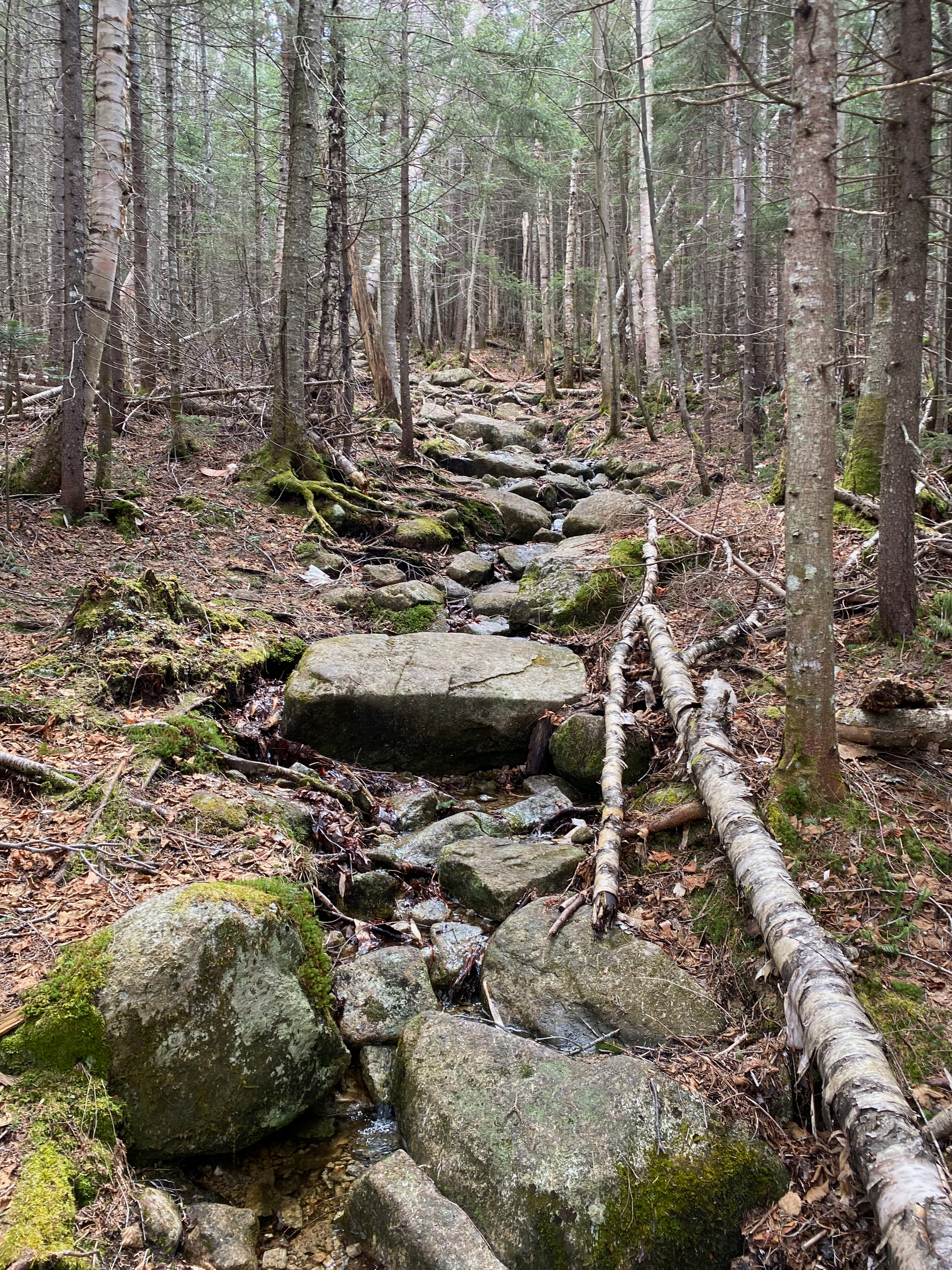 We climbed over a small sub-summit called "Pough" before reaching the peak of South Dix. At one point the snow covered a small creek bed. For about five or six steps I was postholing with each step!