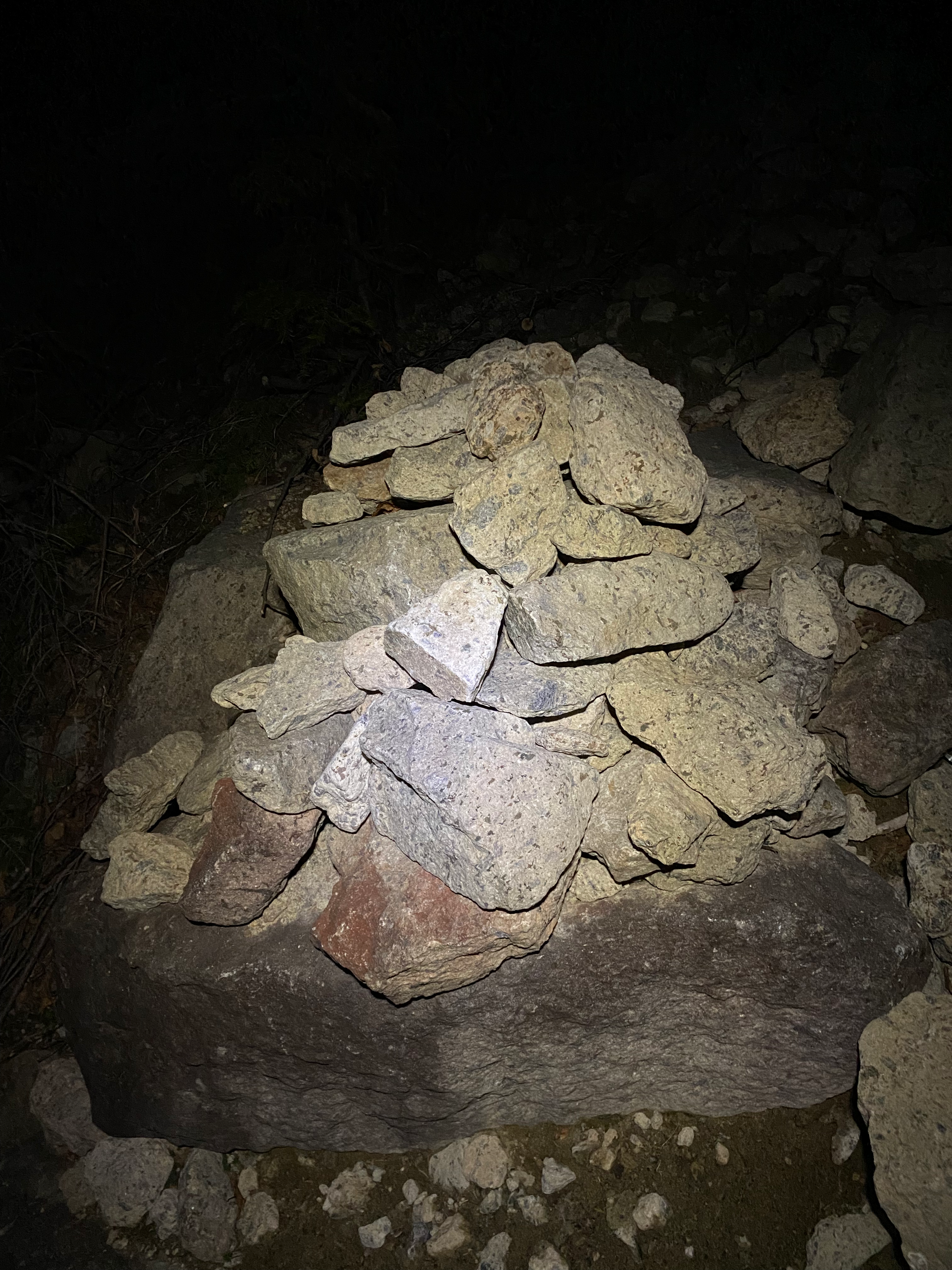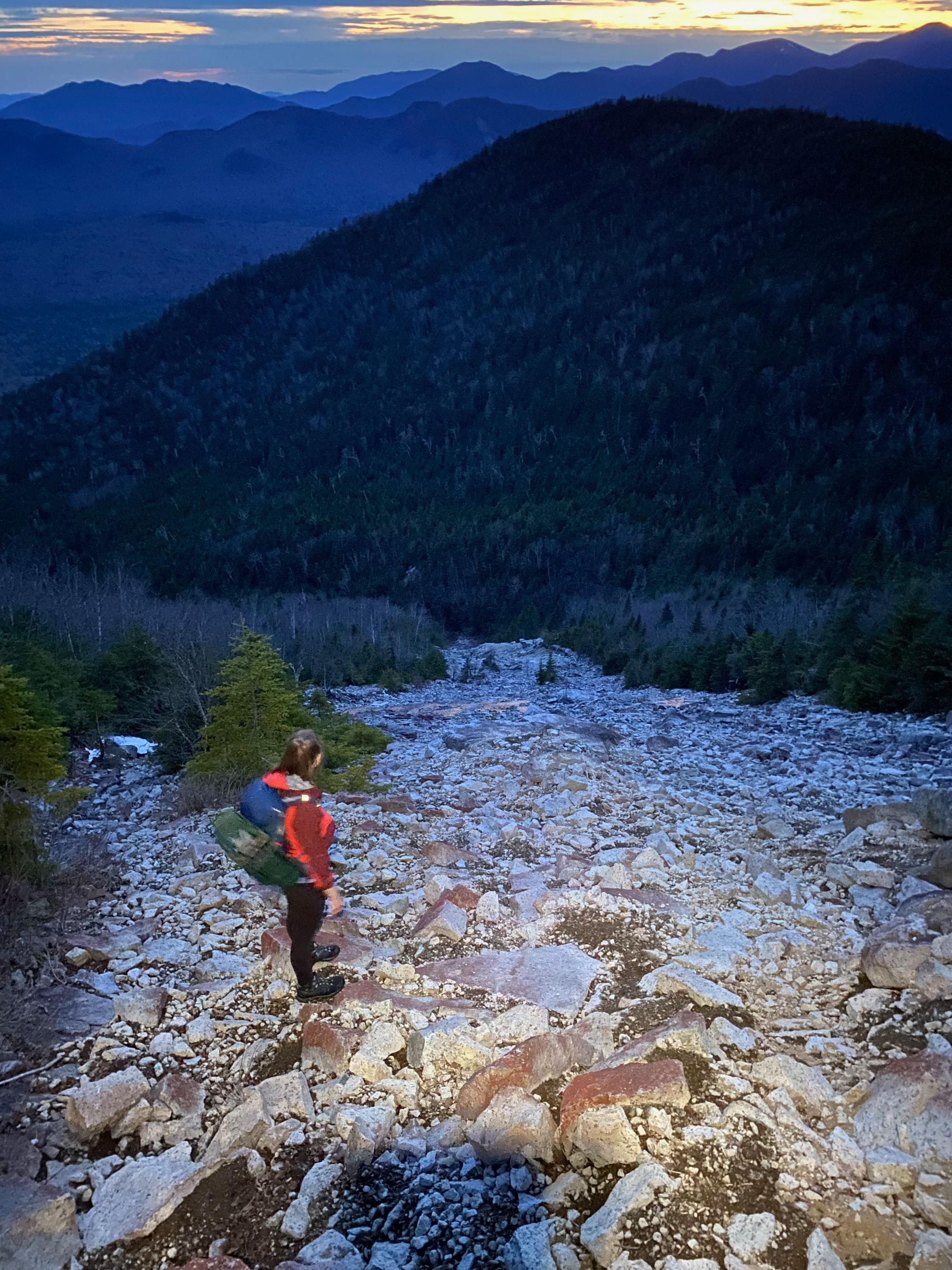 After this, we soon reached the top of the Macomb Slide proper, a mess of rocks, gravel, and dirt. We hugged the left (south) side for most of the descent, using bushes and larger rocks to steady ourselves in the slipperier sections. As we descended, the sun set behind the mountains, and it got darker.