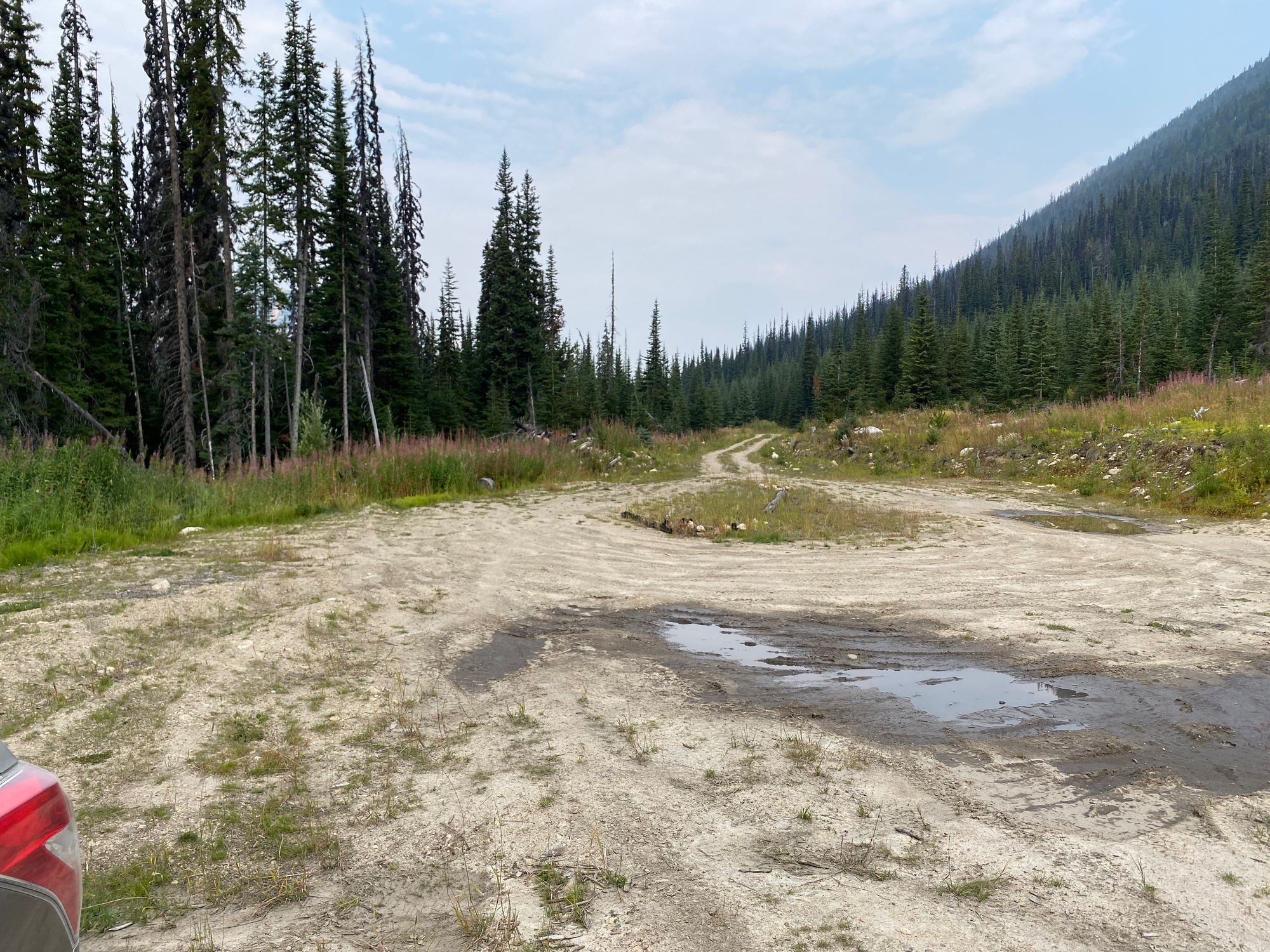 Gott Peak is accessed from the Blowdown Creek FSR (instead of the Gott Creek FSR further along the Duffey Lake Road). The Blowdown Creek FSR was in good shape for about 10.5km. The road forks at about 1670m elevation, and we took the rightmost fork (southeast), which was in the best shape. This led to a large clearing with some wooden stakes and a faint trail leading east. The GPS track I downloaded was about 150m further uphill, but we decided to explore the trail here to see if it connected. Instead, the trail followed Blowdown Creek through some muddy patches, and faded out after a couple hundred metres, so we turned around.