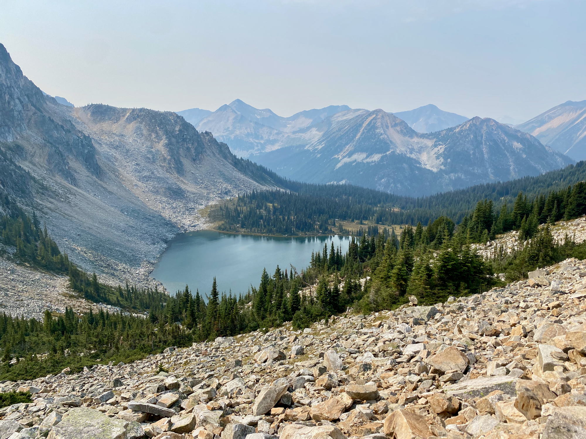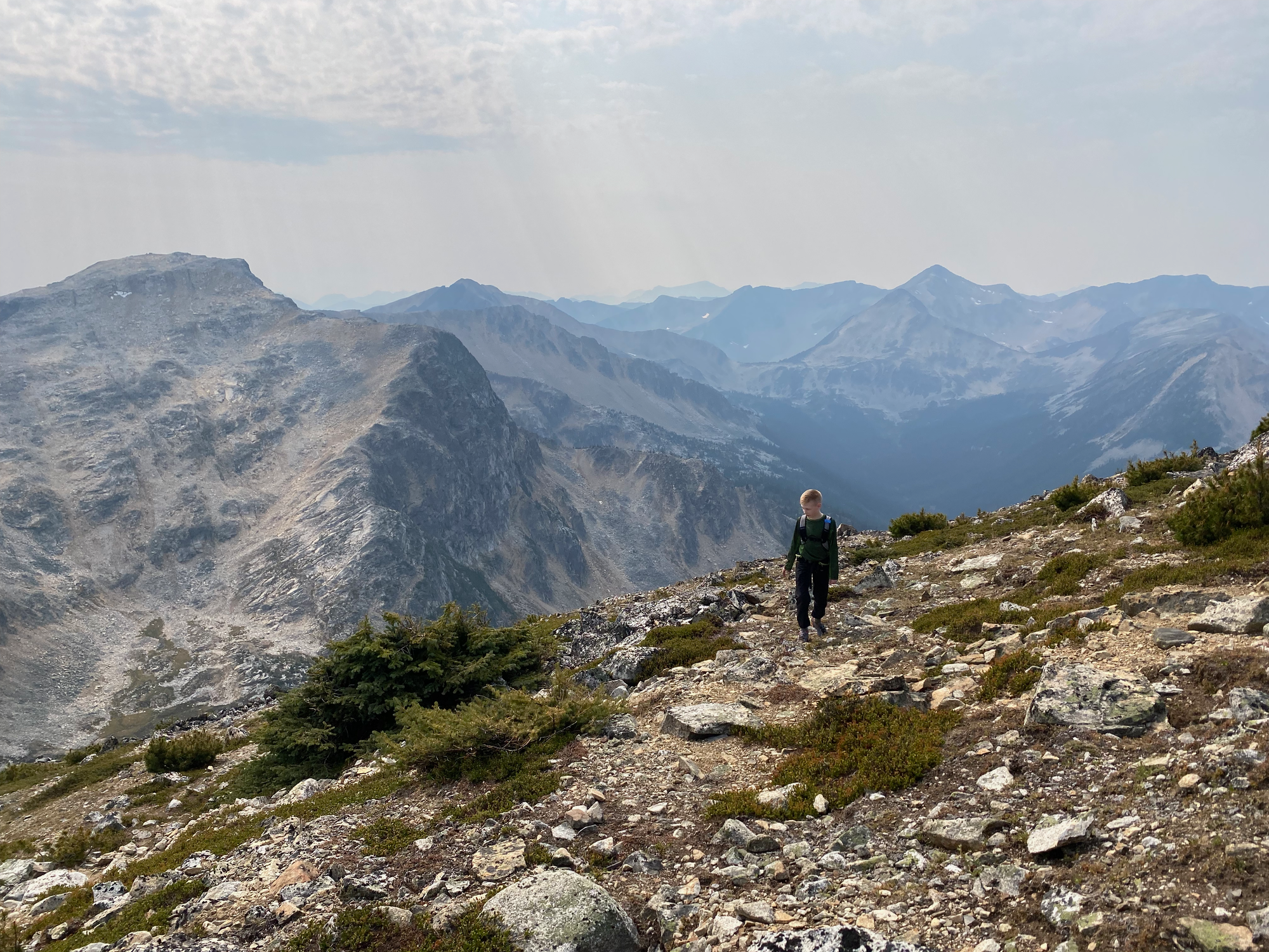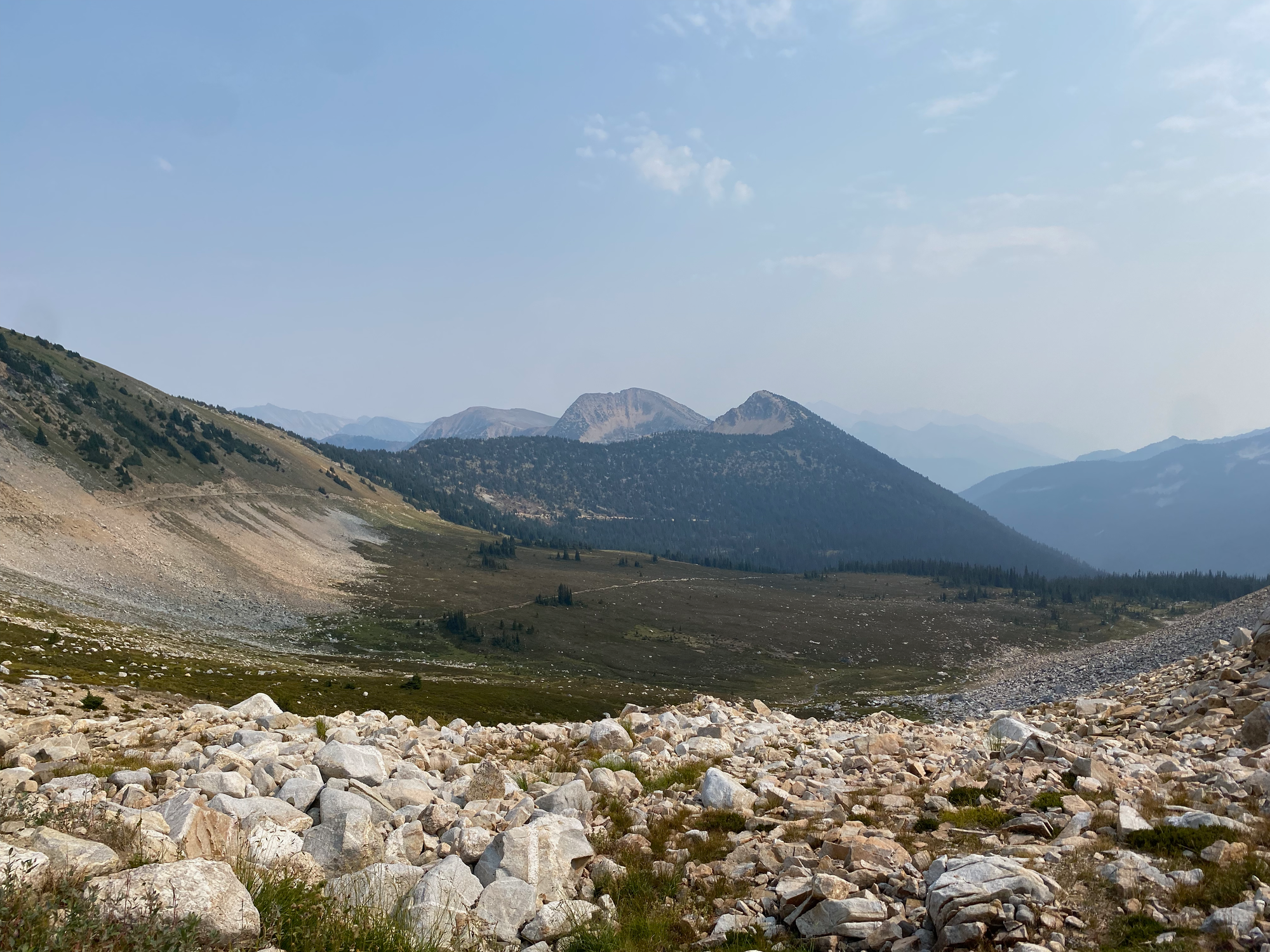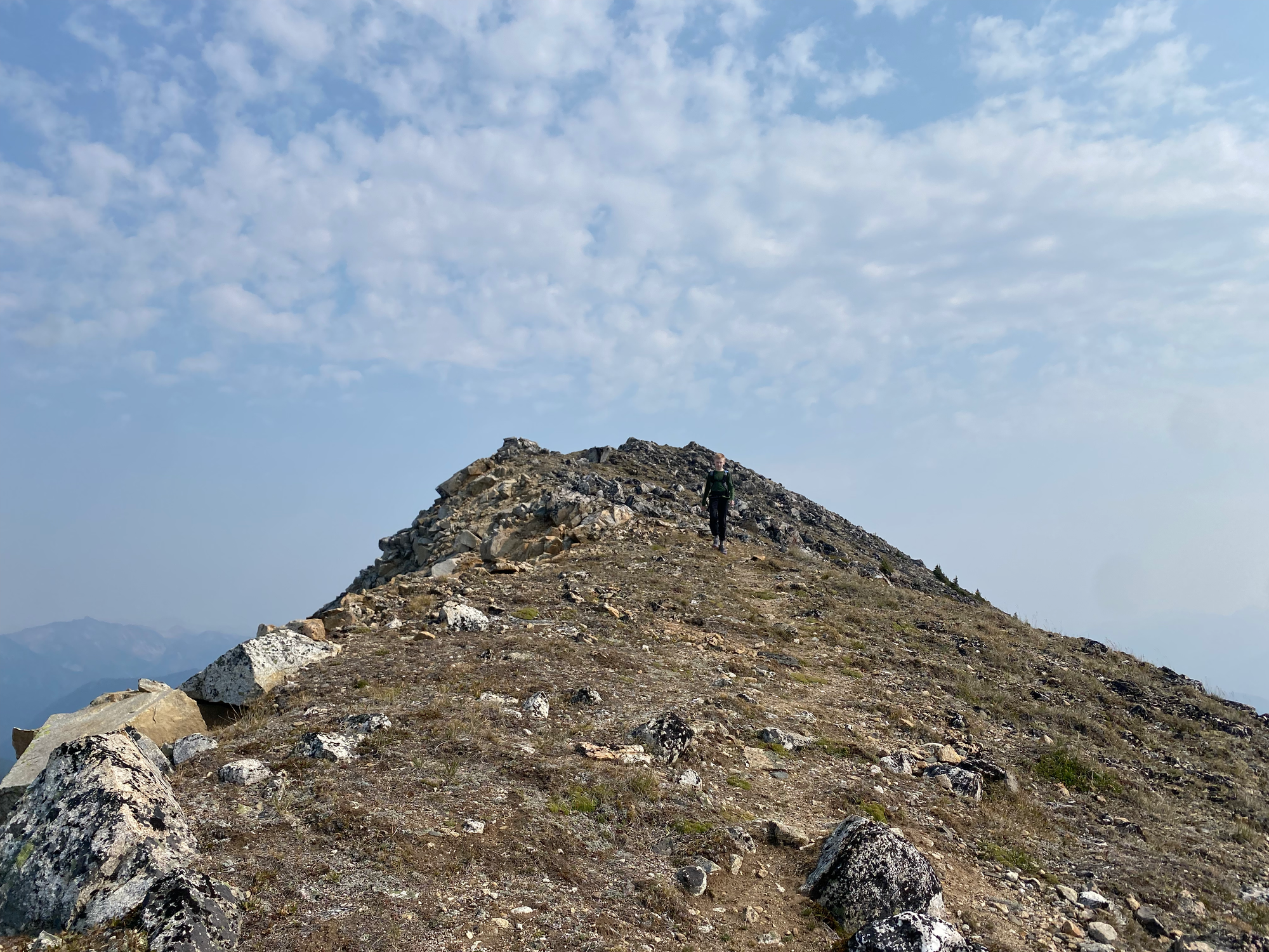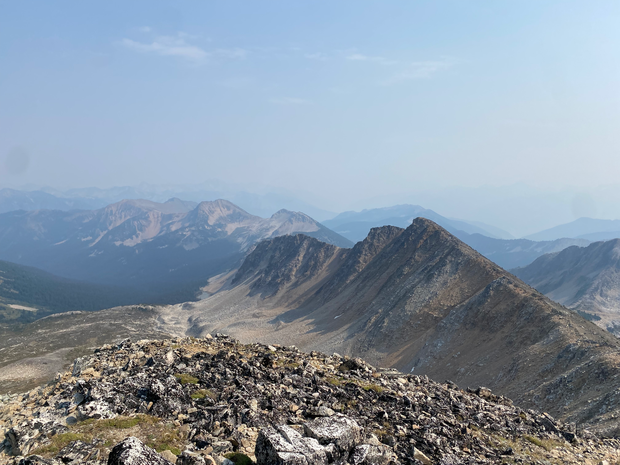 We continued north, following a faint trail up the slopes of Gott Peak to a false summit. From here we had panoramic views of the nearby peaks, although wildfire smoke made the surroundings hazier.