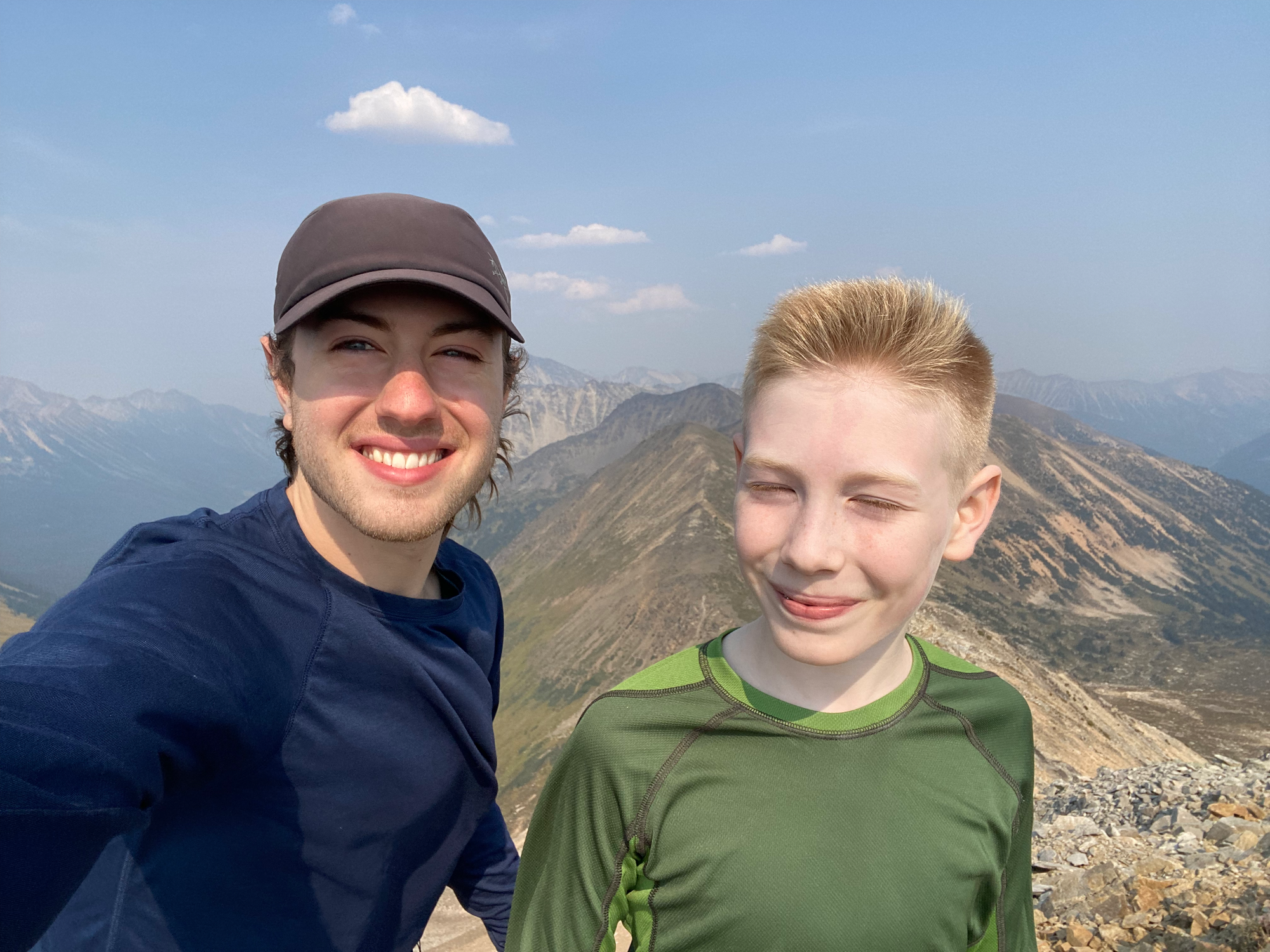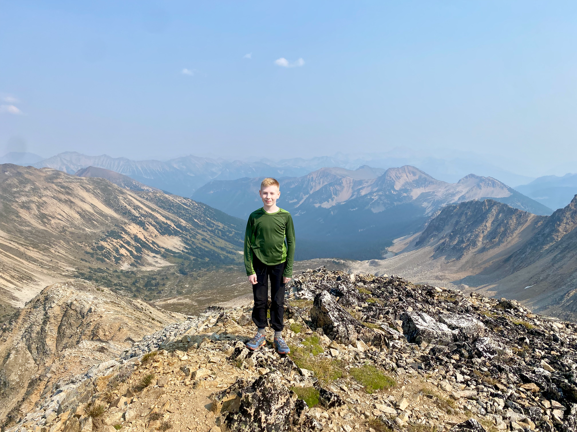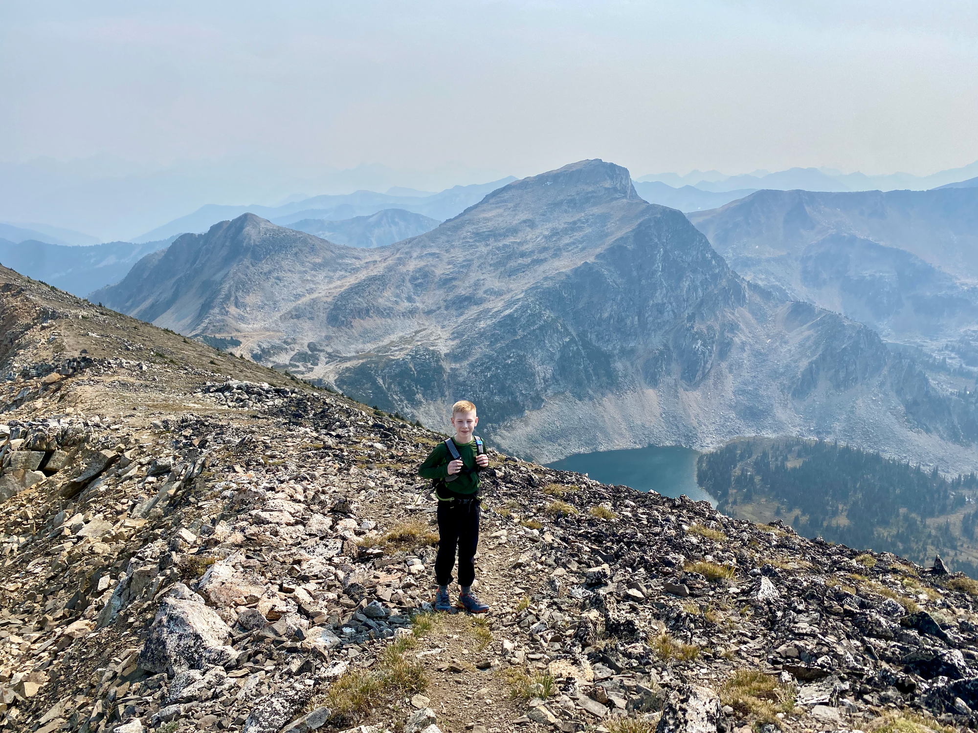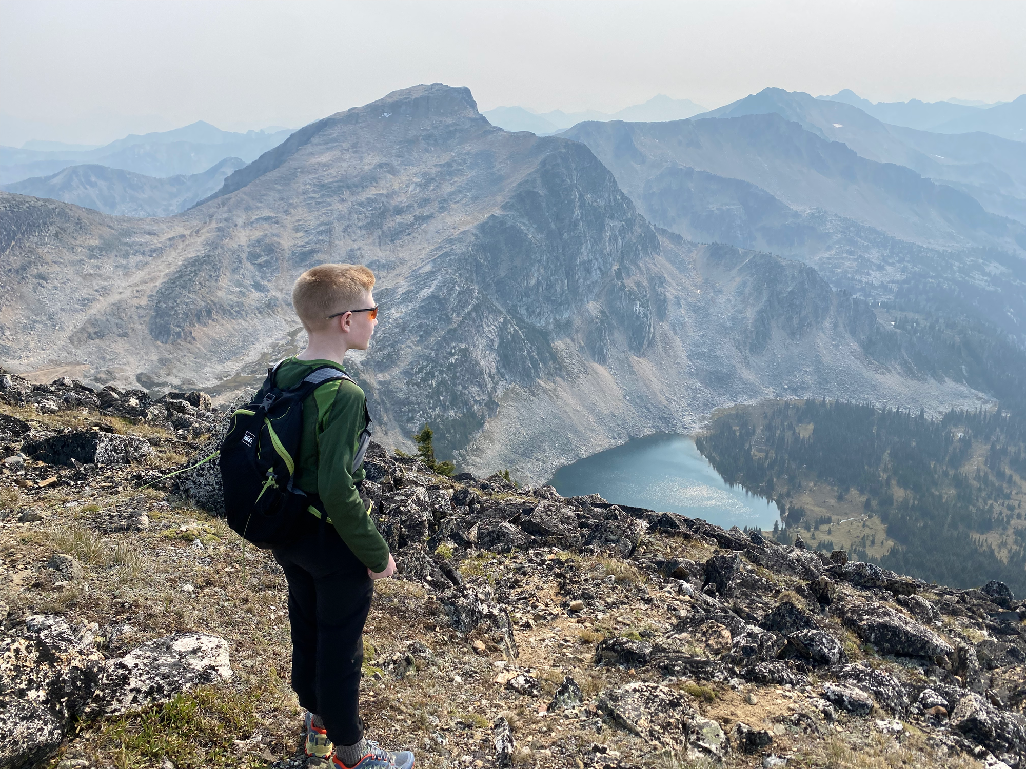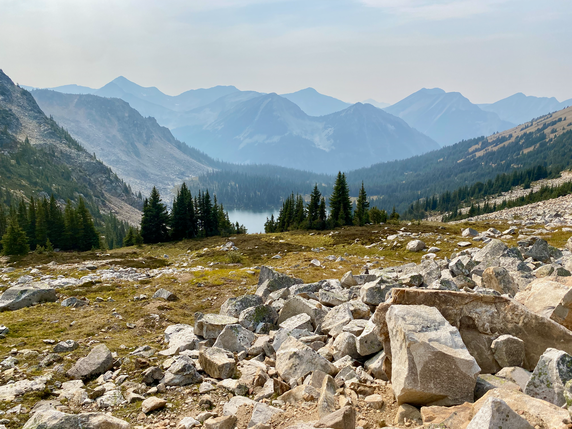 We continued north, following a faint trail up the slopes of Gott Peak to a false summit. From here we had panoramic views of the nearby peaks, although wildfire smoke made the surroundings hazier.