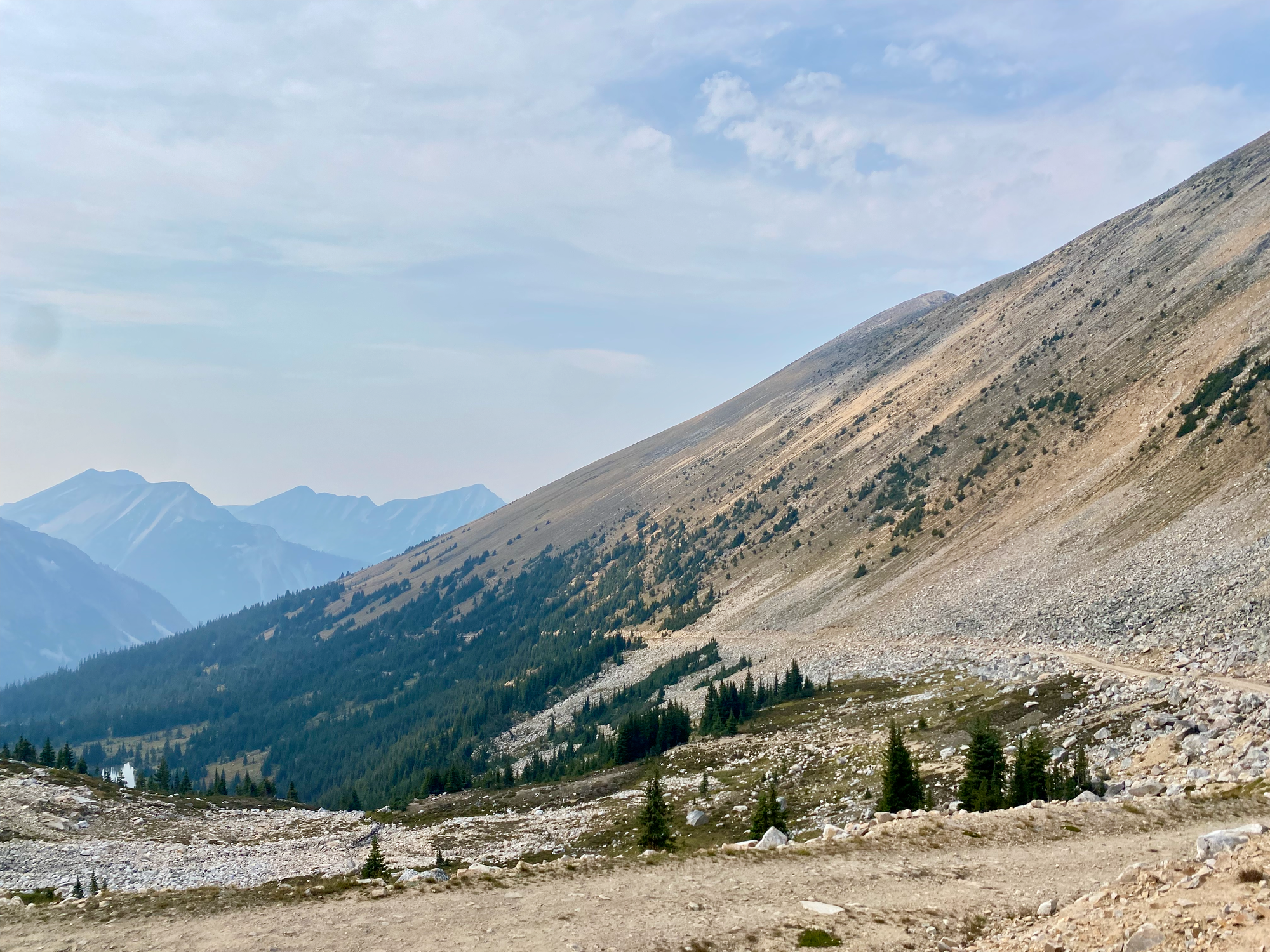After about three kilometres, we emerged above treeline, giving us views of Gott and Gotcha Peaks and Blowdown Lake. After one final switchback, we reached Blowdown Pass. The road continues east from here - it once led to a mine - but it has been deactivated for motor vehicles. This is one of the western access points to the Stein Valley.