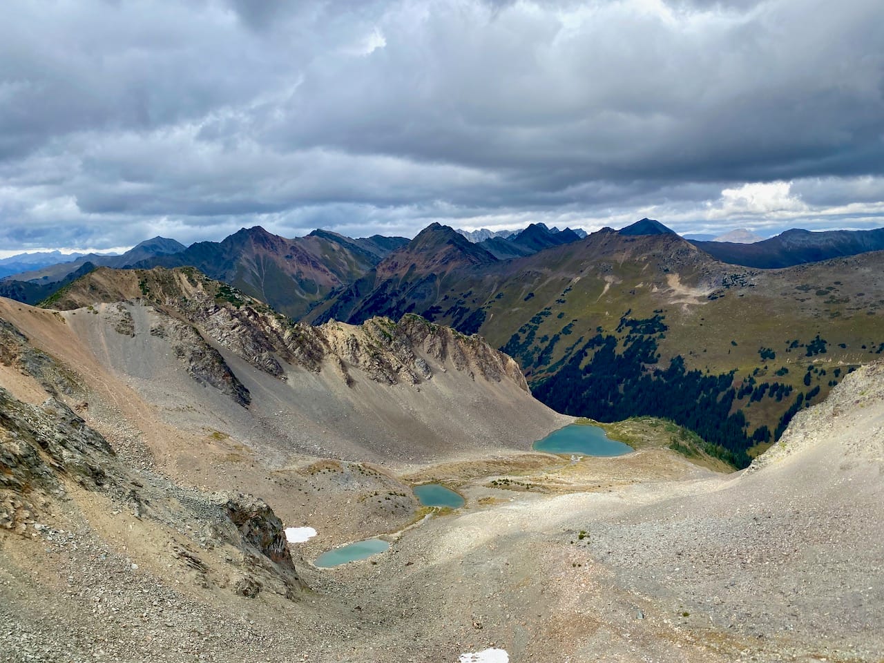 Some mining ruins could be seen in the basin below me but I didn’t want to explore. The wind was picking up and the clouds on the horizon were darker.