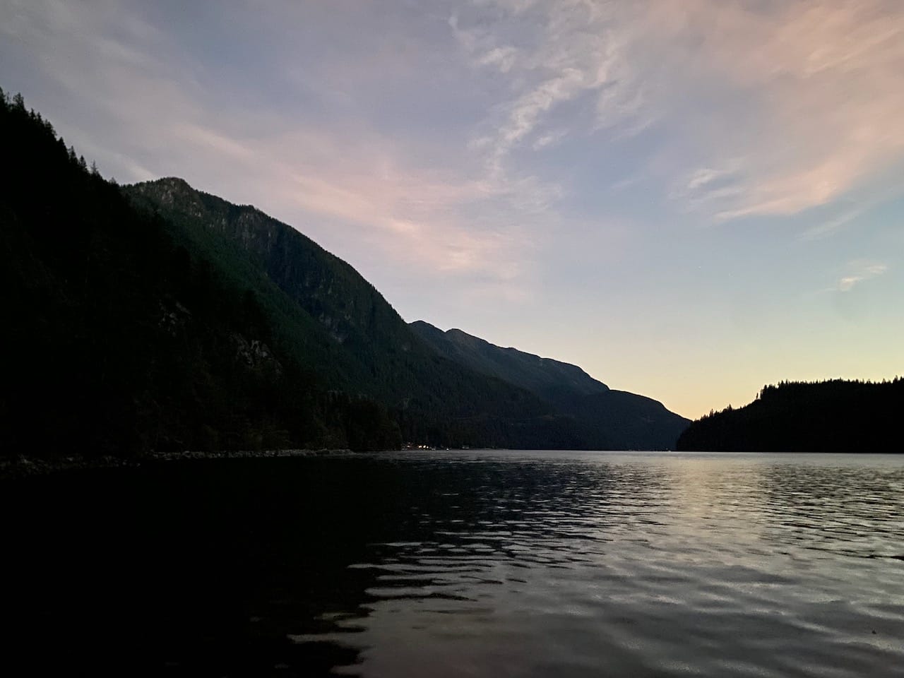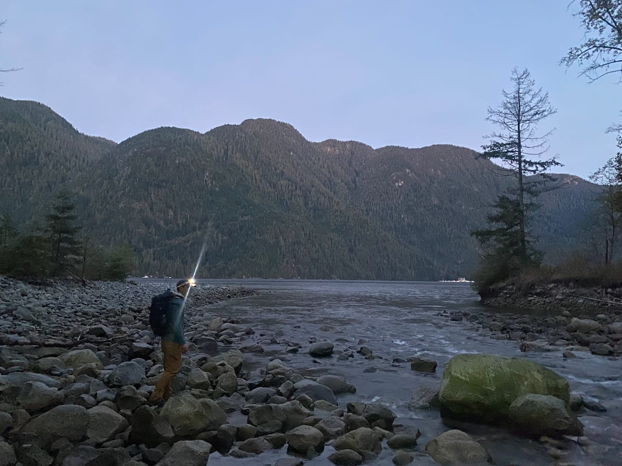 The steep snowy sections were tricky for Paul with one snowshoe, but somehow he managed it. We stayed closer to the IAT route on the descent, stumbling across a corduroy road and the remains of a logging camp. The sun set on our way down, and we left the IAT in total darkness. This made the scrambling sections more challenging. We ended up on another trail closer to the falls, descending one slippery section after another. After a short section of bushwhacking, we looked out onto a dark void. In our exhaustion, it took us a few seconds to realize that it was the ocean; we’d reached the north beach. We set up camp at the campsite, then canoed back to Deep Cove the next day.