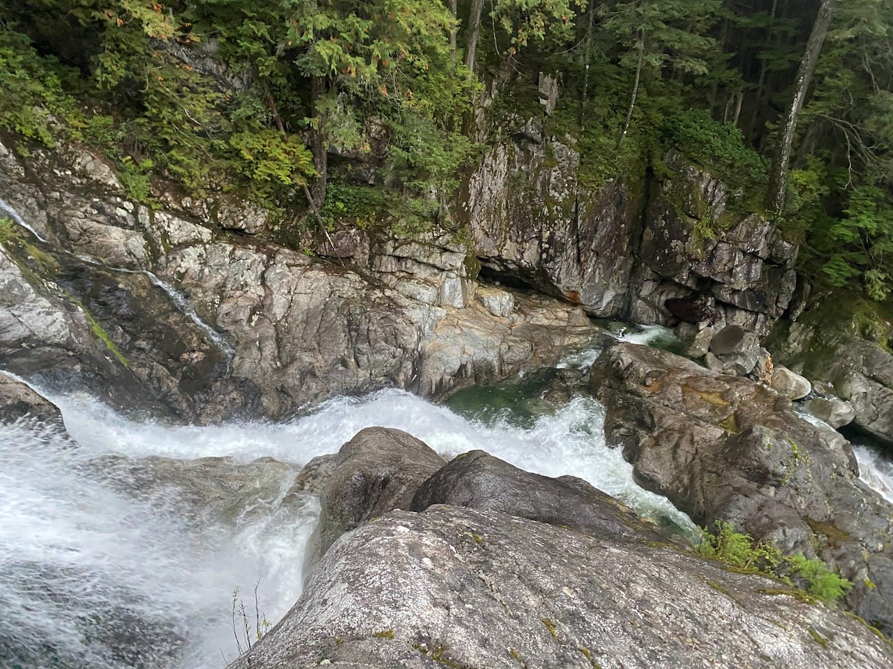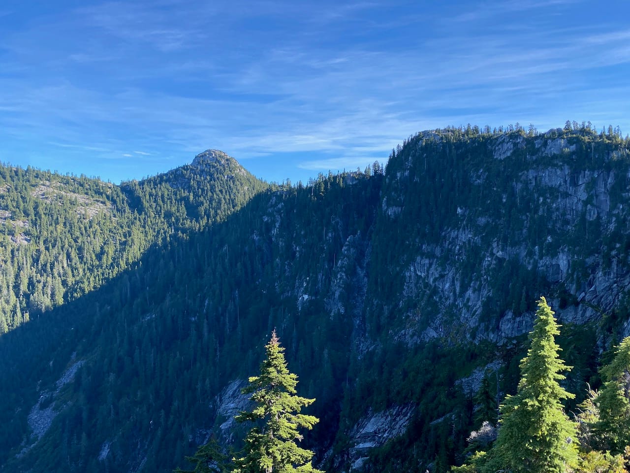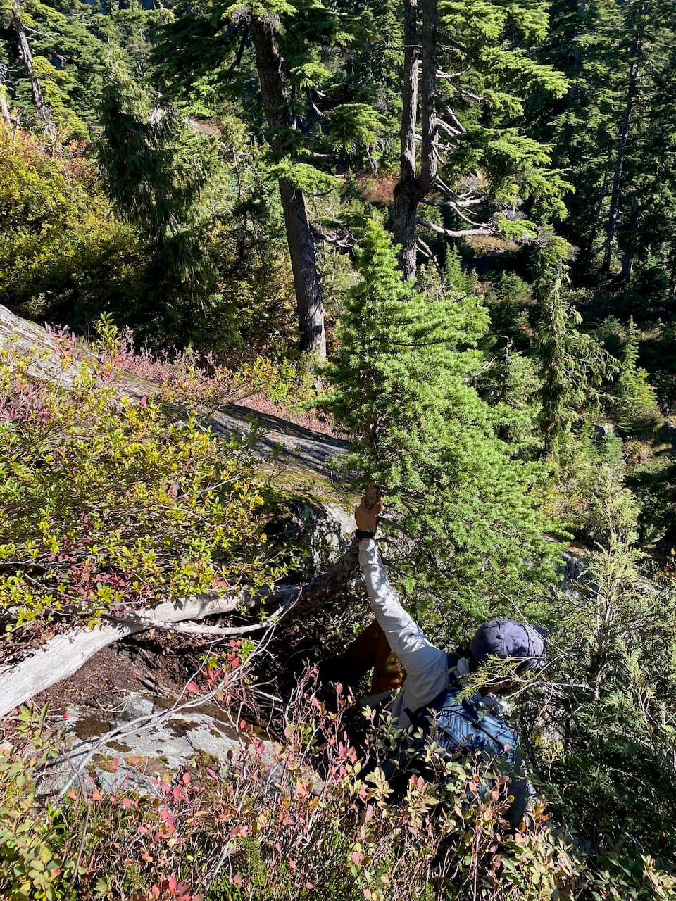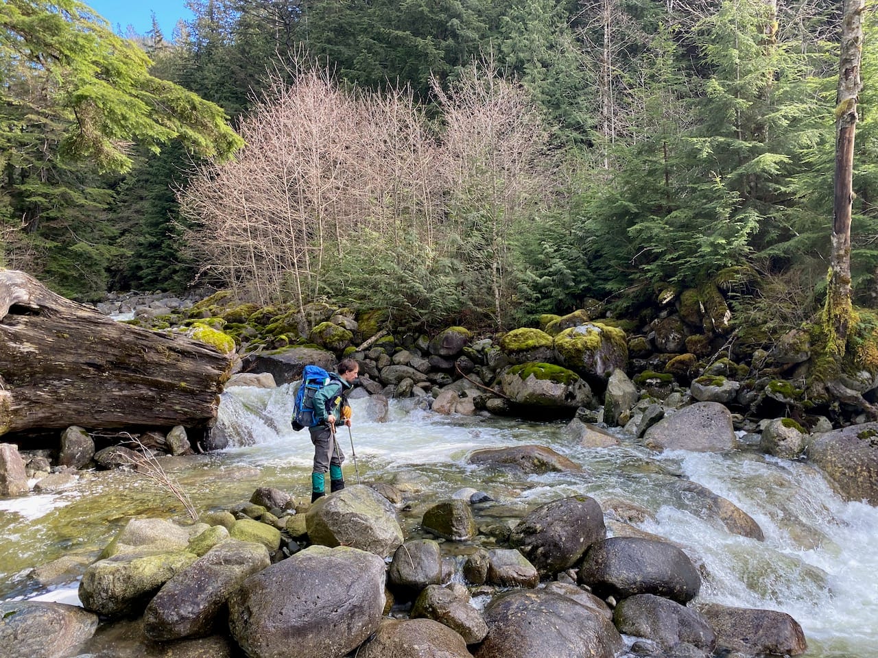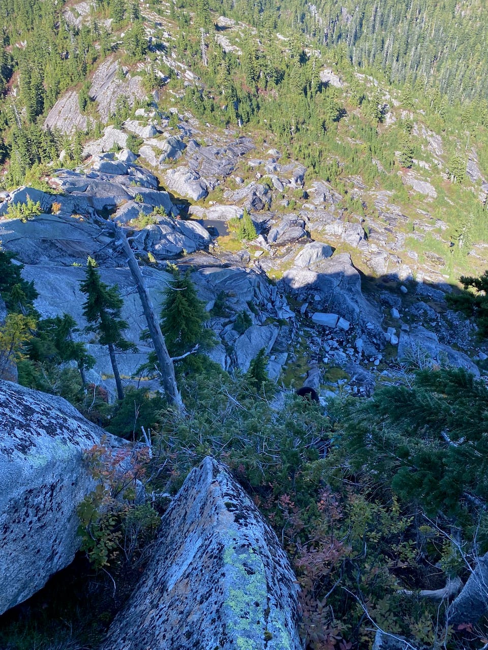We returned to the Indian Arm Trail at a relatively rushed pace. At one point, we climbed down a tree to descend a cliff, and my phone fell out of my pocket. Luckily I retrieved it. The descent to Grand Creek went quickly.