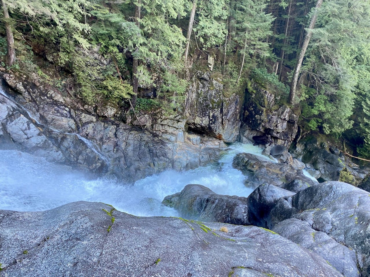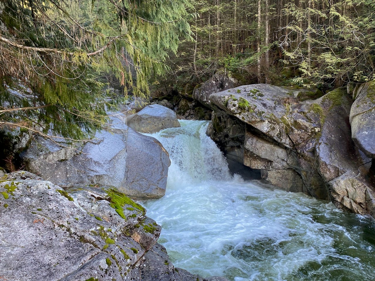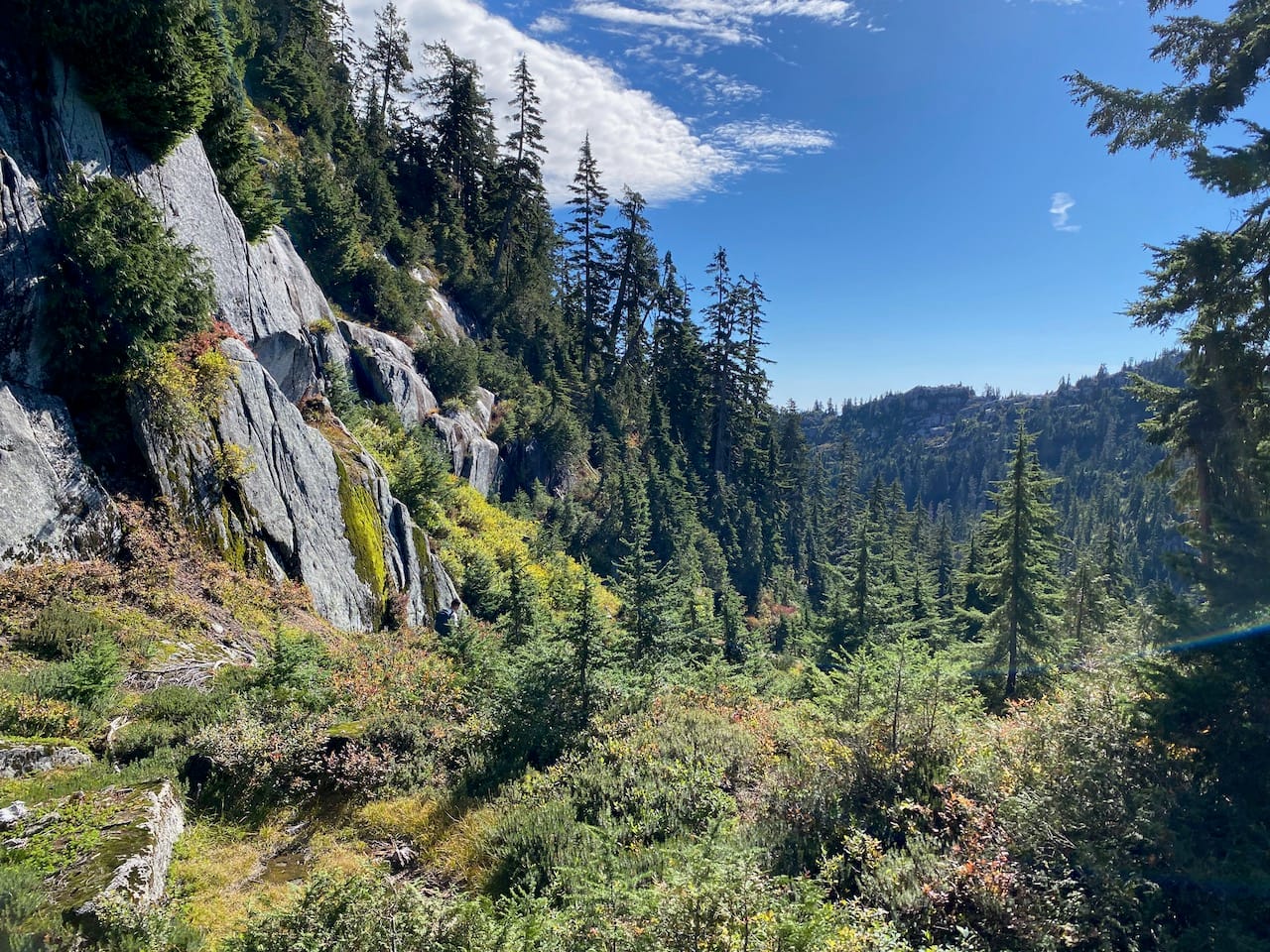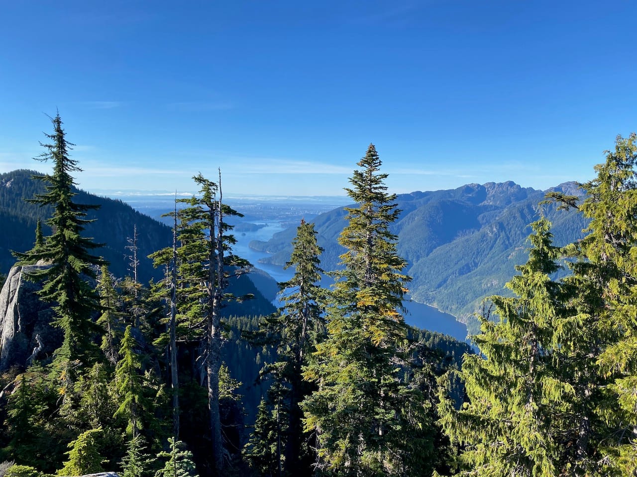 We returned to the Indian Arm Trail at a relatively rushed pace. At one point, we climbed down a tree to descend a cliff, and my phone fell out of my pocket. Luckily I retrieved it. The descent to Grand Creek went quickly.